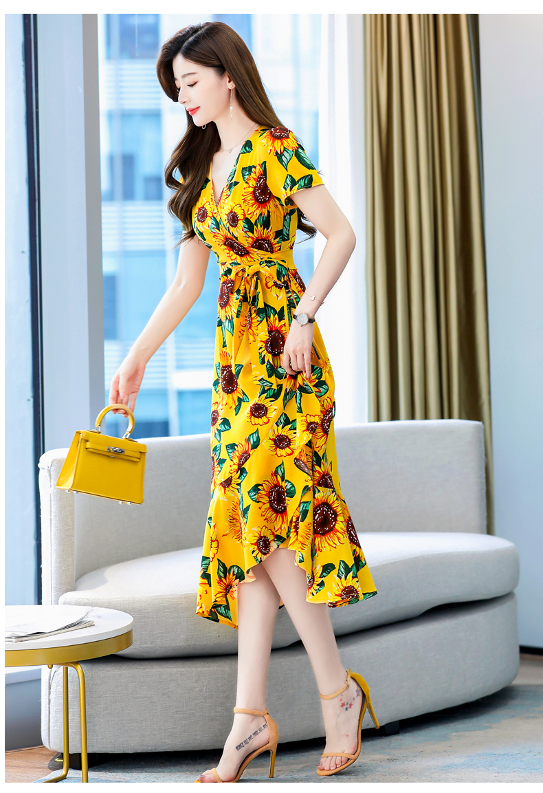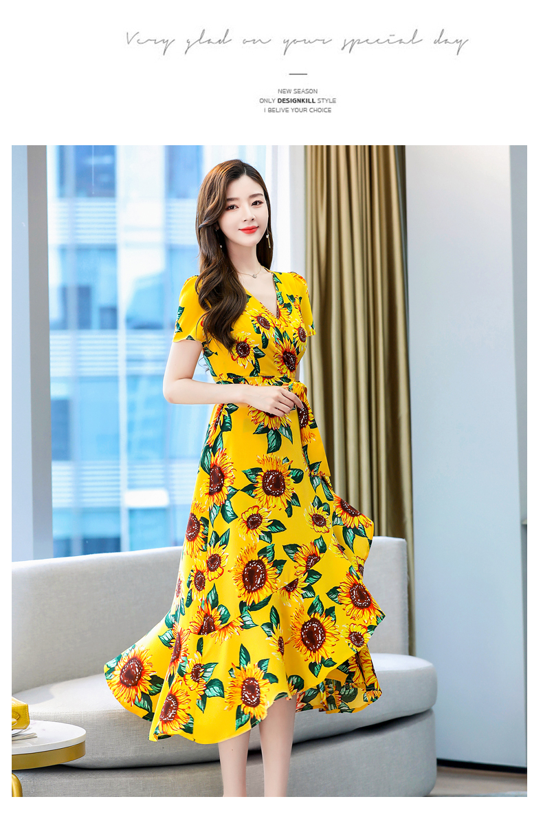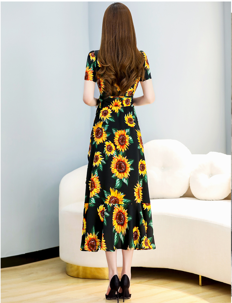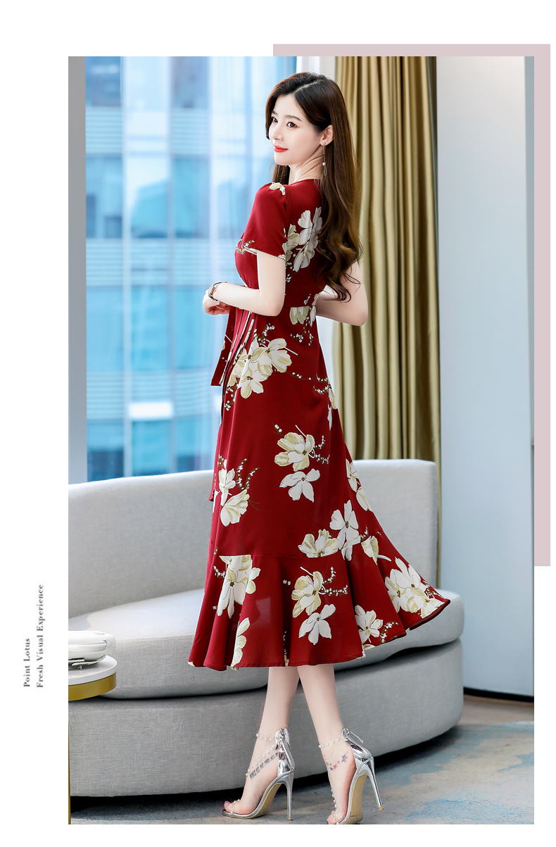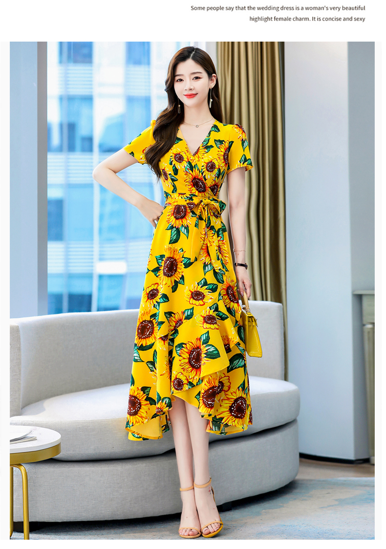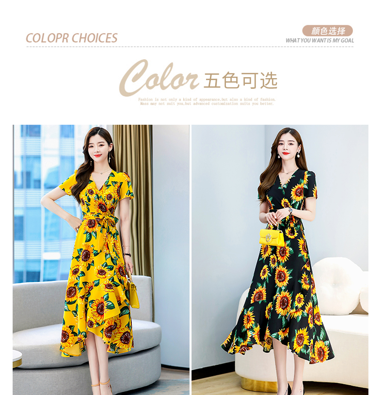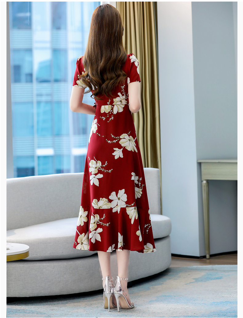 新款花朵连衣裙法式短袖V领雪纺修身高腰显瘦长裙大码HAYR72161