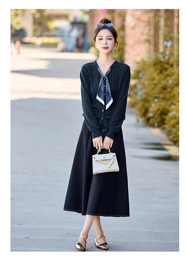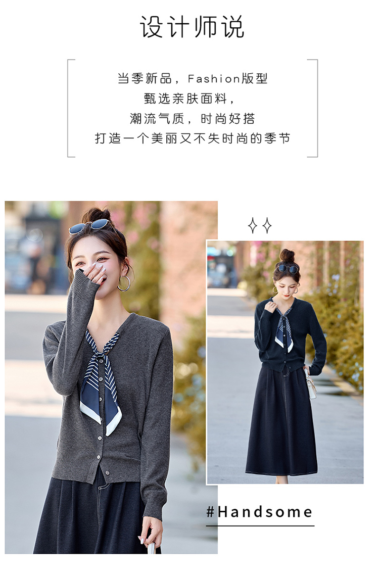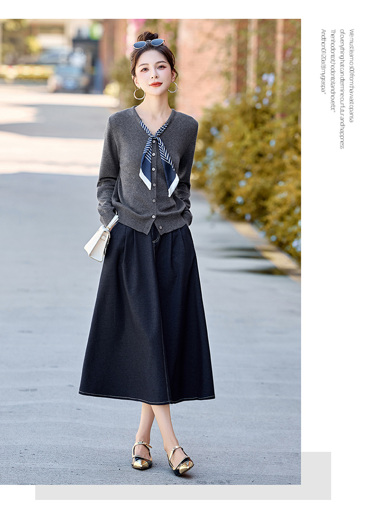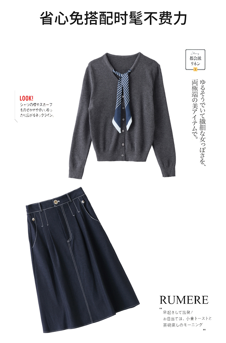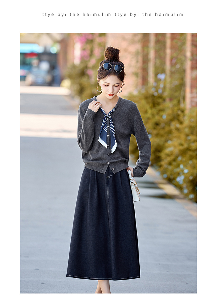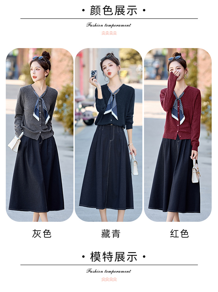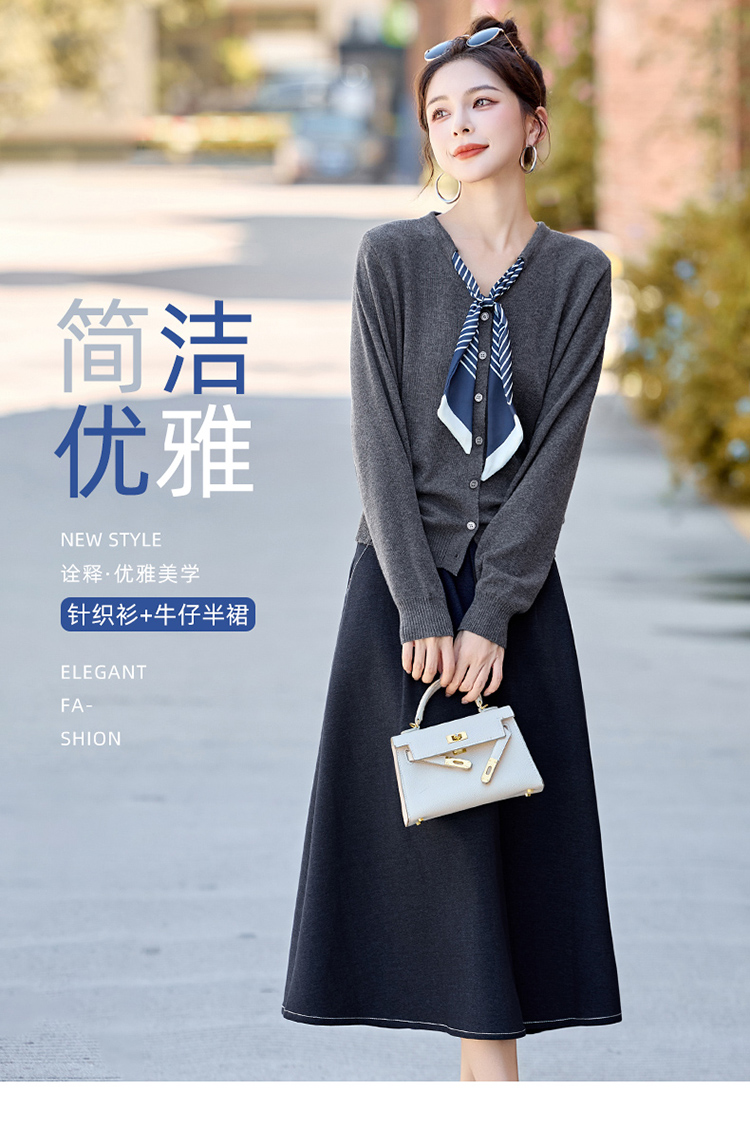 时尚高级感长袖丝巾针织开衫+高腰牛仔半身裙两件套HR-YM7738