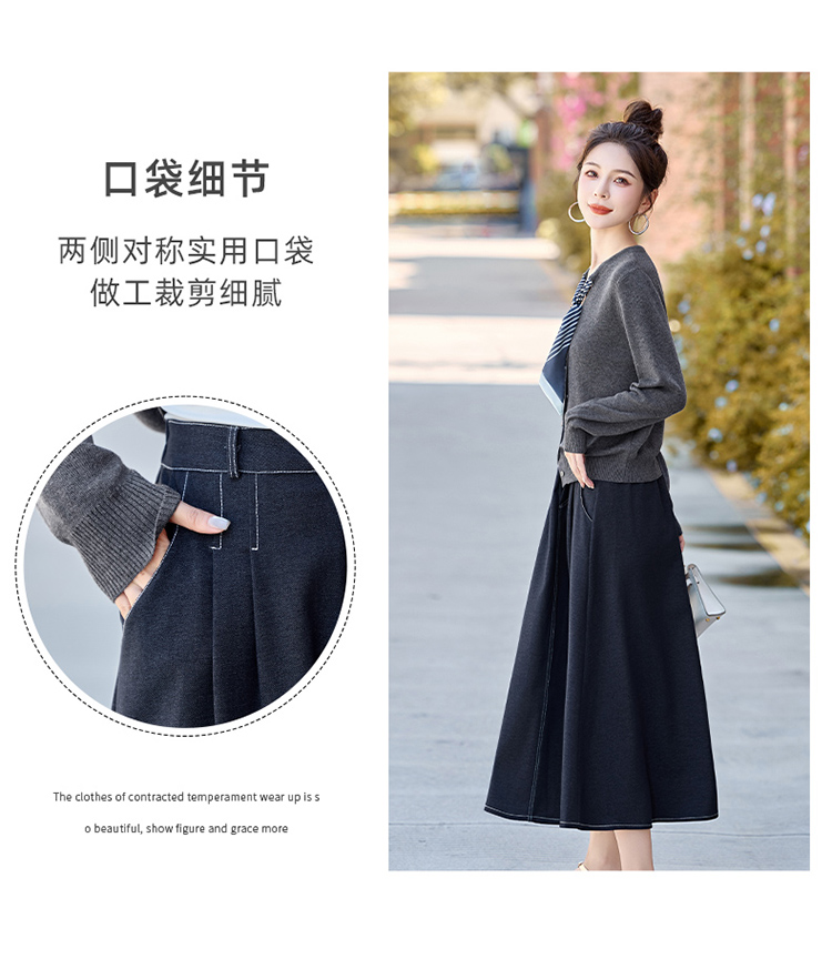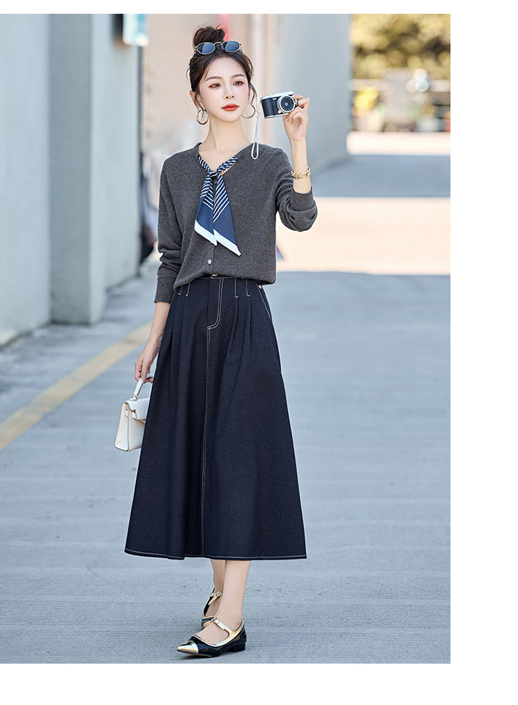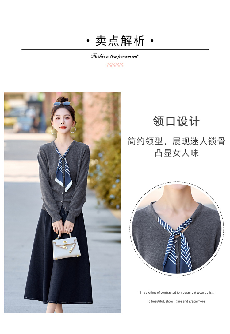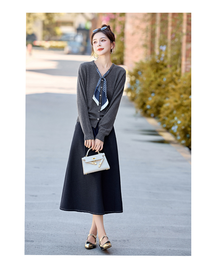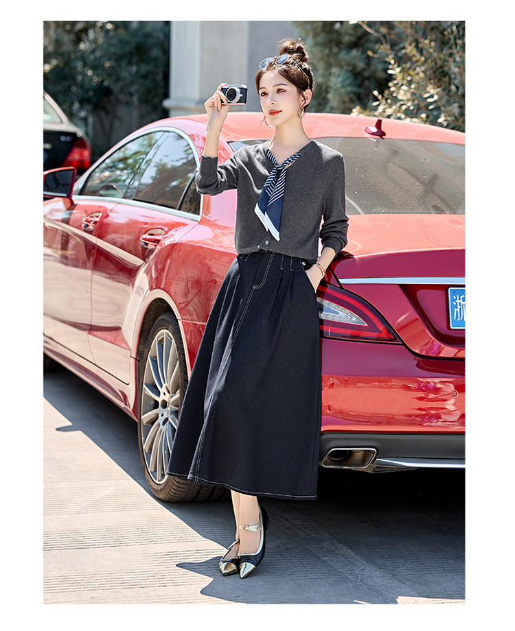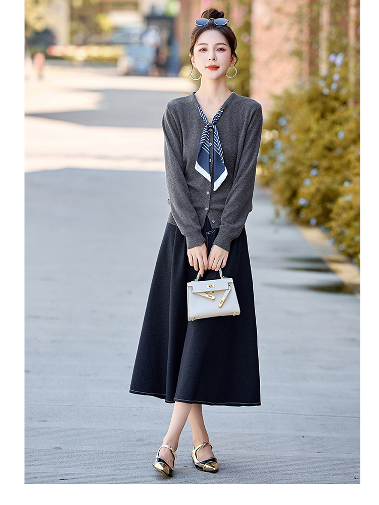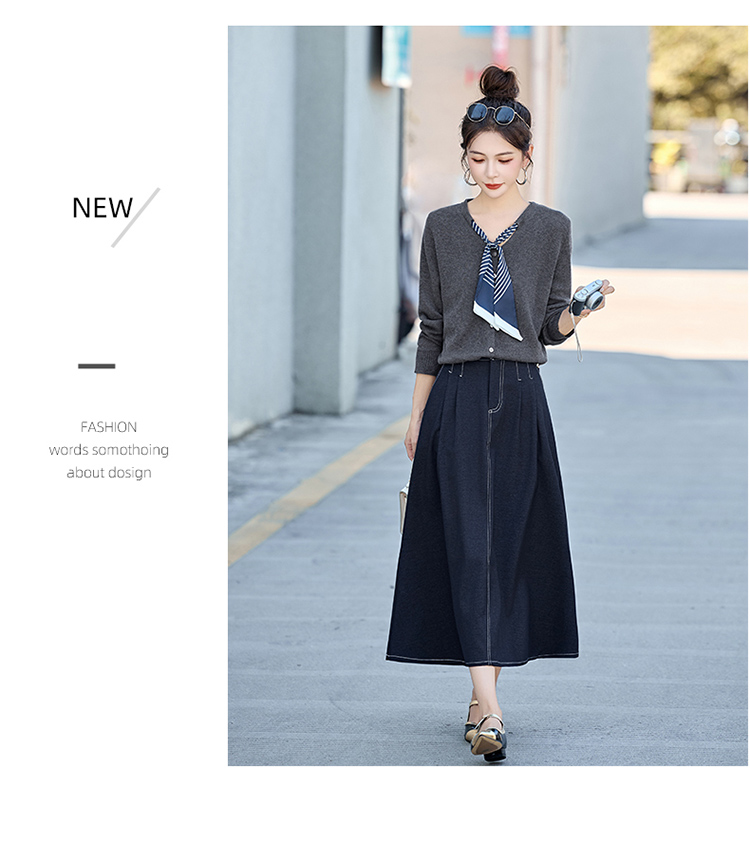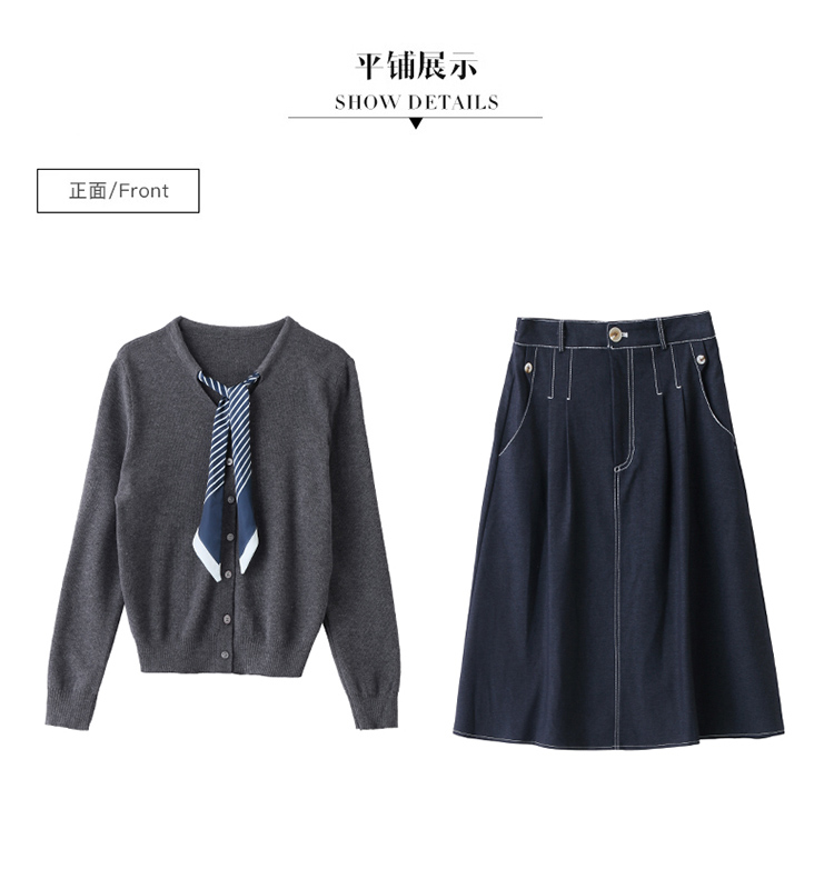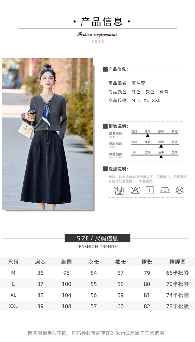 时尚高级感长袖丝巾针织开衫+高腰牛仔半身裙两件套HR-YM7738