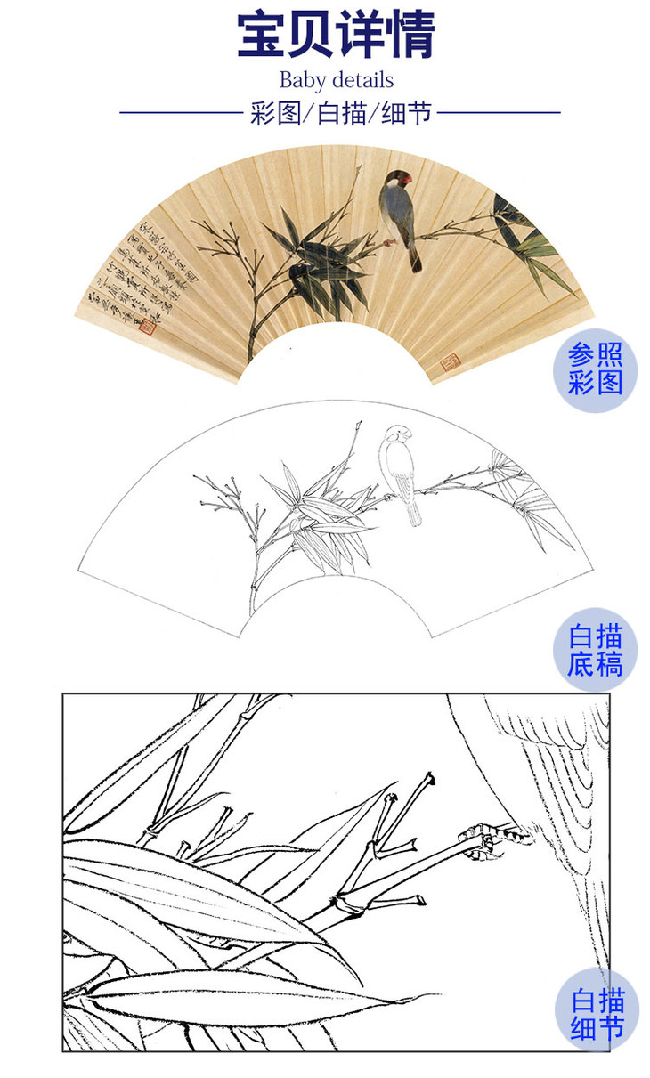 于非闇工笔花鸟白描底稿-扇面小品《竹雀图》-多种白描尺寸可选-YF66