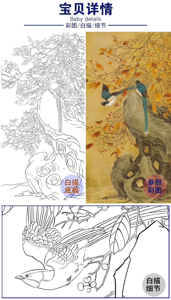宋画花鸟小品白描底稿-佚名《白头丛竹图》-多种白描尺寸可选-GH35