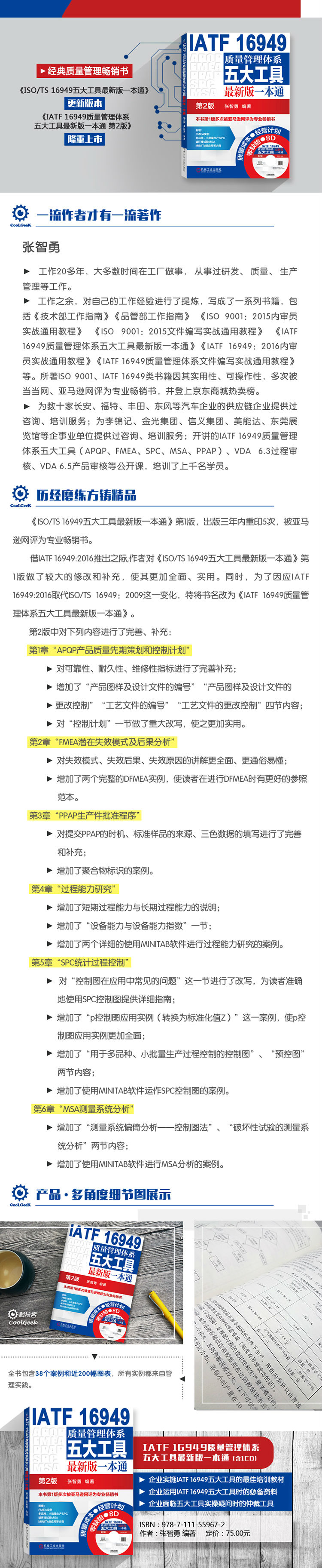 趁IATF 16949:2016推出之际,本作者对《ISO/TS 16949五大工具最新版一本通》第1版做了较大的修改和补充,使其更加全面、实用。同时,为了因应IATF 16949:2016取代ISO/TS 16949:2009这一变化,特将书名改为《IATF 16949质量管理体系五大工具最新版一本通》。