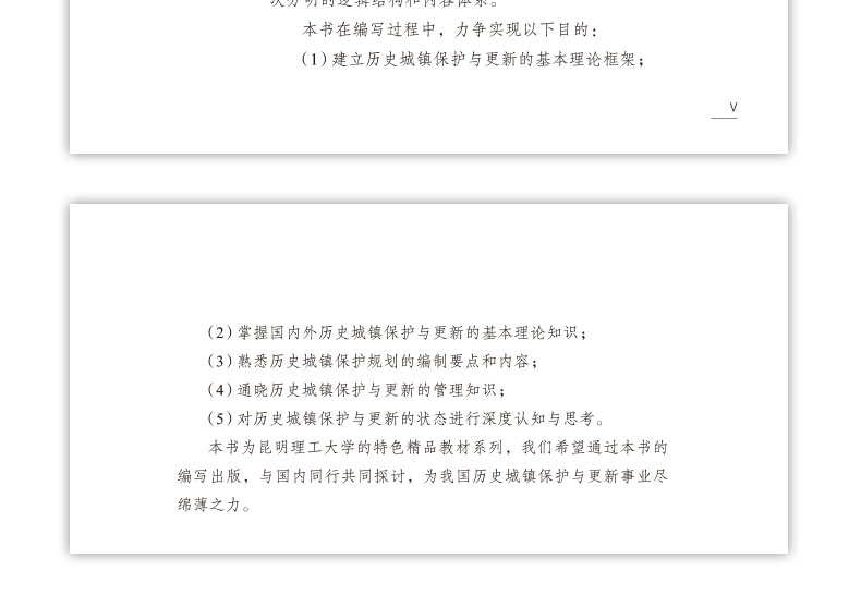 《历史城镇保护与更新》是建筑学、城乡规划学、风景园林学专业教材。通过本教材的学习,应使学生理解历史城镇保护与更新的基本原理,掌握相关的专业知识和信息技术方法,能够运用原理和方法解决保护规划实施和管理中的普遍性问题。同时,引导学生对历史城镇保护与更新的状态进行深度认知与思考。 通过课程的讲授和训练,力争达到以下教学目的: (1)建立历史城镇保护与更新的基本理论框架; (2)掌握国内外历史城镇保与更新的基本理论知识; (3)熟悉历史城镇保护规划的编制要点和内容; (4)通晓历史城镇保护与更新的管理知识; (5)对历史城镇保护与更新的状态进行深度认知与思考。
