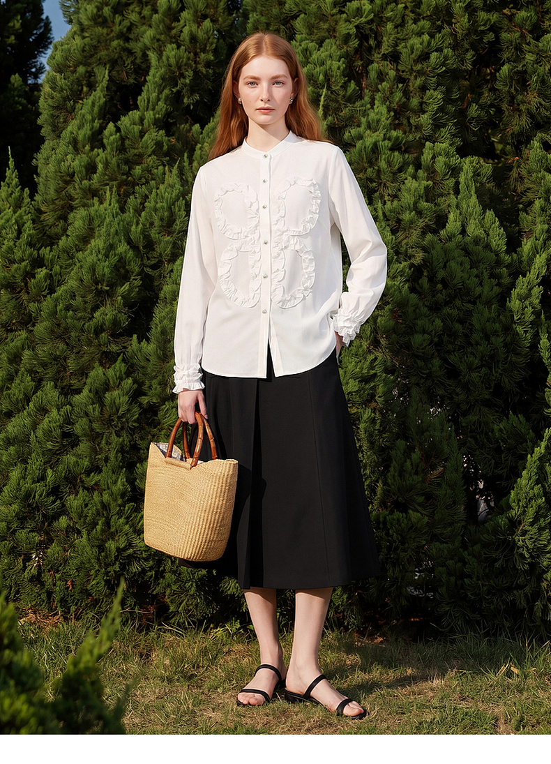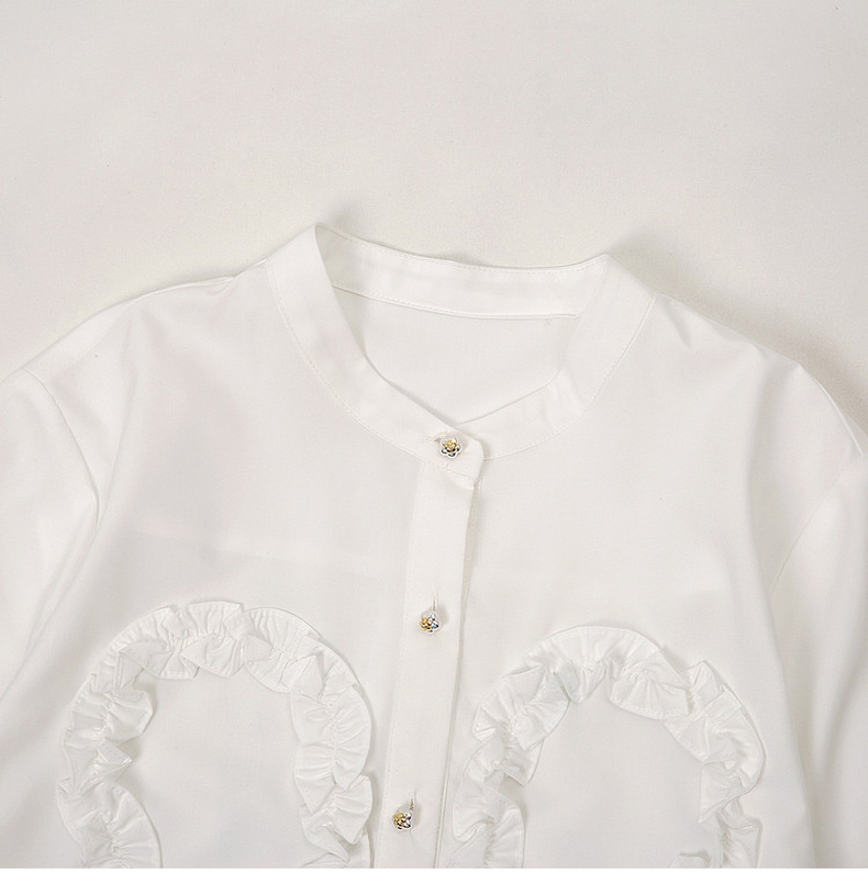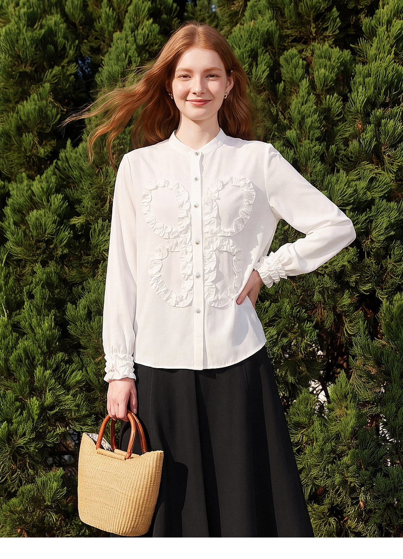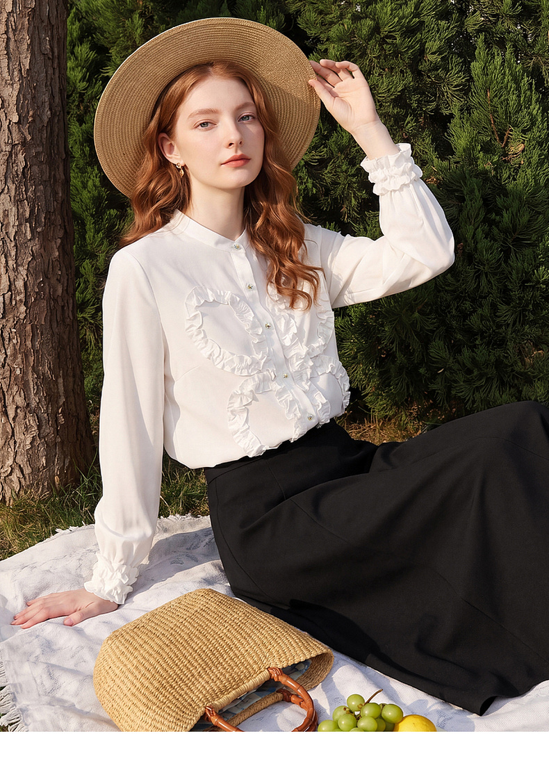 天猫同步【轻奢!法式花边】拉夏贝尔/La Chapelle法式立领轻奢排扣通勤长袖衬衫简约净版气质上衣