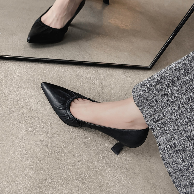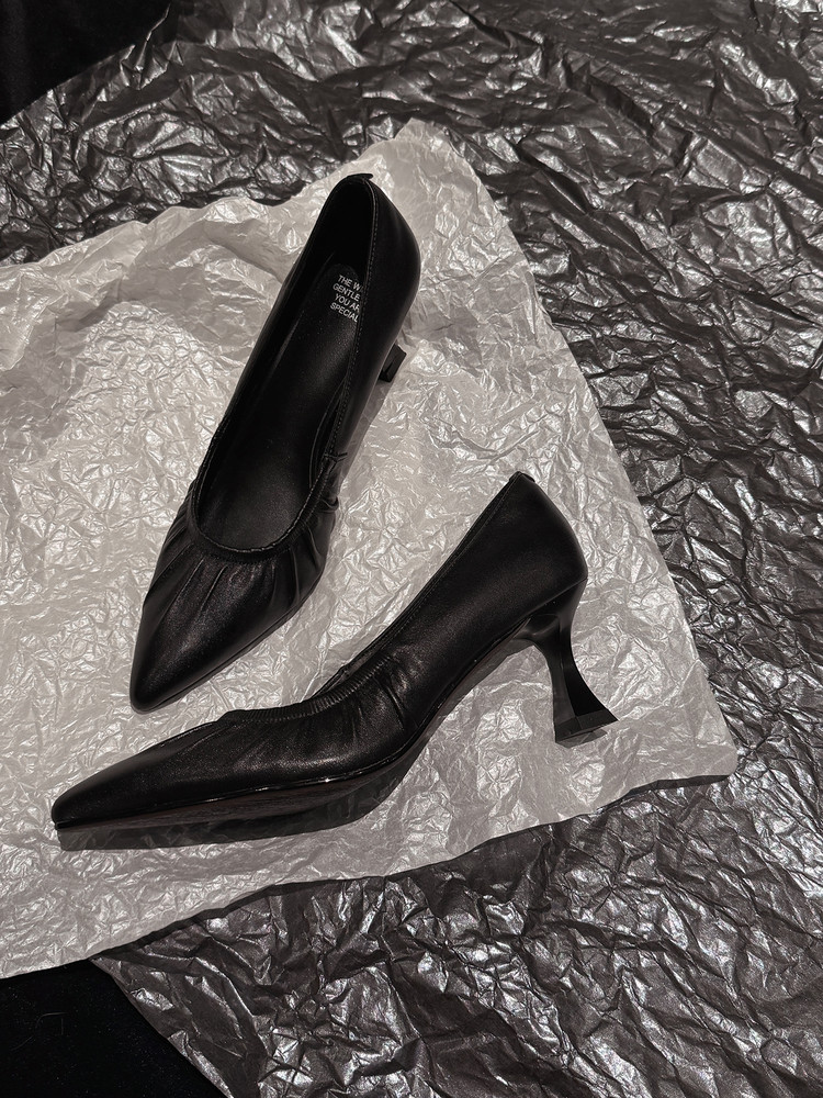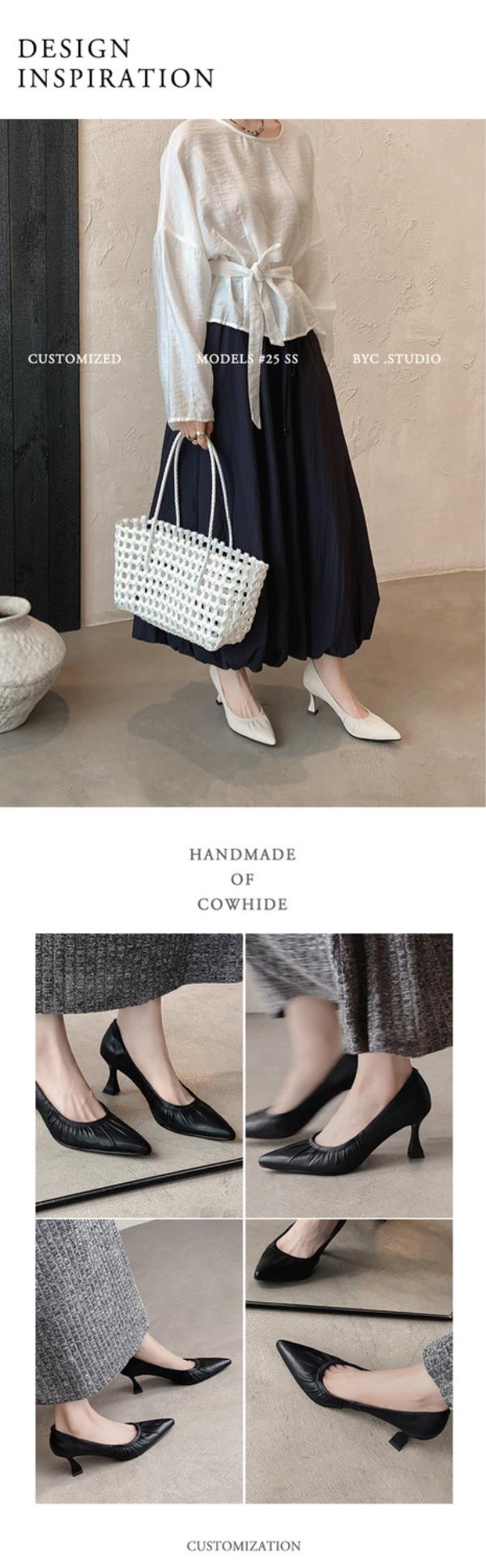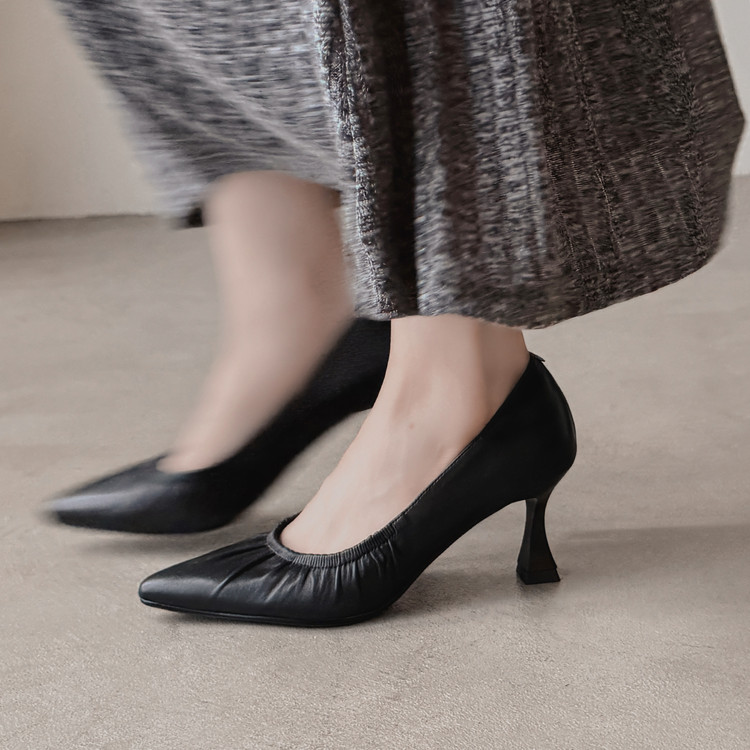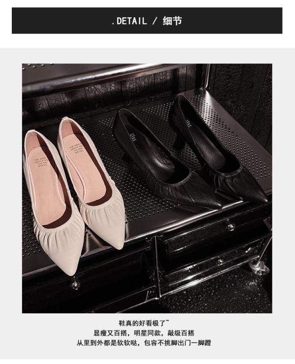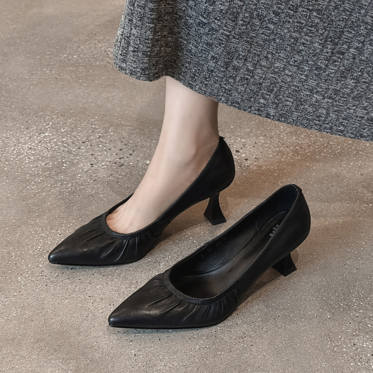 【预售5天】通勤细跟黑色工作鞋秋新款巨软牛皮尖头褶皱高跟鞋DYJ&CX7999-1