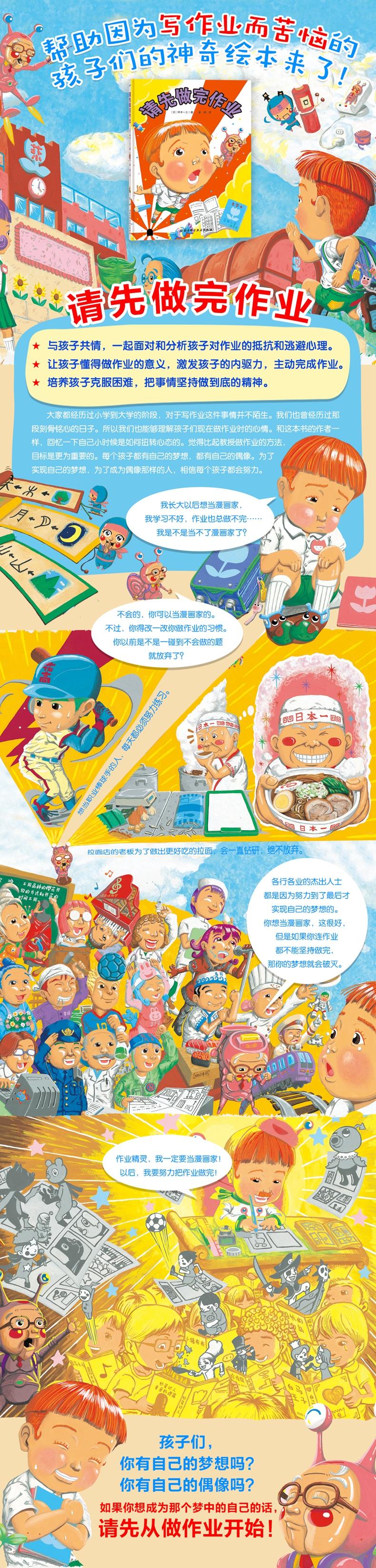 迟关学因为没有做作业被老师批评,孤独的迟关学非常伤心。正在这个时候,突然出现了一位作业精灵。他很能理解迟关学的心情,但他也耐心地向迟关学提出了做作业的意义,那就是:虽然你可能有这样那样的梦想,但一个连作业都无法完成做到底的人,是无法在自己的梦想的道路上坚持下去的。在作业精灵的帮助下迟关学完成了作业,向着成为漫画家的梦想又前进了一步。