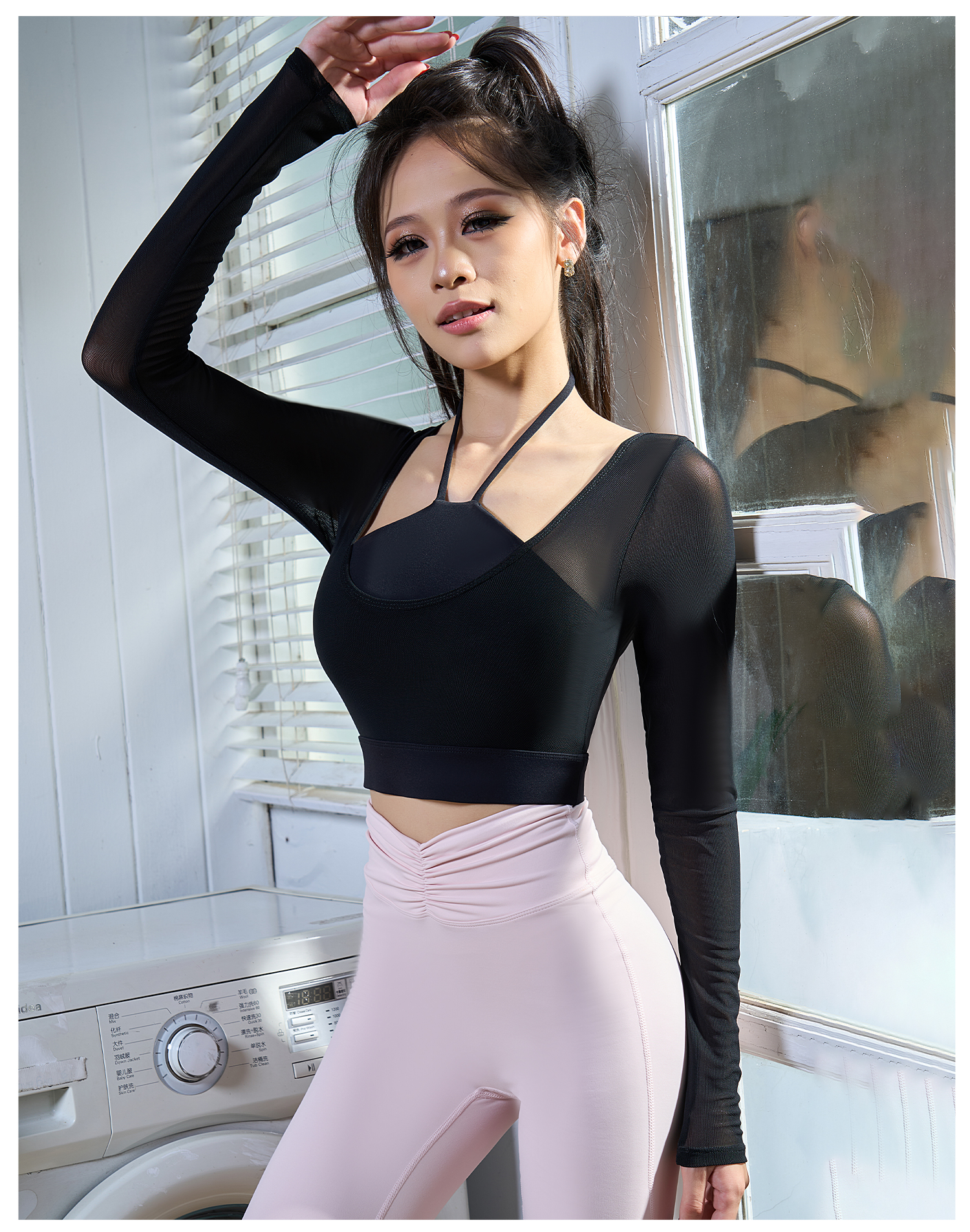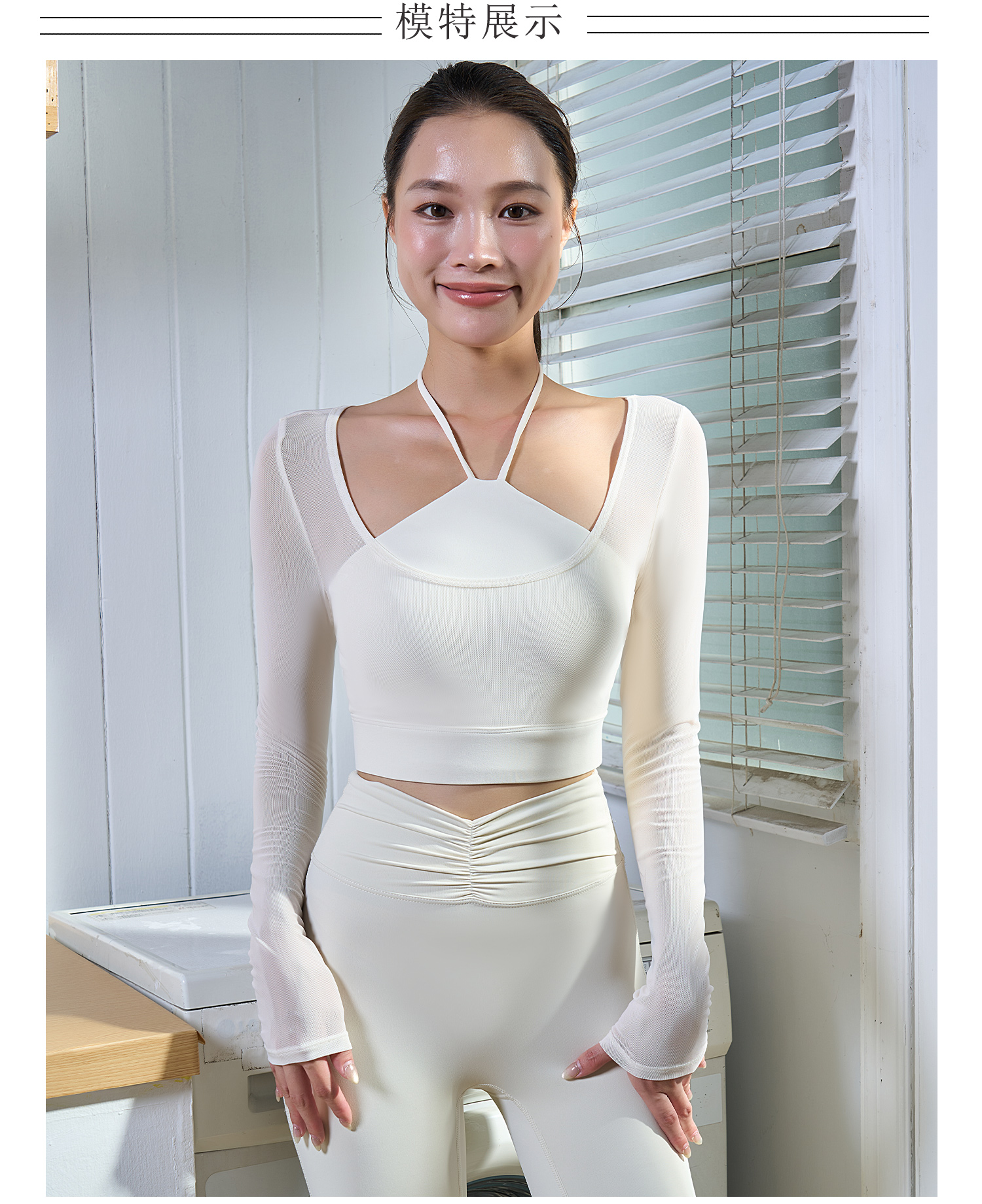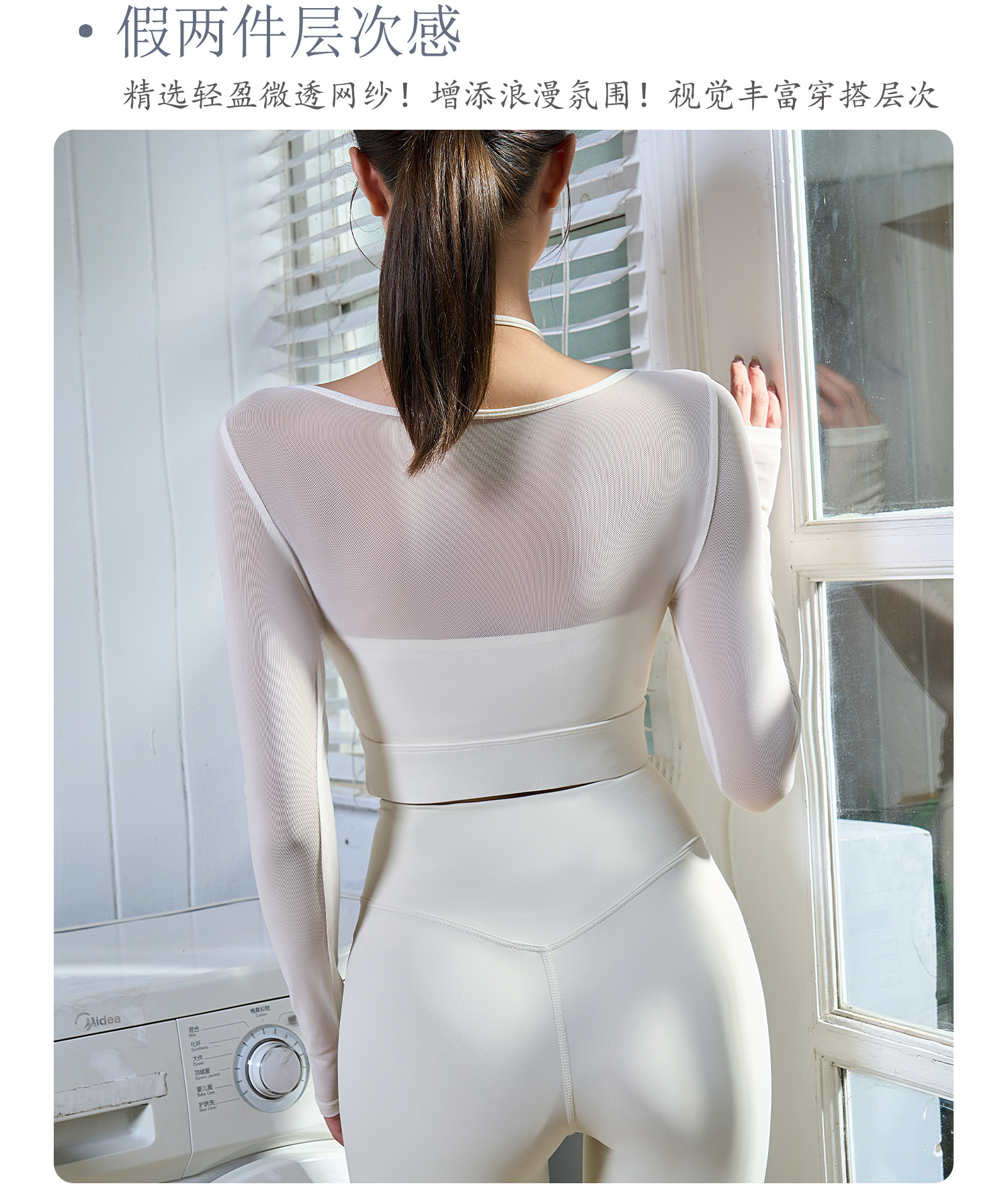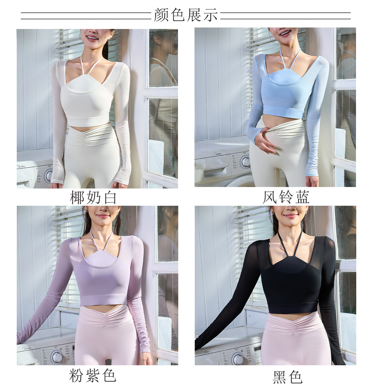 【限时秒】YOGACODE【火树银花系列】假两件网纱长袖瑜伽服固定杯短款挂脖运动文胸一体式DWT125657