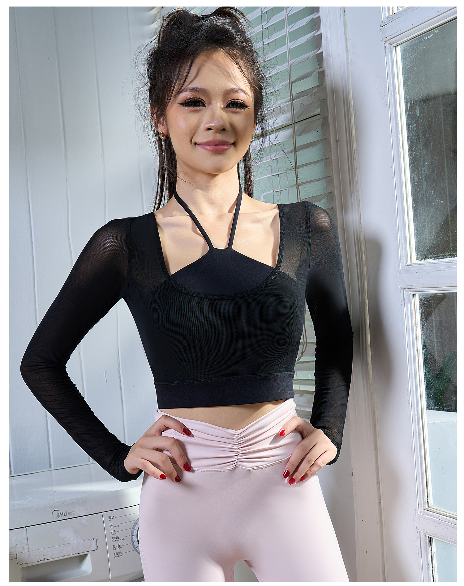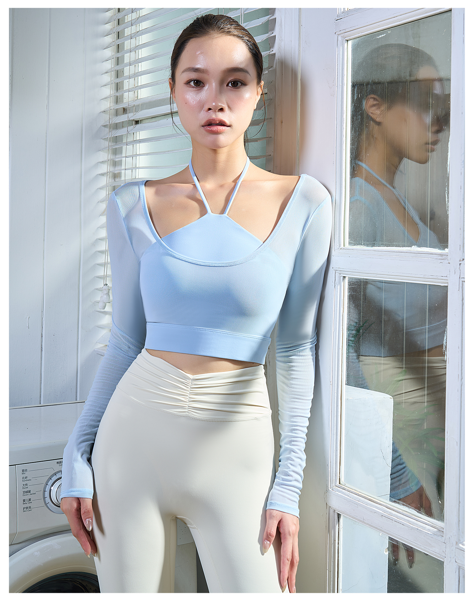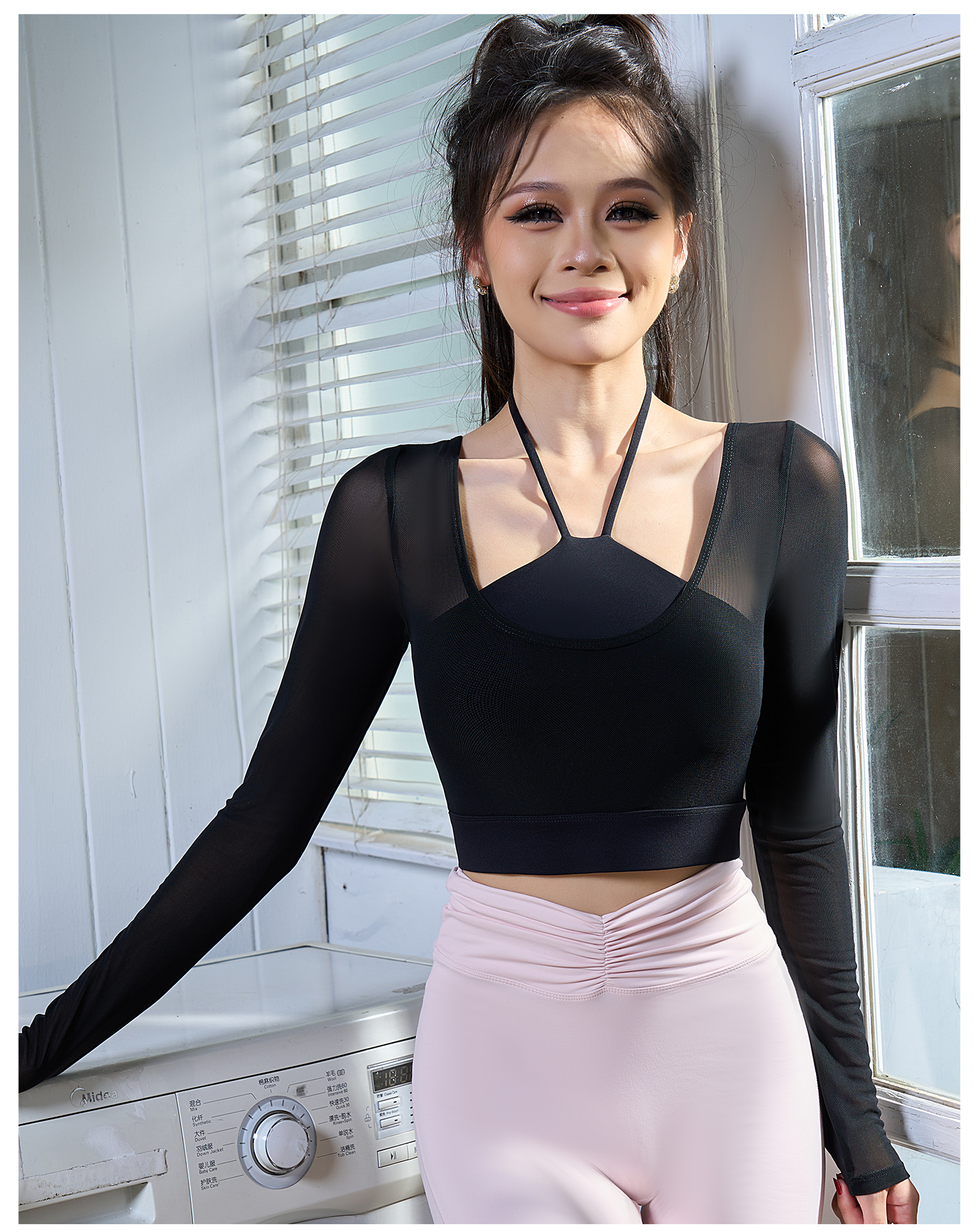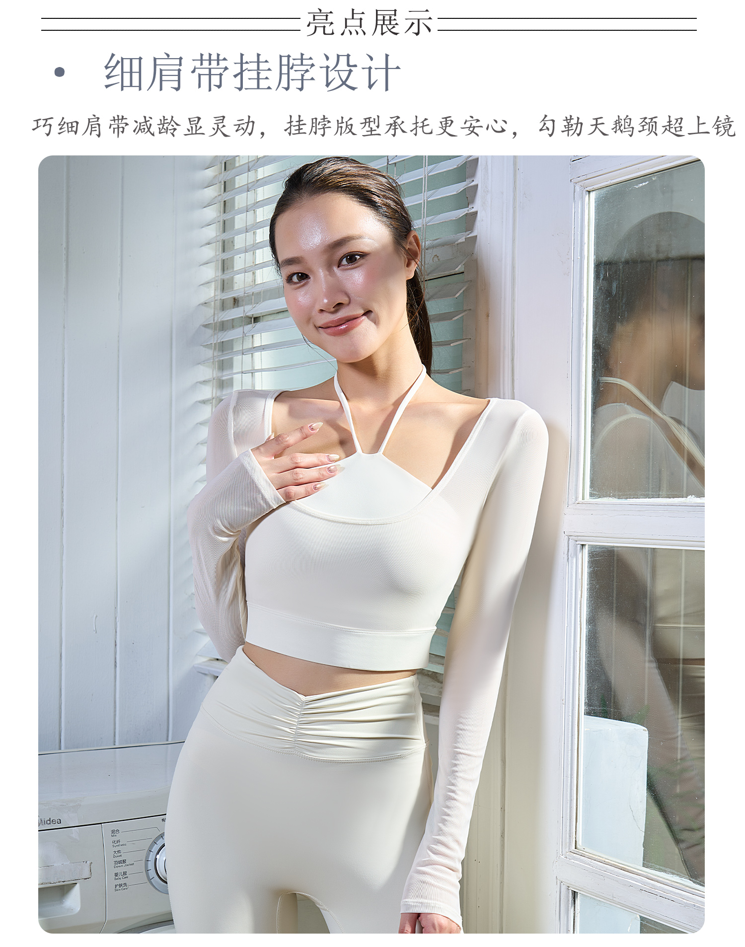 【限时秒】YOGACODE【火树银花系列】假两件网纱长袖瑜伽服固定杯短款挂脖运动文胸一体式DWT125657