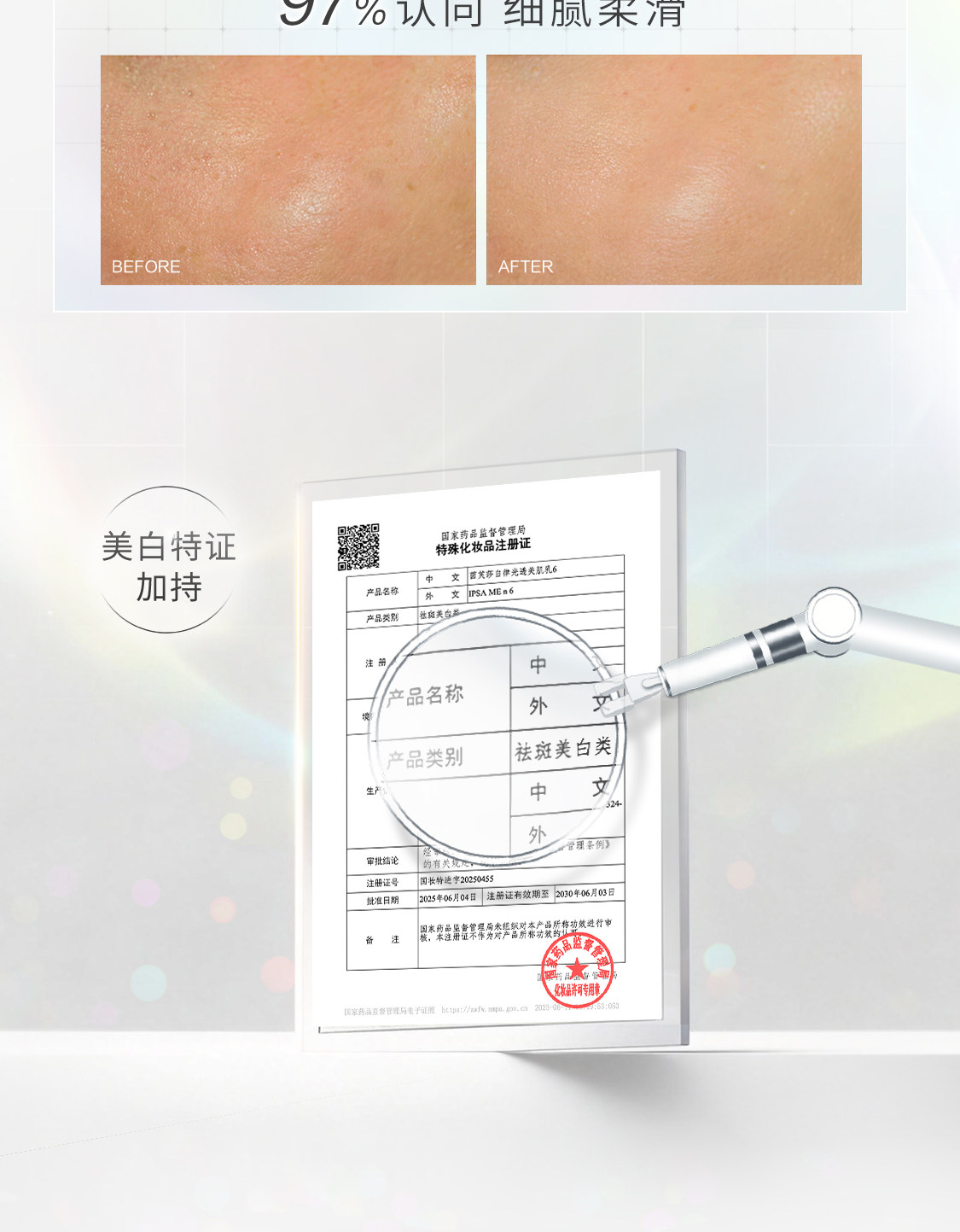 国家药监局提示您:宣称用于祛斑美白、防晒、染发、烫发等的化妆品为特殊用途化妆品,产品标签上应标注‘国妆特字’或者‘国妆特进字’的批准文号