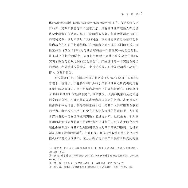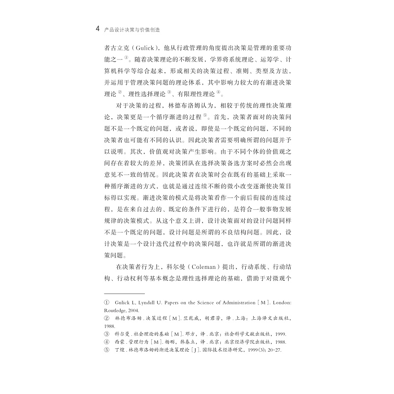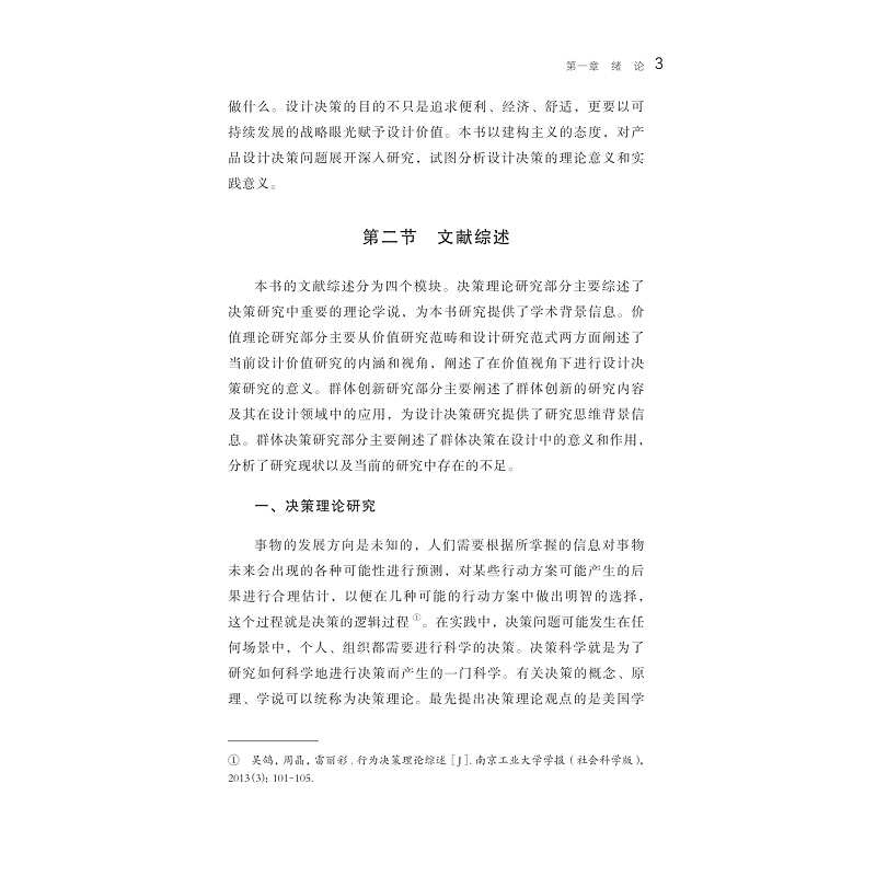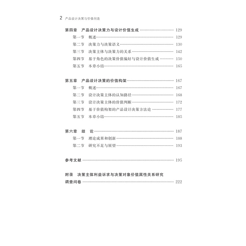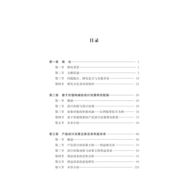 本书为作者的博士学位论文。书稿分为五章:第一章,绪论。通过对决策理论、价值理论、群体创新和群体决策的研究,提出了本书的研究问题,阐明了本书的研究意义。第二章,基于价值构架的设计决策研究框架。通过调研分析对产品设计价值属性行了细致分析。第三章,产品设计决策主体及其利益诉求。通过访谈实验和实证研究对利益诉求进行了定性和定量研究,对六类决策主体的利益诉求进行了测度。第四章,产品设计决策力与设计价值生成。通过案例分析,用语义表征了决策力,分析了决策力对设计迭代的作用。第五章,产品设计决策的价值构架。提出了基于价值构架的产品设计决策方法论框架及其应用拓展。
