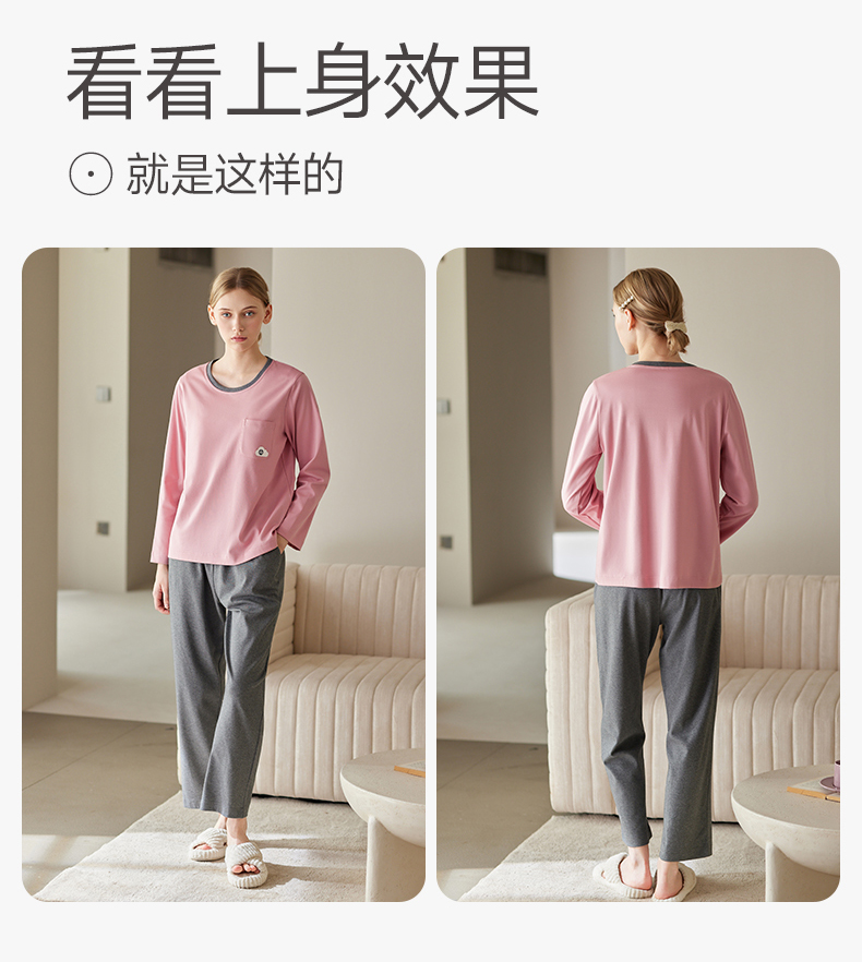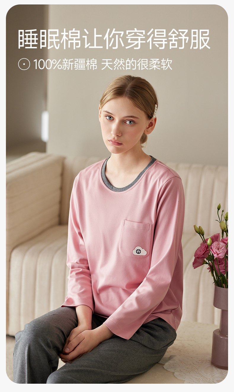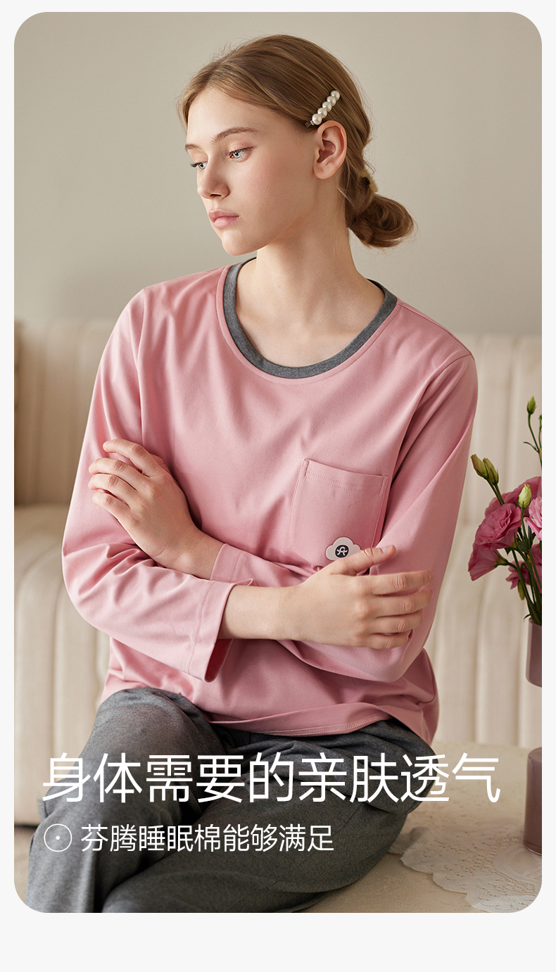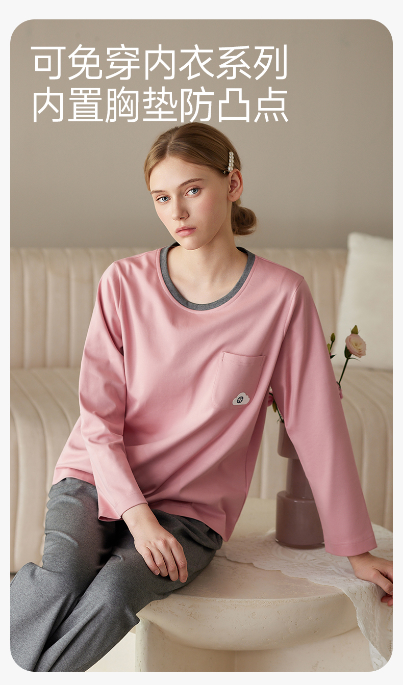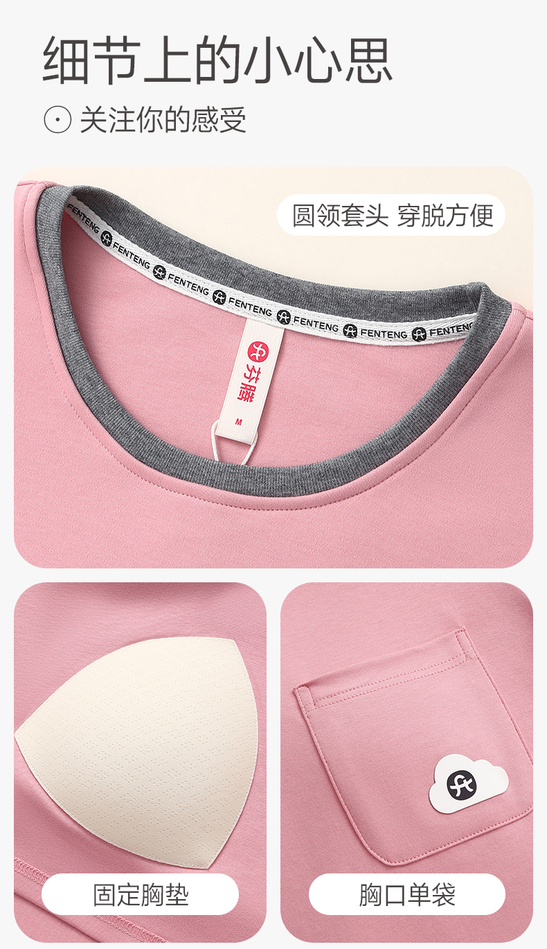 芬腾防凸点女士睡衣春秋季带胸垫纯棉长袖套装休闲加大码家居服