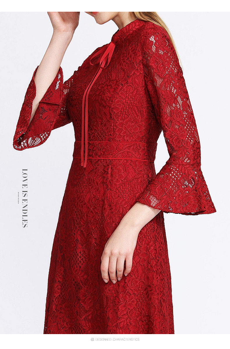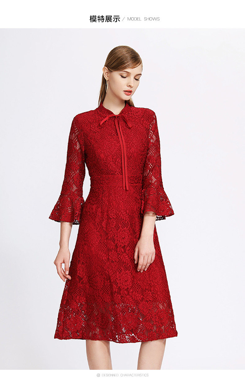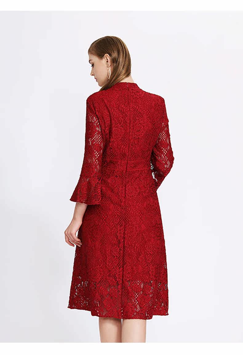 EITIE爱特爱女装早秋系领蕾丝镂空勾花喇叭袖大红连衣裙C1807150