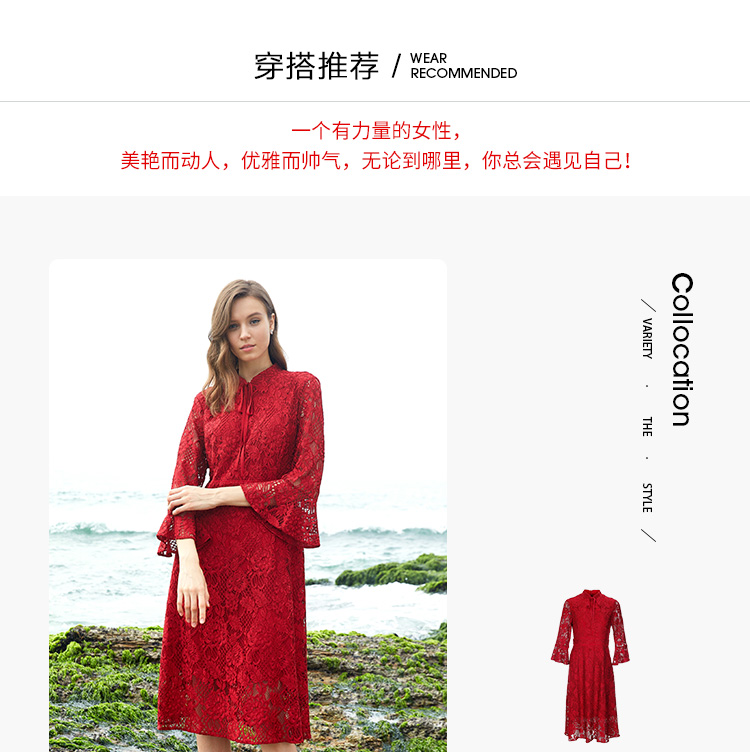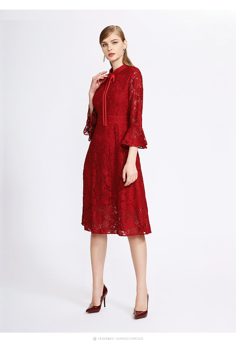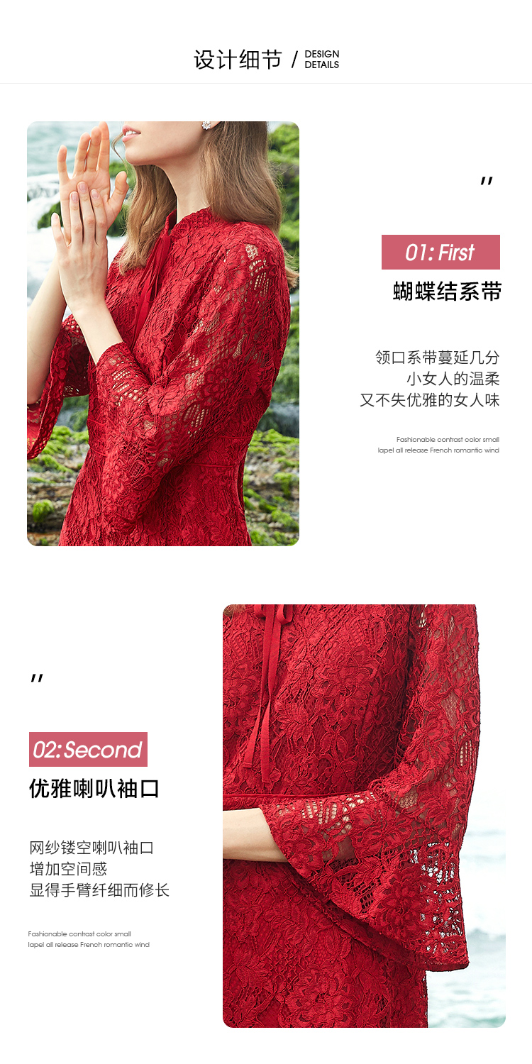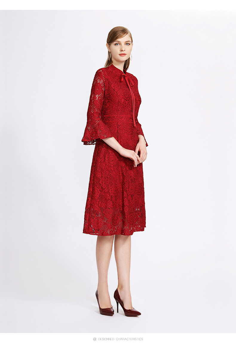 EITIE爱特爱女装早秋系领蕾丝镂空勾花喇叭袖大红连衣裙C1807150