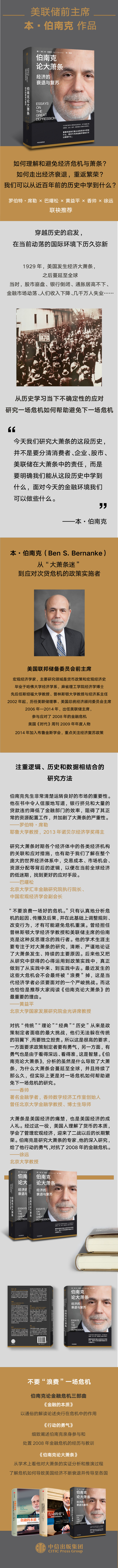 伯南克论金融危机三部曲,《金融的本质》以通俗的解读论述央行在危机中的作用,《行动的勇气》细致阐述了伯南克亲身参与和处置2008年金融危机的经历与教训,《伯南克论大萧条》,则可以清晰地从学术上看他对大萧条的实证分析和推演过程,了解危机如何导致美国经济不断衰退并传导至各国。