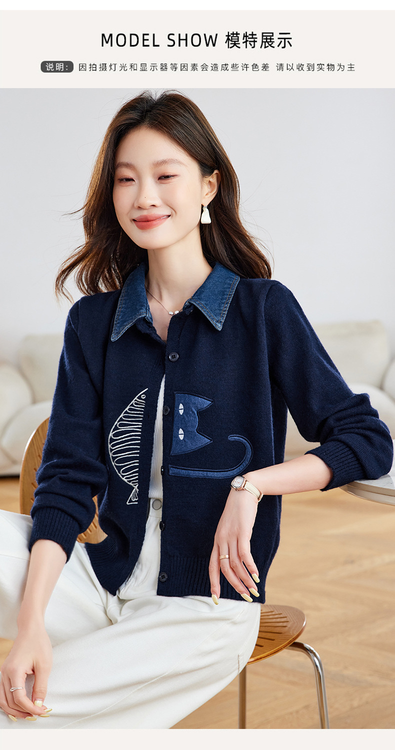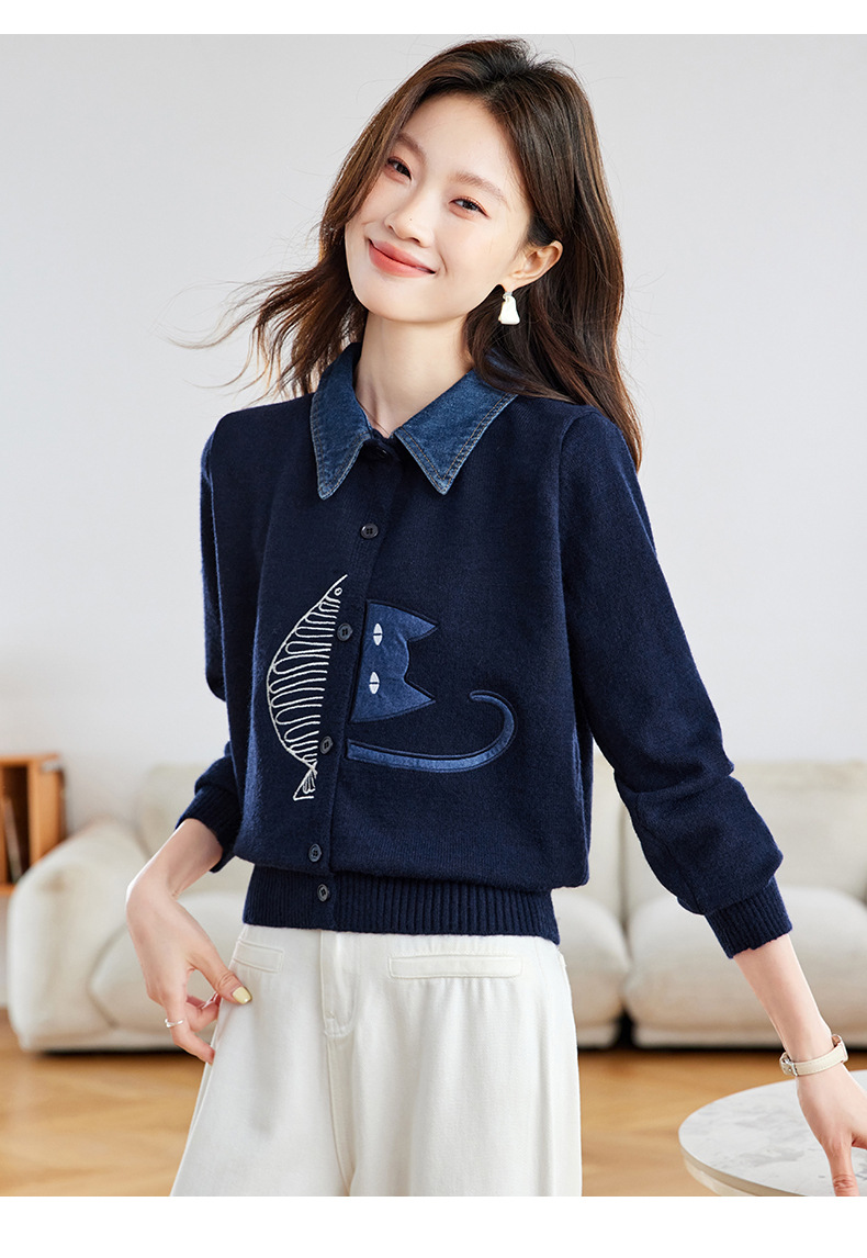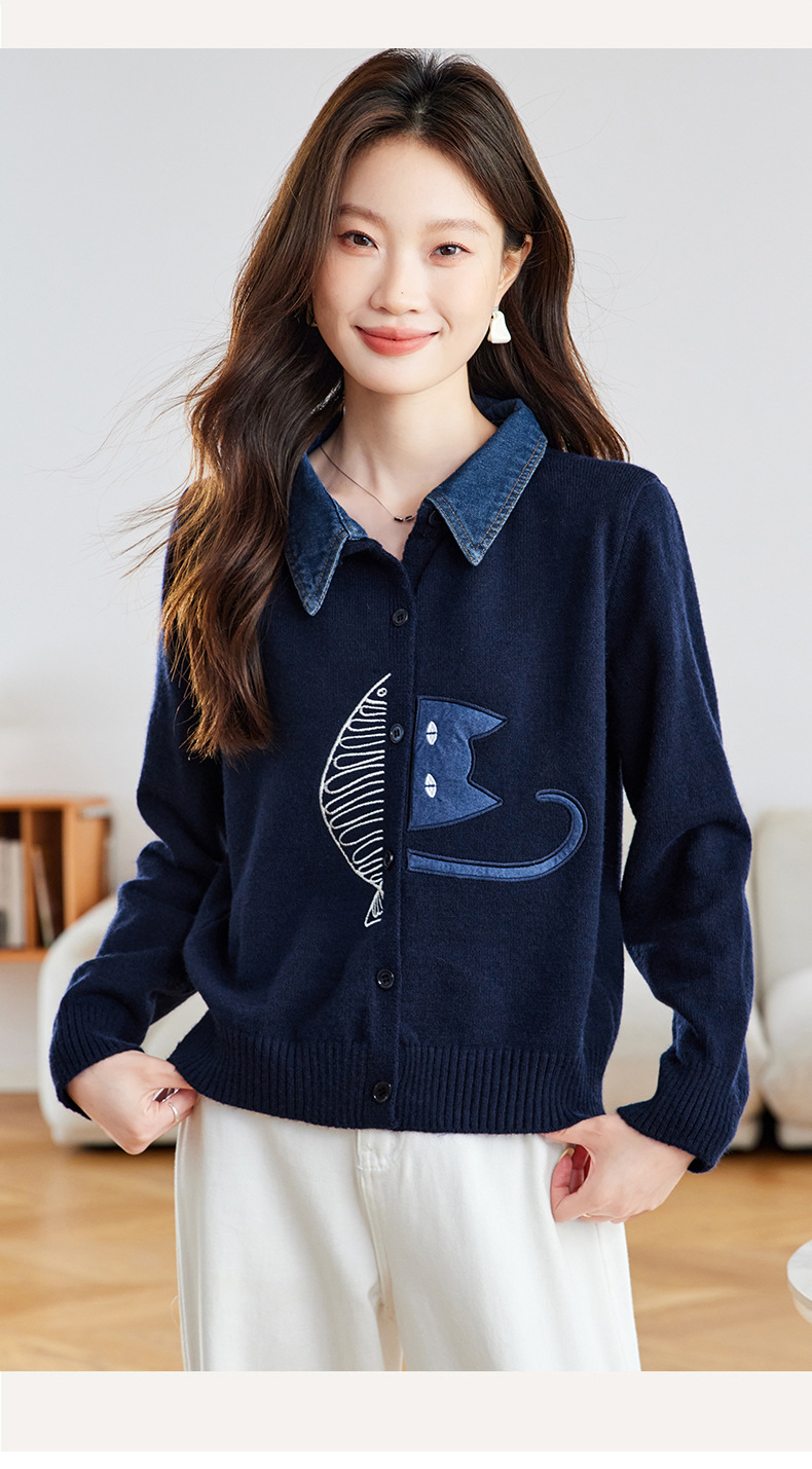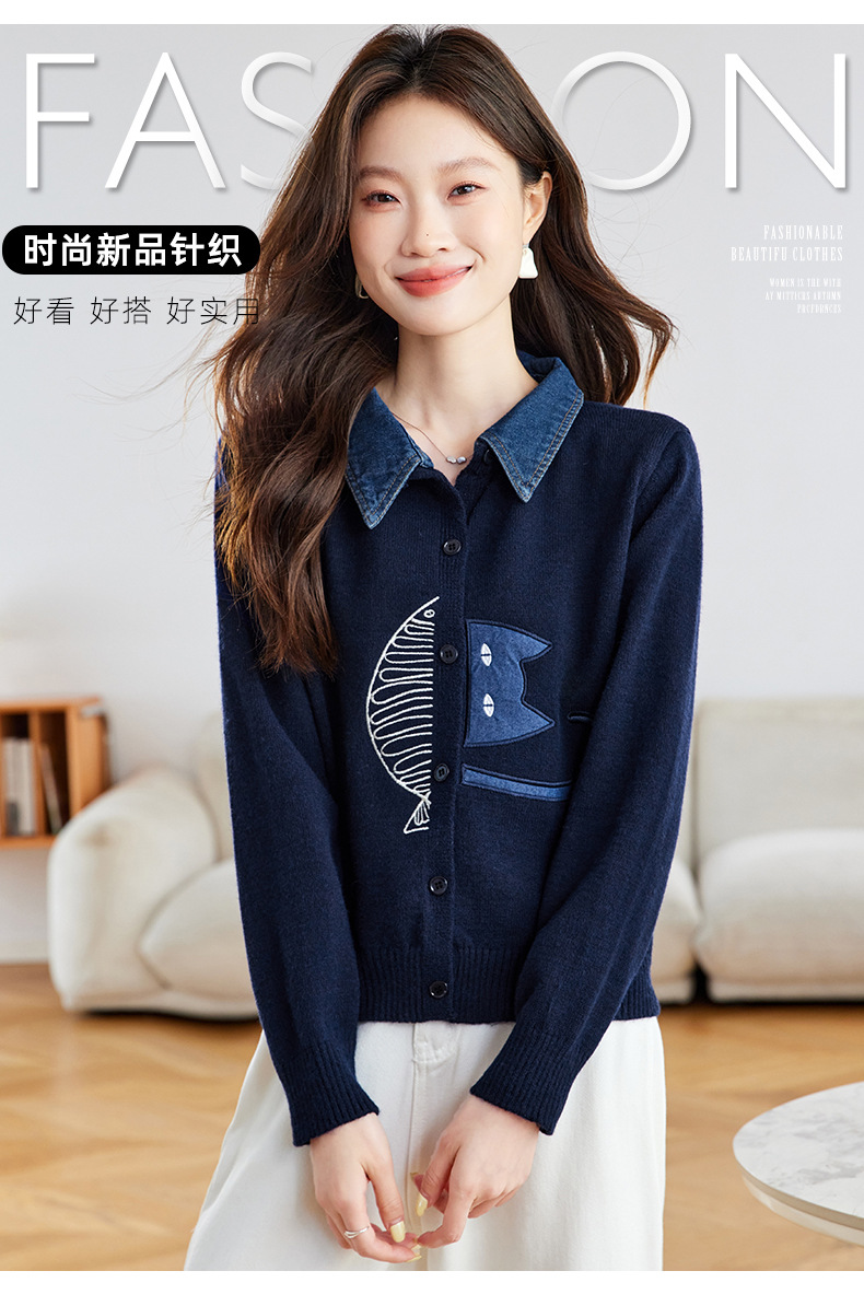 CC牛仔拼接衬衫领针织开衫女春秋2025新款翻领刺绣毛衣外套短款外搭