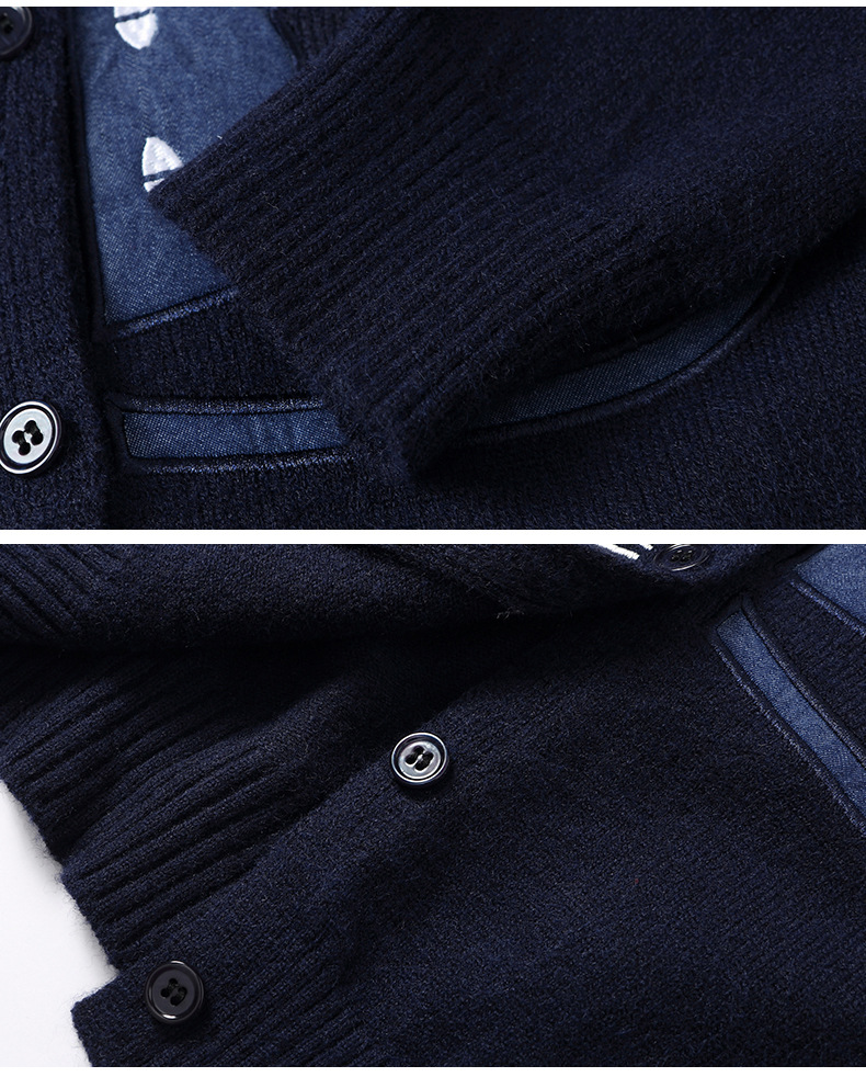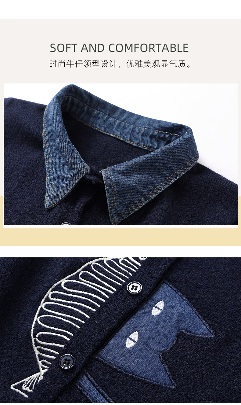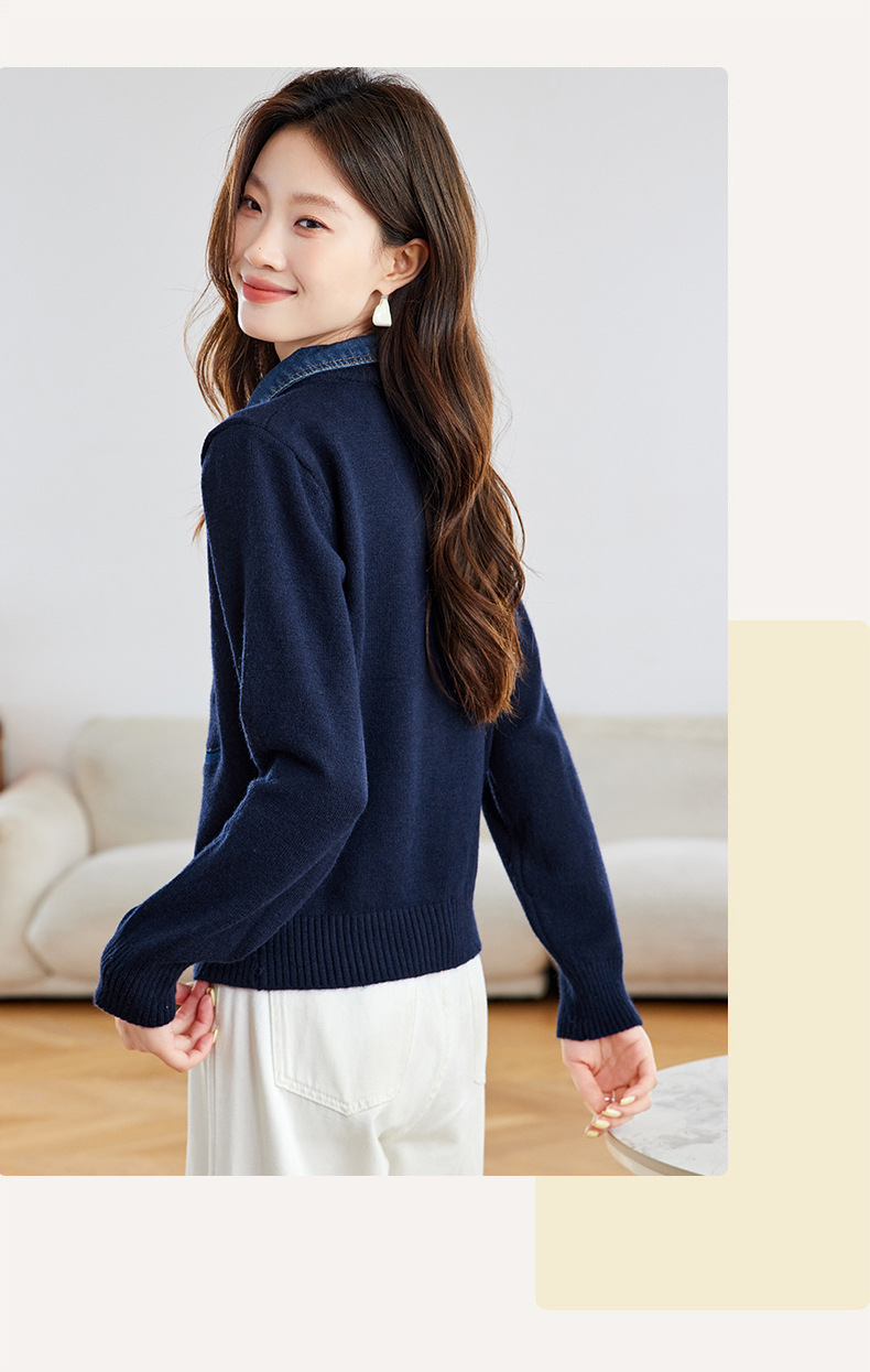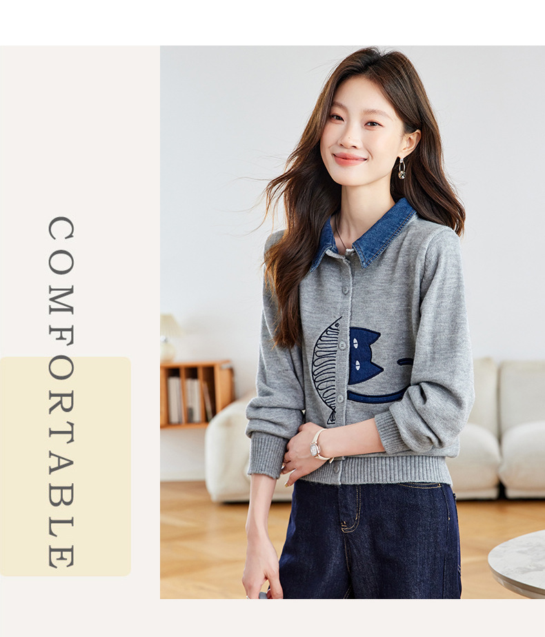 CC牛仔拼接衬衫领针织开衫女春秋2025新款翻领刺绣毛衣外套短款外搭