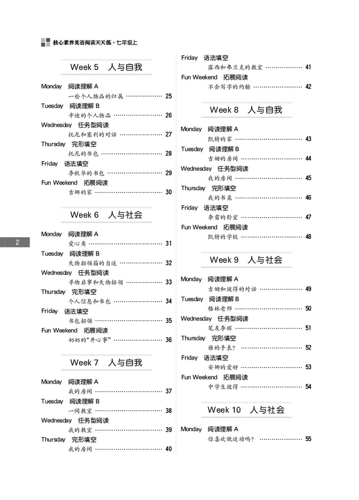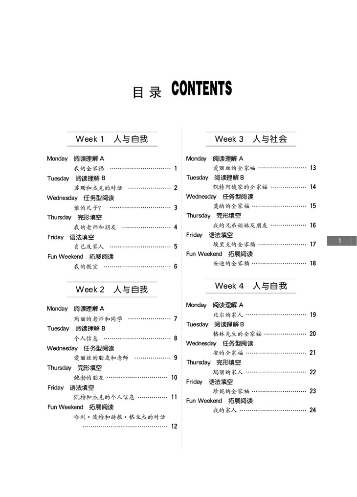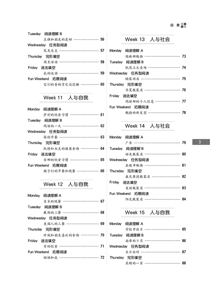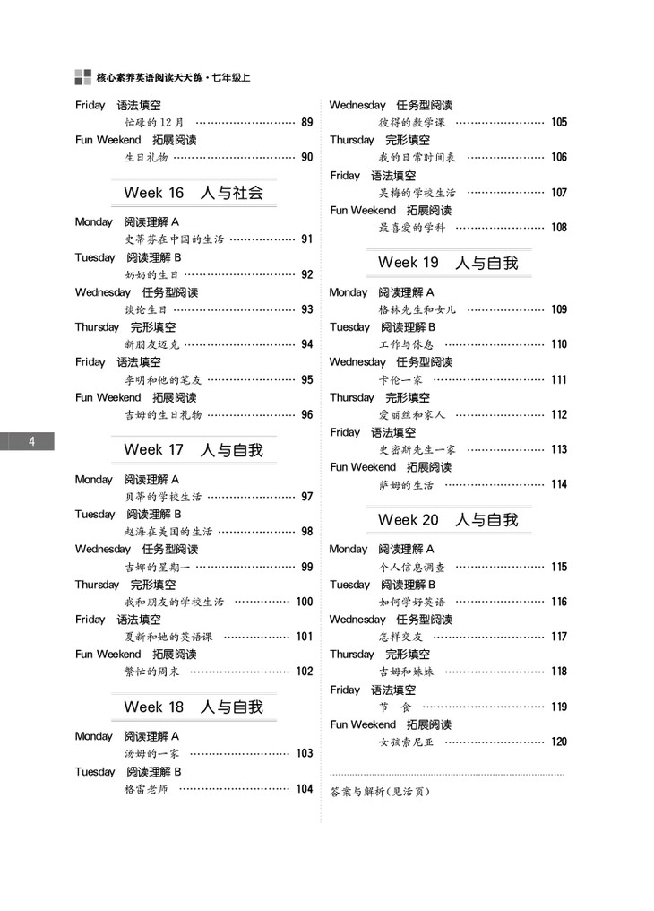 本丛书依据《英语课程标准》编写,以英语学科核心素养为宗旨,融入了“人与自我”、“人与社会”和“人与自然”三大主题语境,细目围绕中考涉及的24个话题选材。全书共20周,每周五天训练加一篇周末拓展阅读,囊括了阅读理解、任务型阅读、完形填空、语法填空等语篇题型, 循序渐进,步步深入。