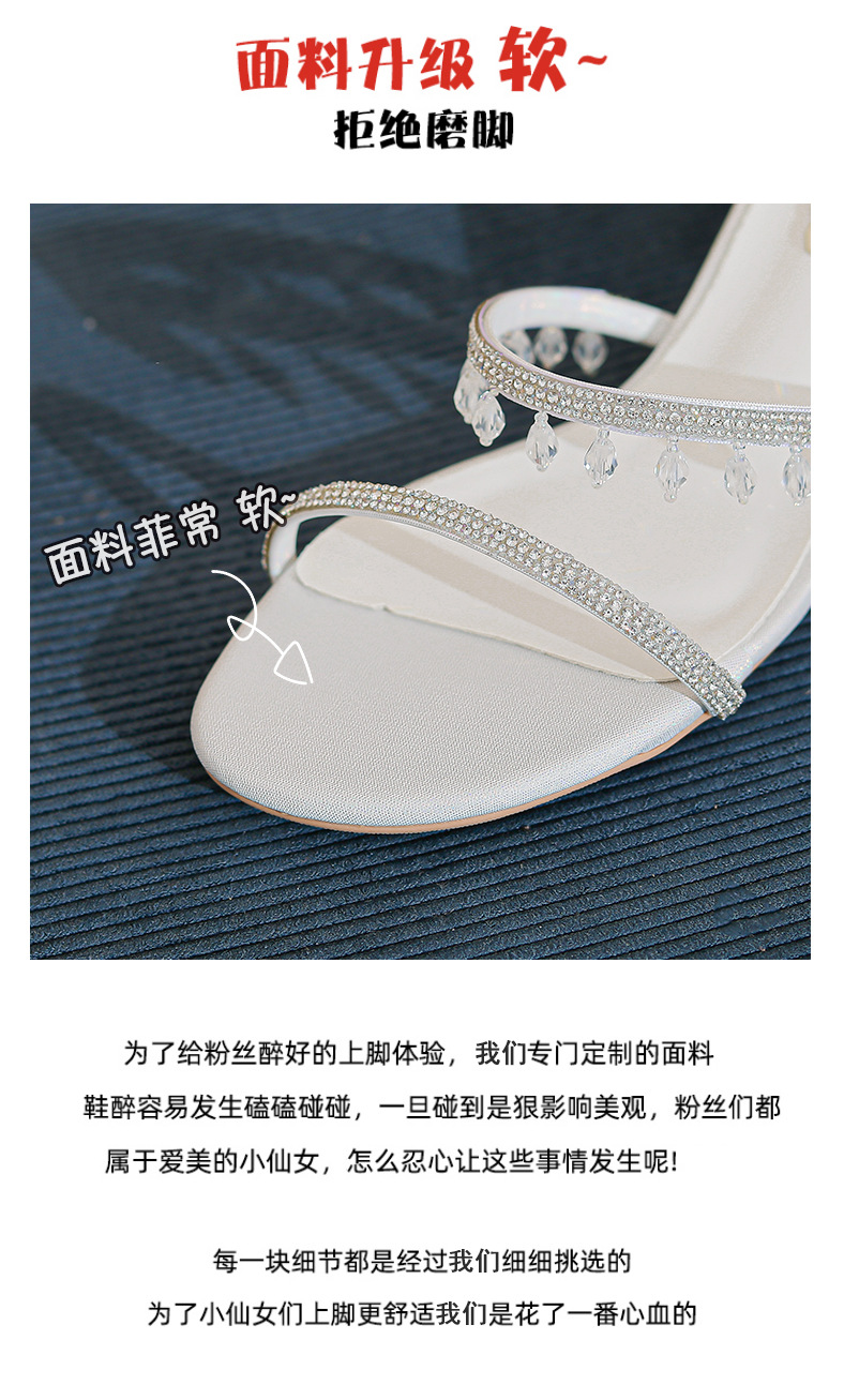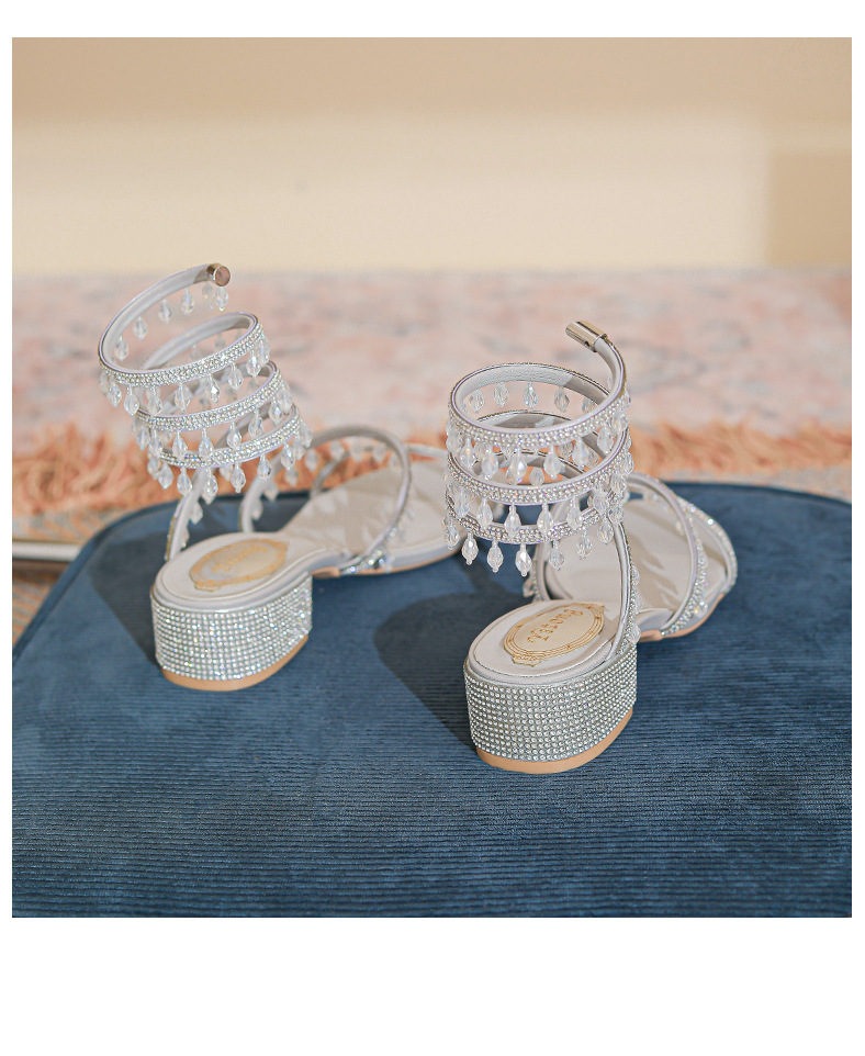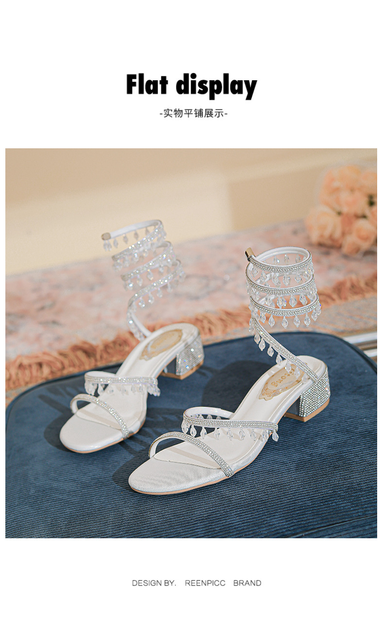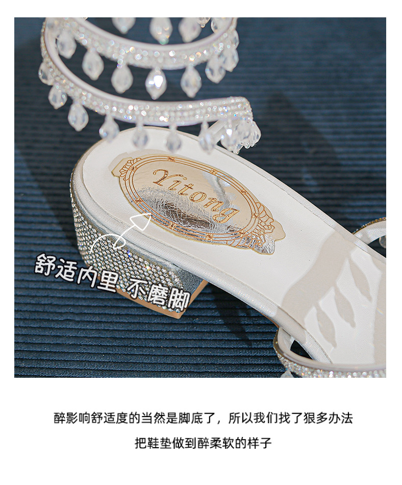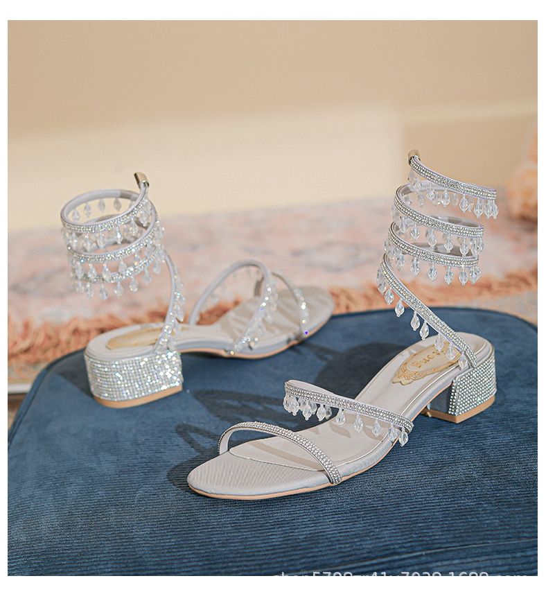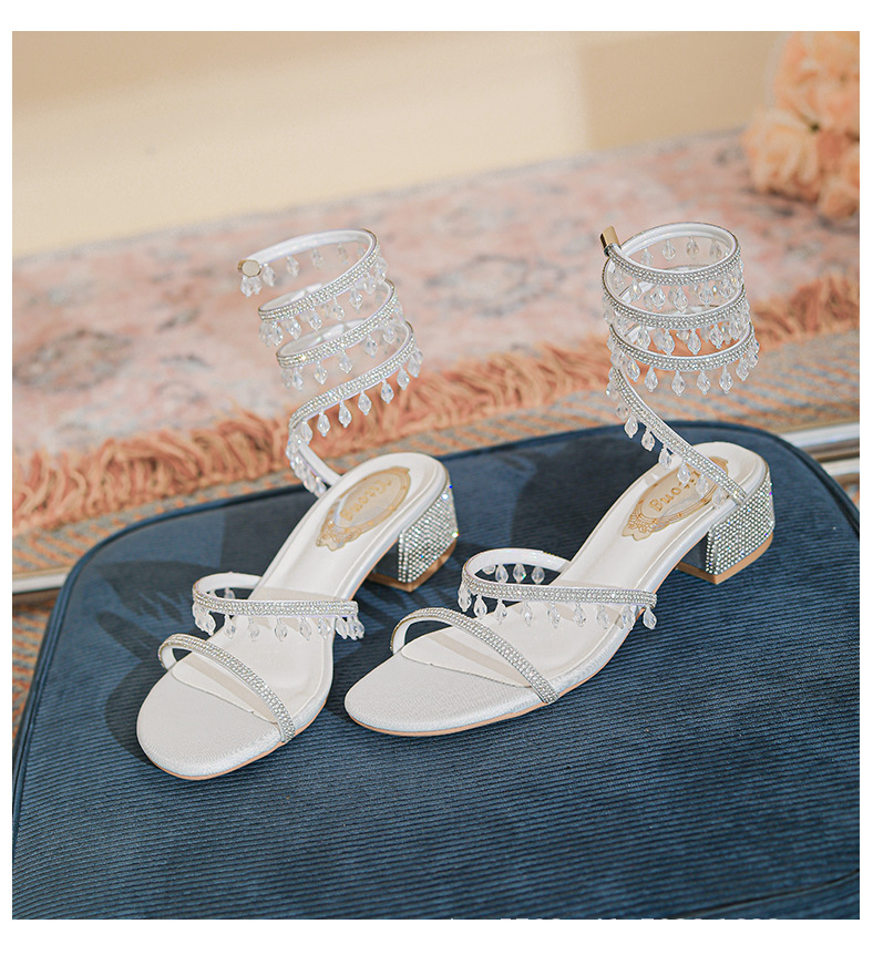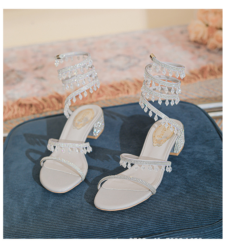 法式仙女鞋浅口绝美水晶吊坠蛇型绕脚水钻粗跟夏季凉鞋女H242180158