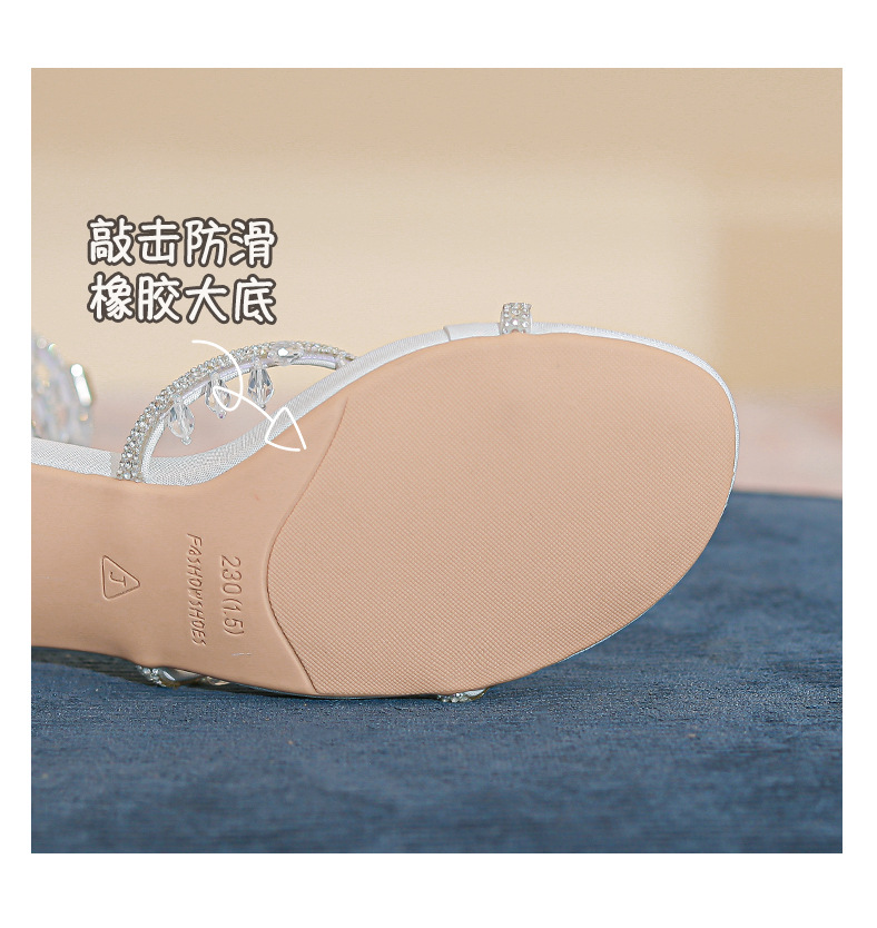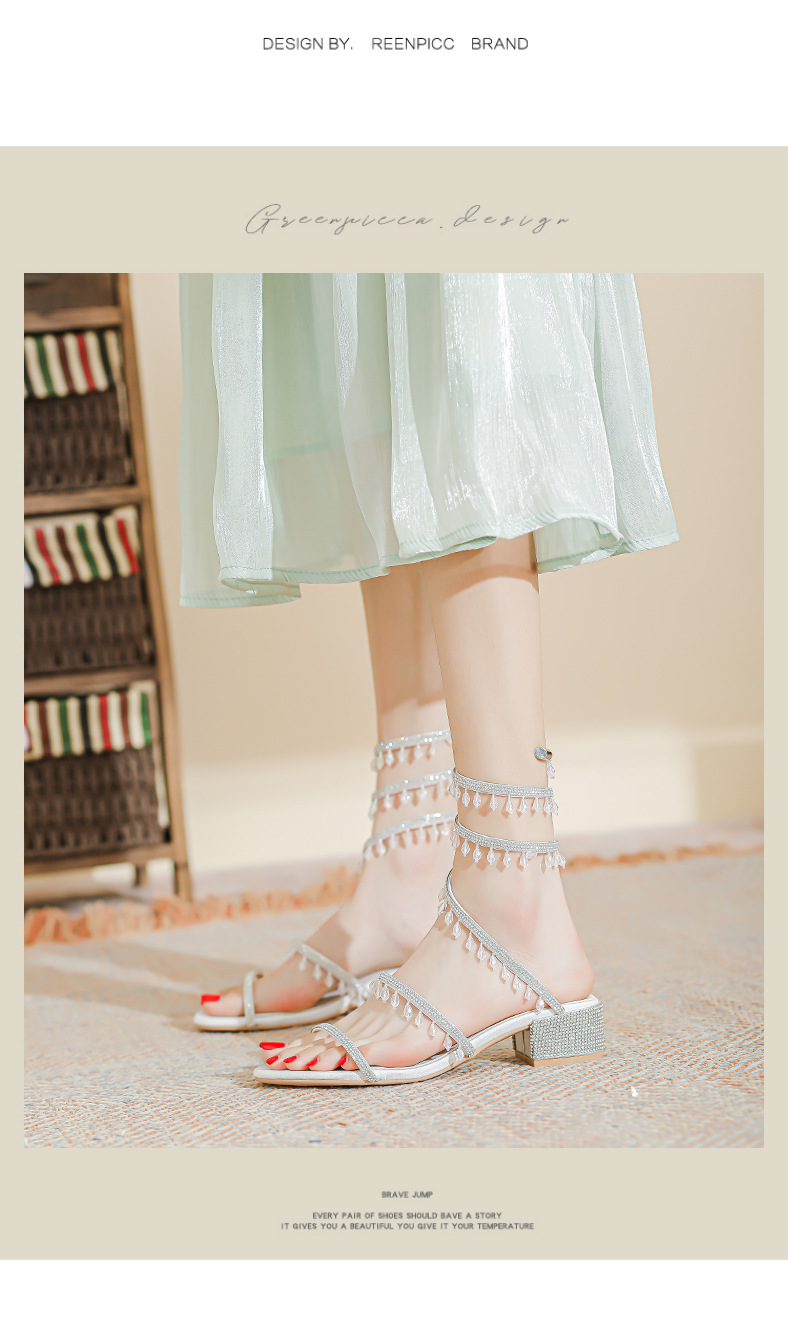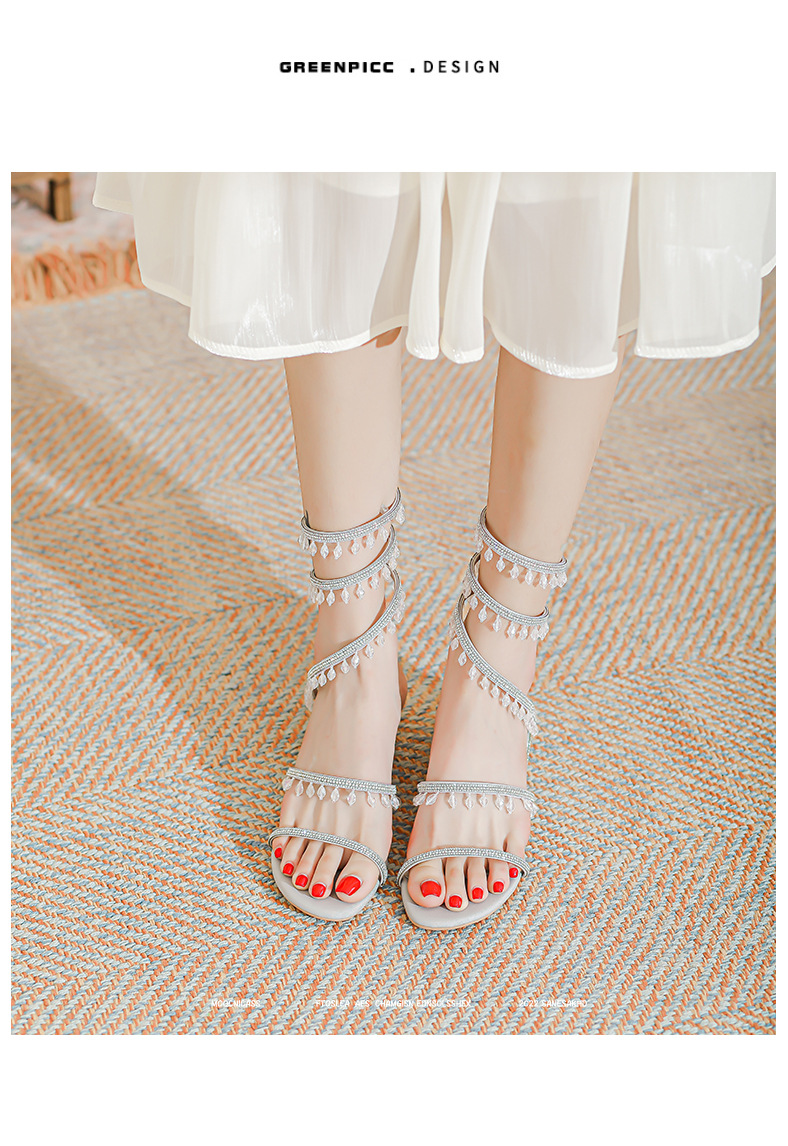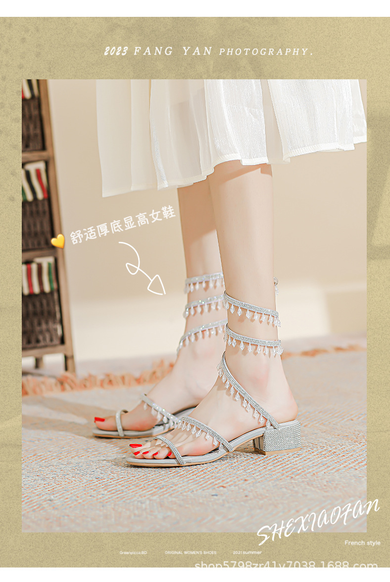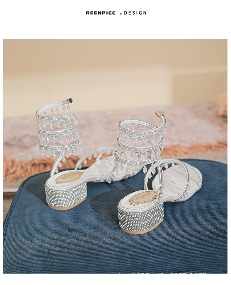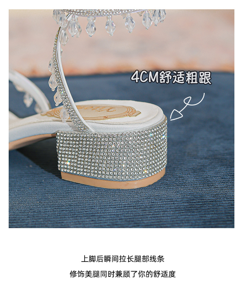 法式仙女鞋浅口绝美水晶吊坠蛇型绕脚水钻粗跟夏季凉鞋女H242180158
