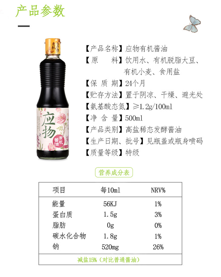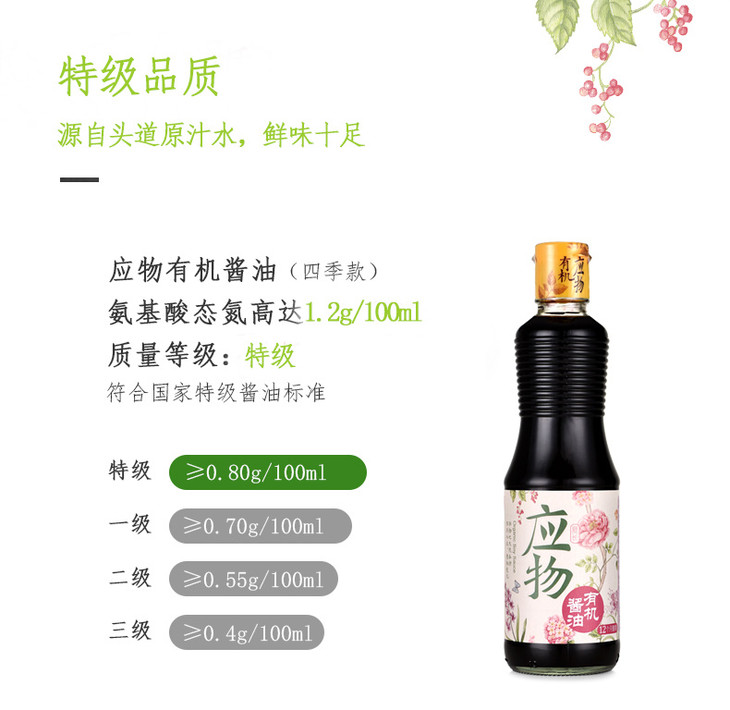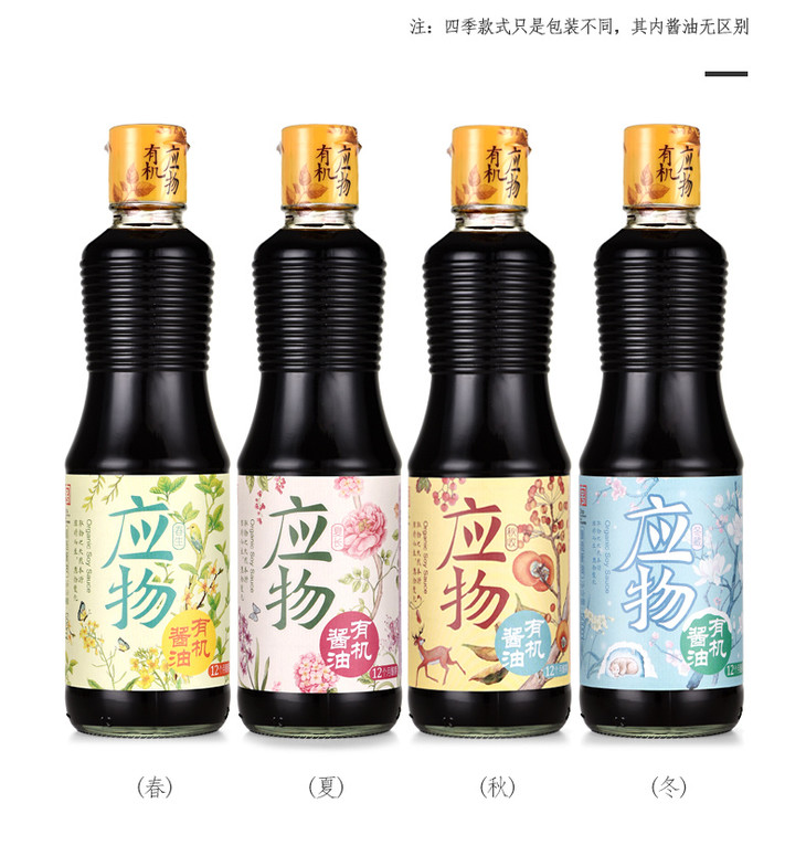 四季酿造有机酱油 Four Seasons Brewed Organic Soy Sauce 品牌:应物 原料:饮用水、有机脱脂大豆、有机小麦、食用盐 规格: 有机酱油 500ml 有机酱油 150ml 生产厂家:山东玉兔食品有限公司 食品生产许可证:SC10337030600154 氨基酸态氮:≥1.2g/100ml 生产方式:高盐稀态发酵酱油,酿造12个月,不添加防腐剂、味精、色素 储存方式:阴凉干燥通风处,开封后冷藏储存 保质期:24个月 |
