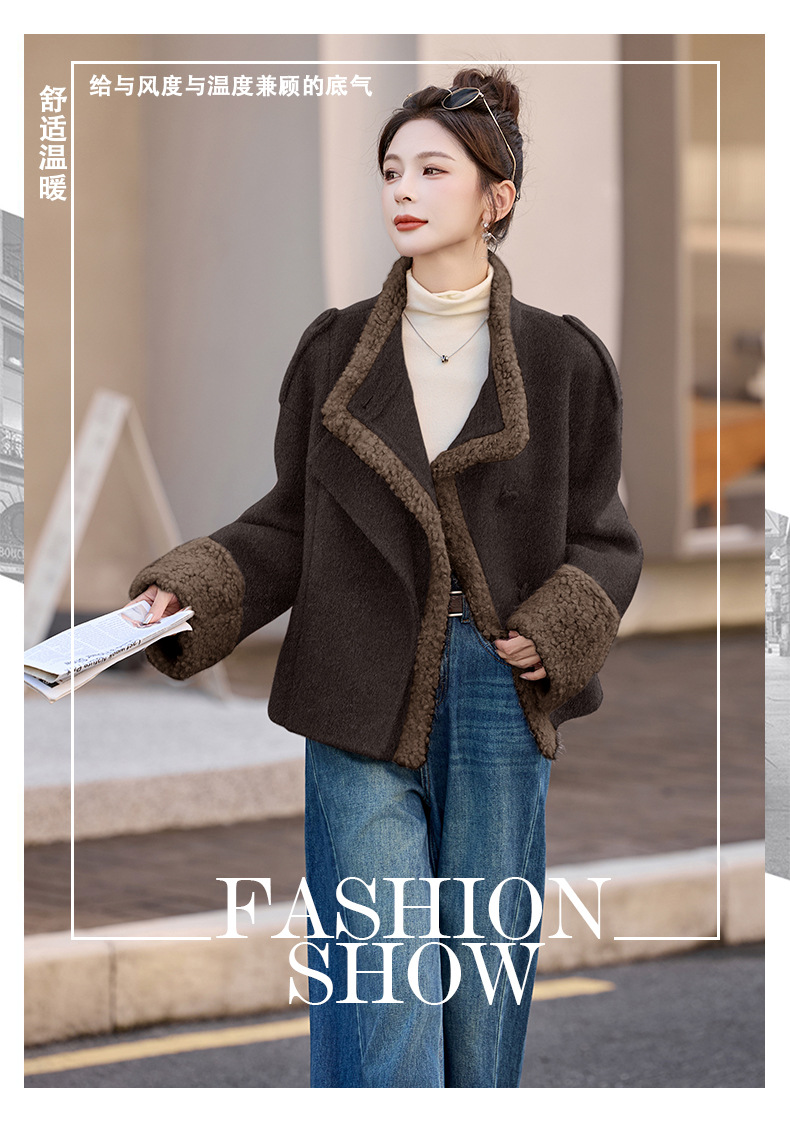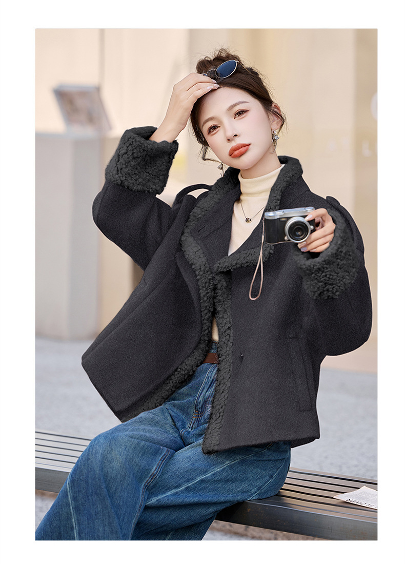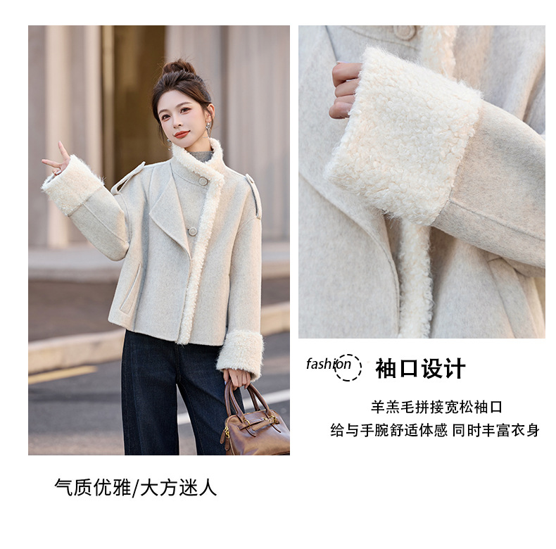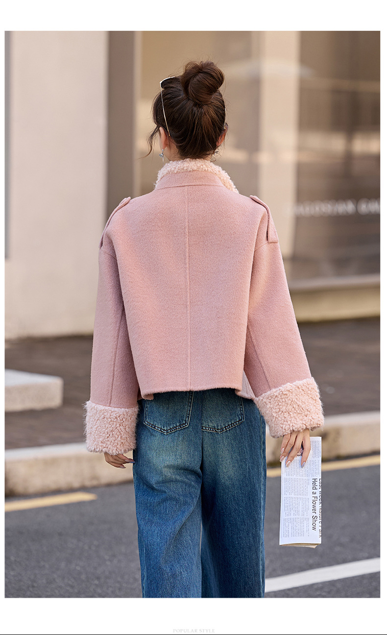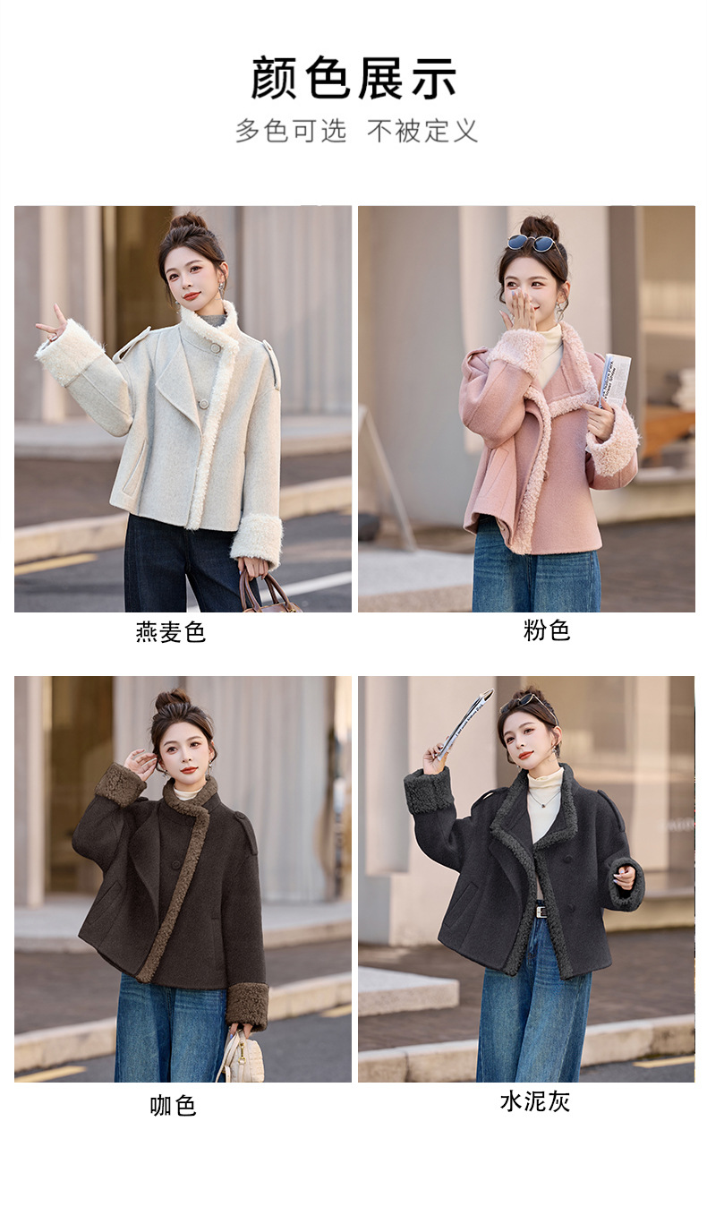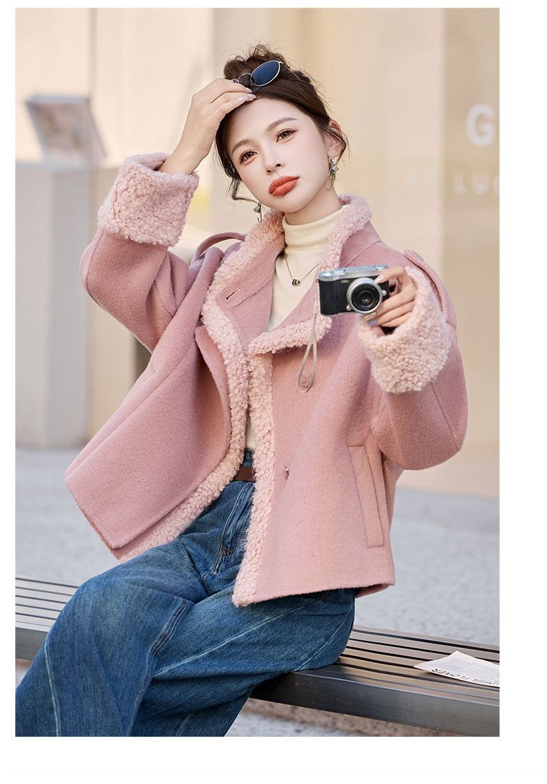 粉色彷羊羔毛拼接双面羊毛大衣,韩系宽松呢子外套HR-QIXFS25-5143