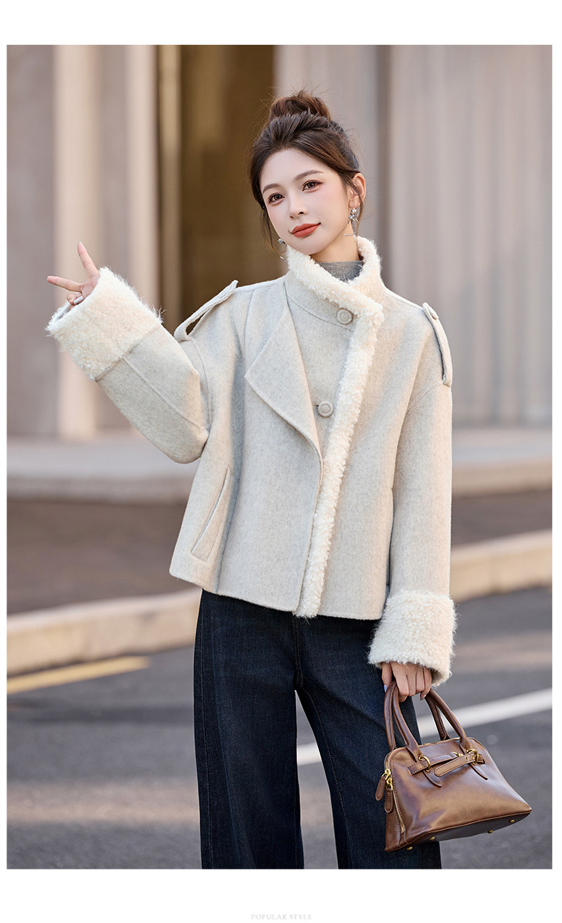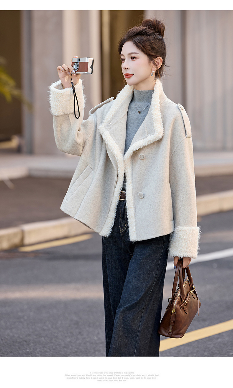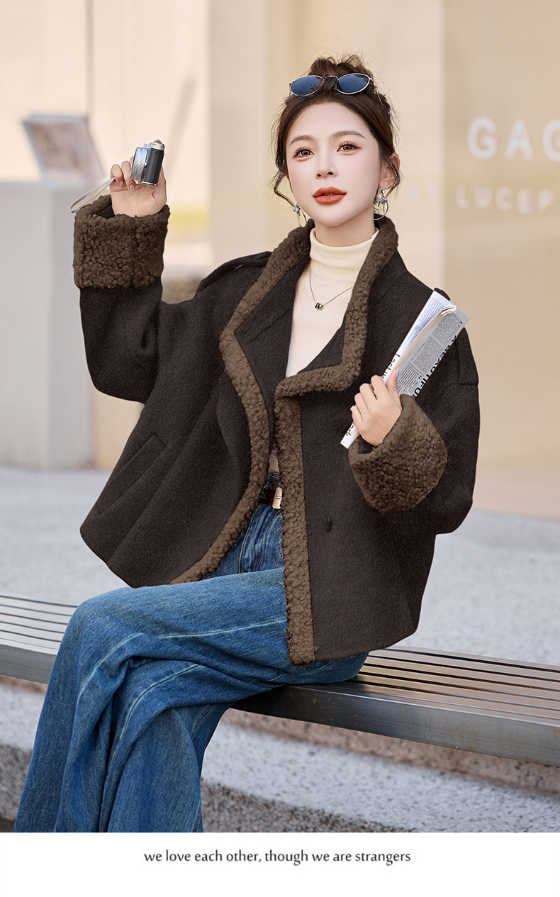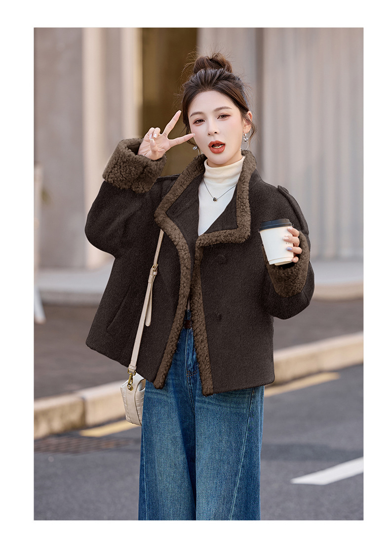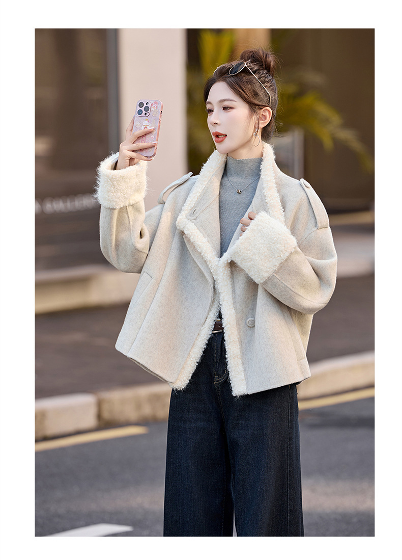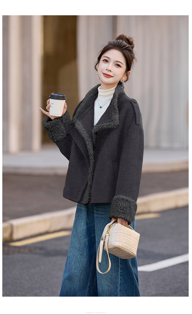 粉色彷羊羔毛拼接双面羊毛大衣,韩系宽松呢子外套HR-QIXFS25-5143