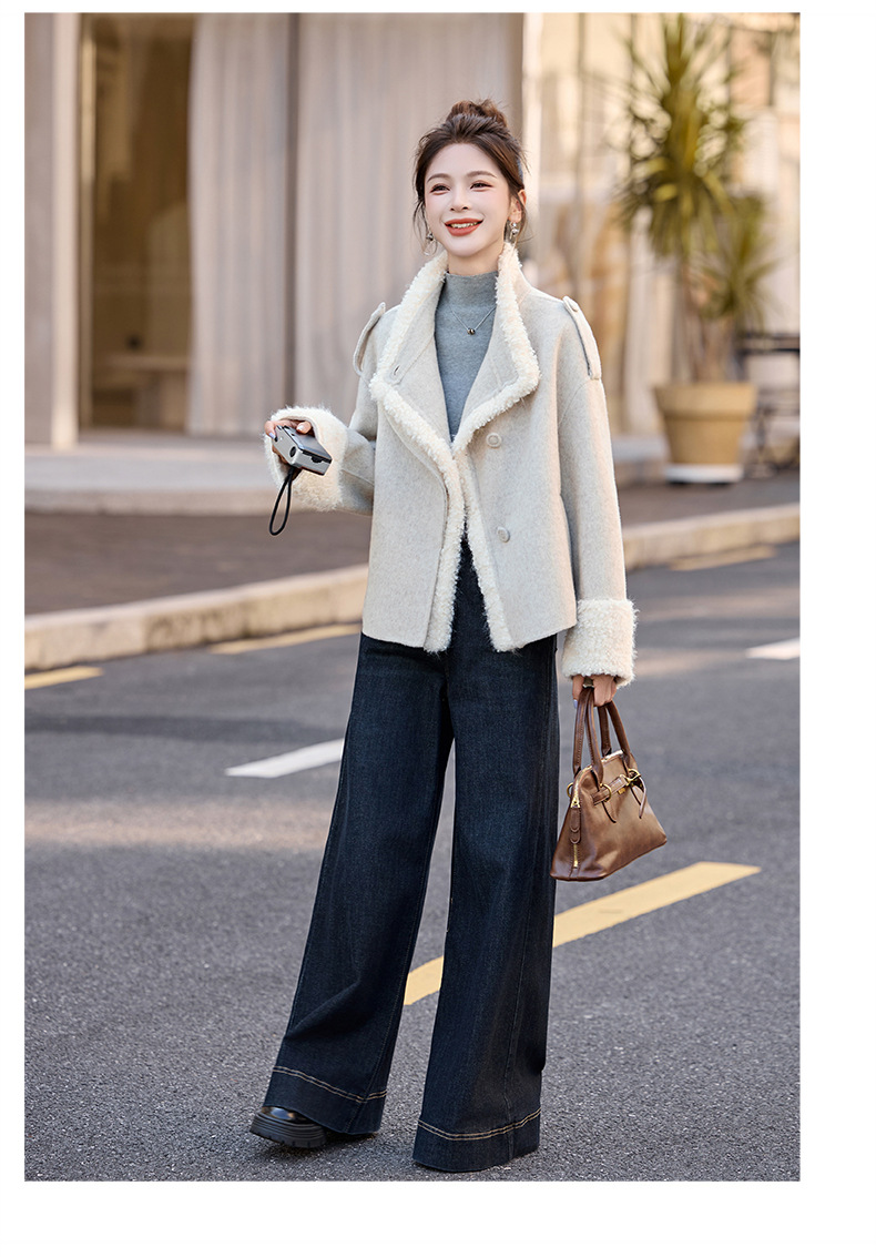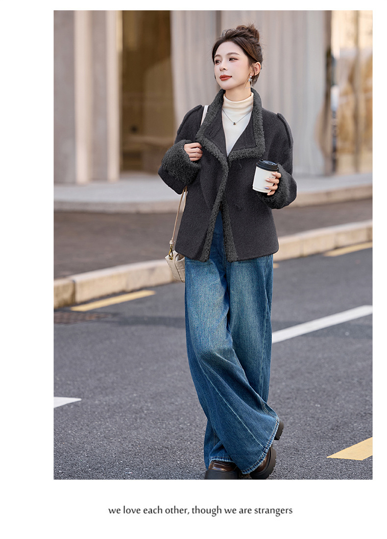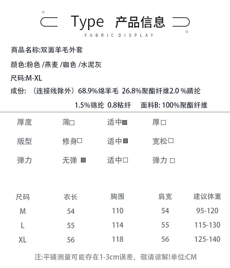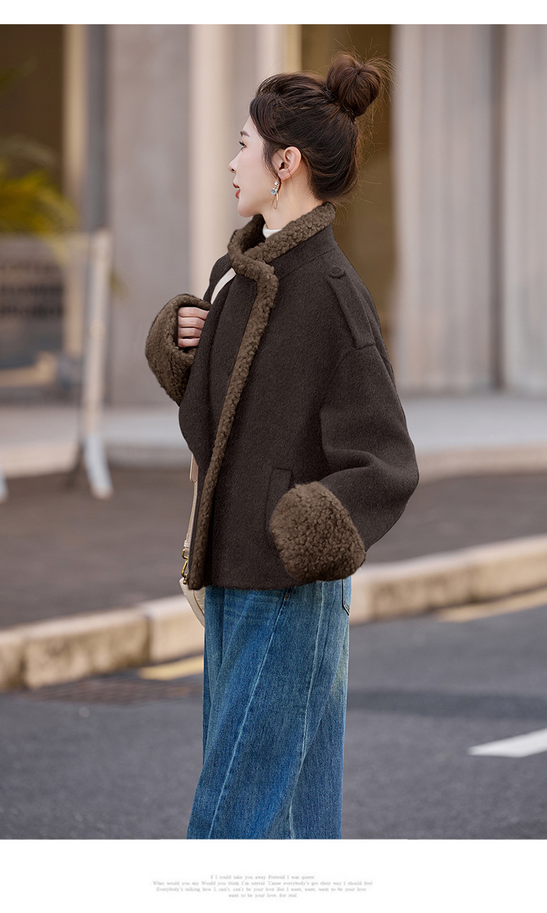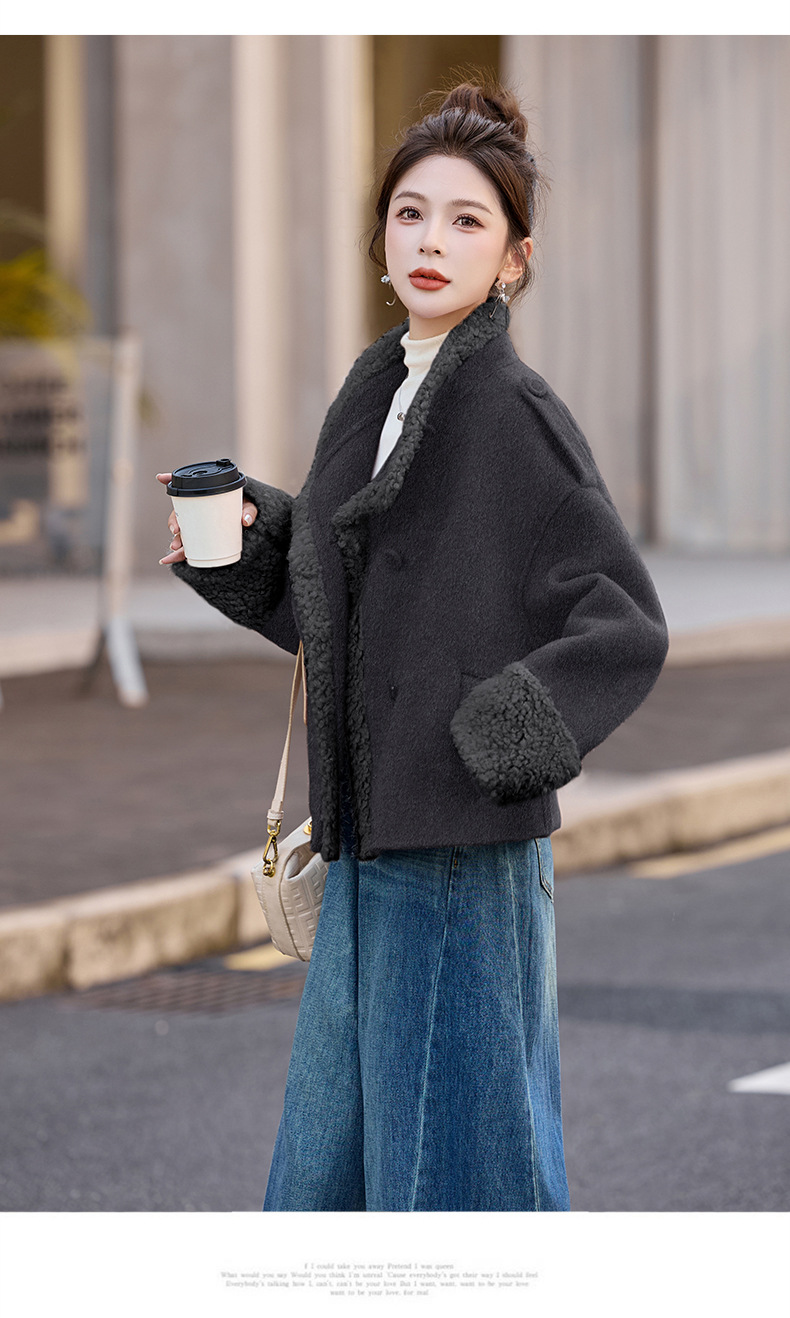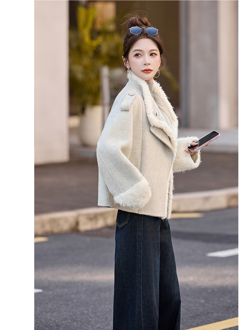 粉色彷羊羔毛拼接双面羊毛大衣,韩系宽松呢子外套HR-QIXFS25-5143