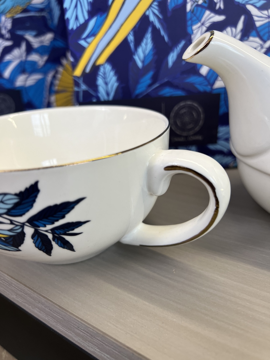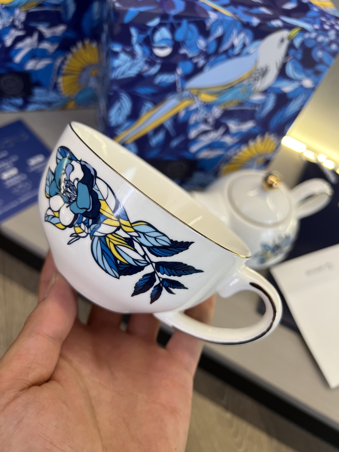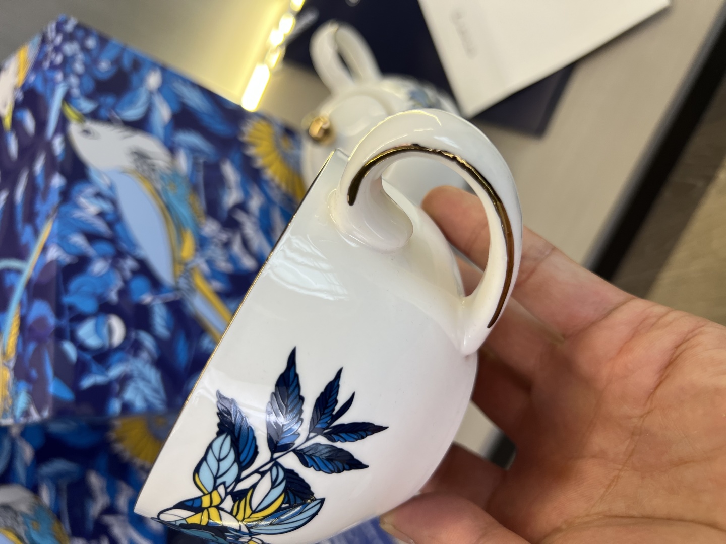 搭配手工镀金工艺,不仅让产品线条更显精致亮眼,更通过金属光泽与瓷面的碰撞,强化了蓝鹊字母设计的层次感,使图案更具立体美感与辨识度。