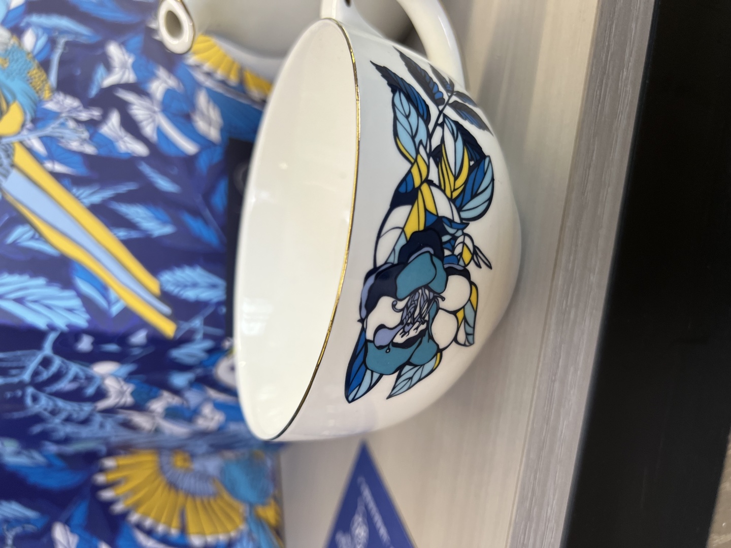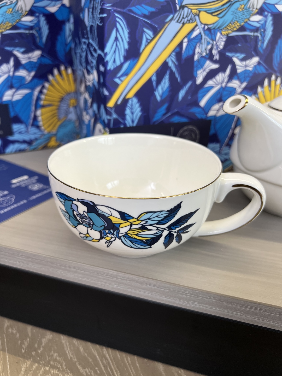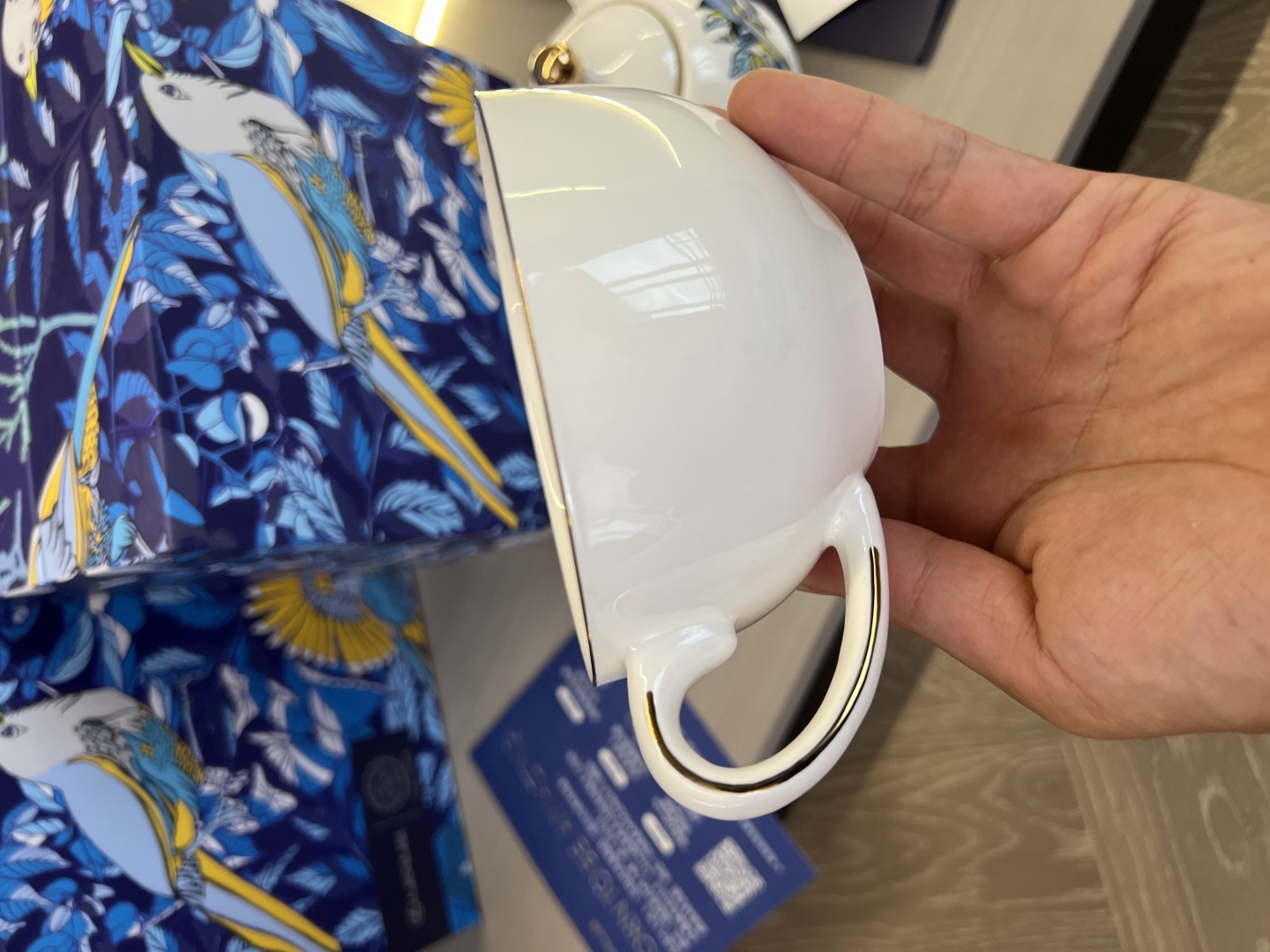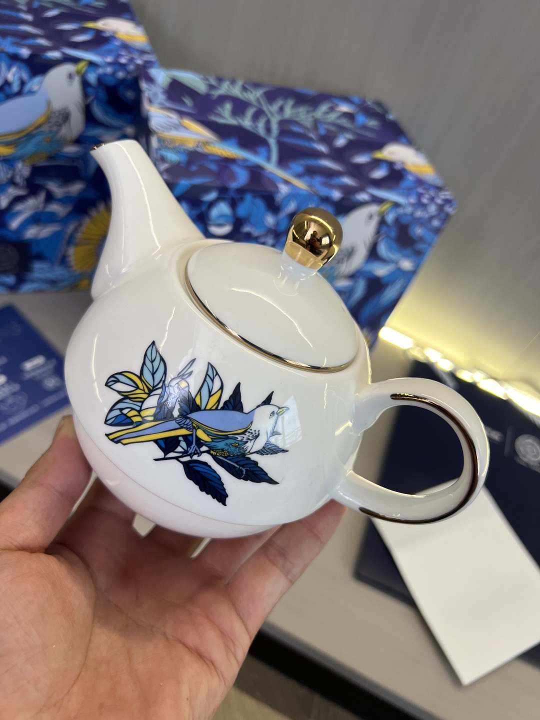 搭配手工镀金工艺,不仅让产品线条更显精致亮眼,更通过金属光泽与瓷面的碰撞,强化了蓝鹊字母设计的层次感,使图案更具立体美感与辨识度。
