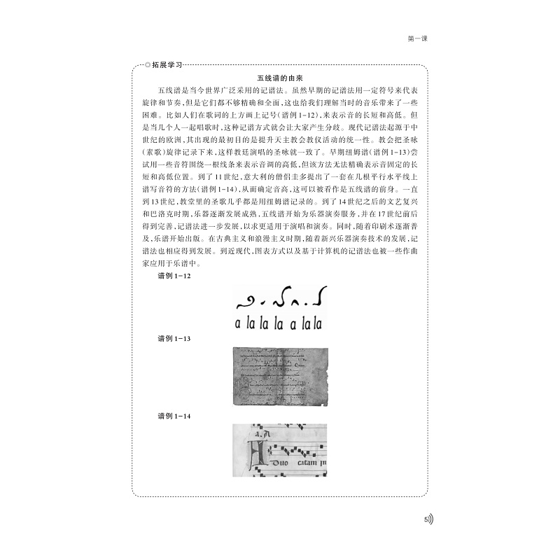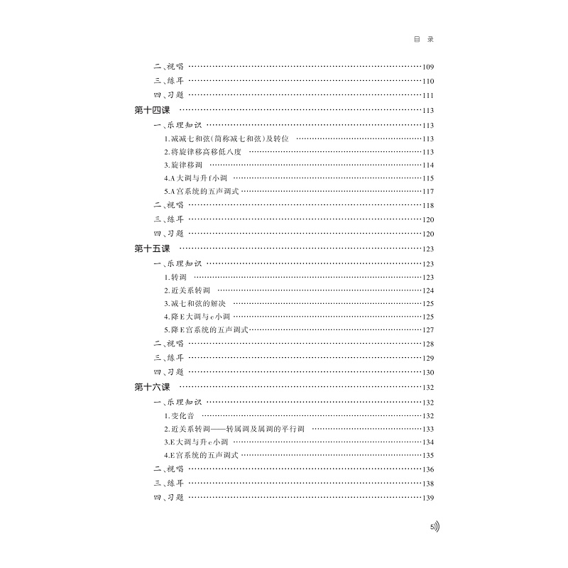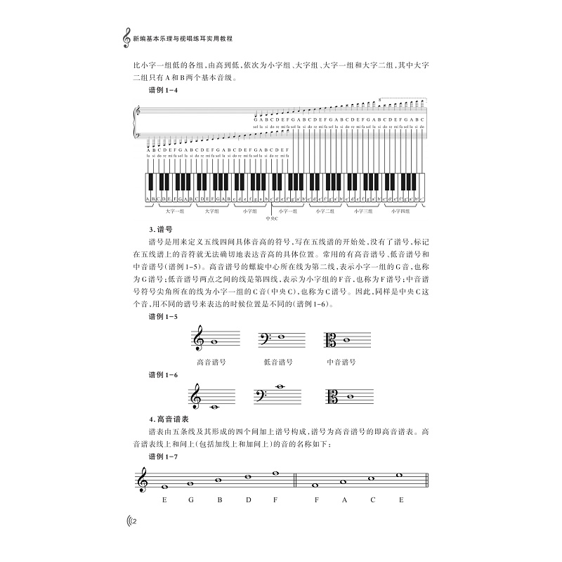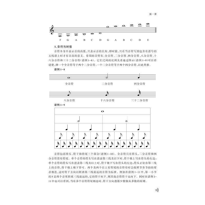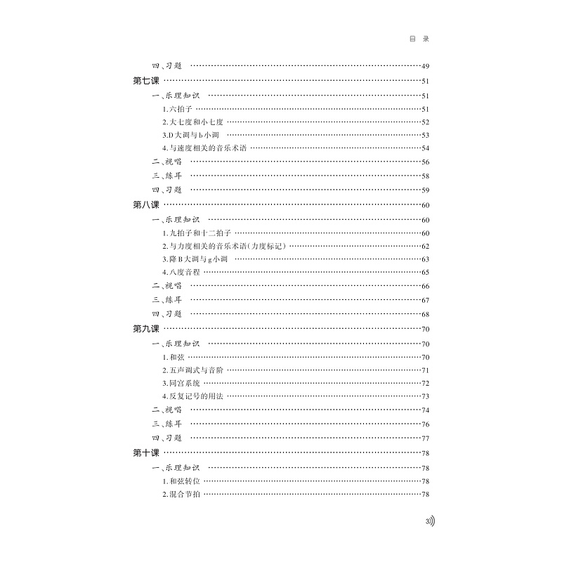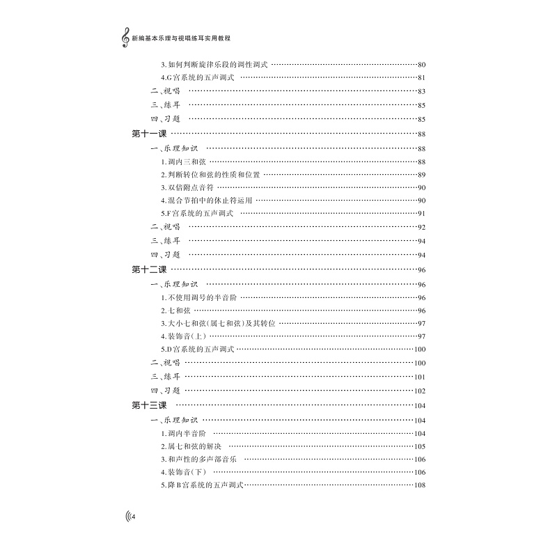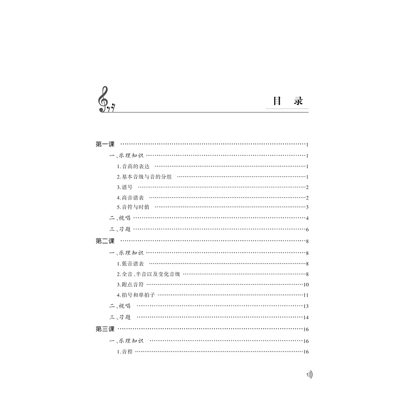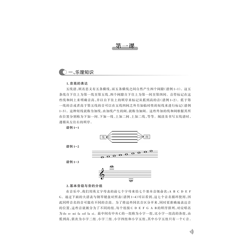 本教材面向零起点学生,基本涵盖基本乐理与视唱练耳的主要知识点。每一章节包含基本乐理知识、听力训练、视唱训练和音乐小知识四个部分,并附有课后习题。章节内容与课程长度基本匹配。前十四课用于第一学期(初级班),后十四次课既可用于第二学期(中级班)的教学,也适用于完成初级班学习的学生的自学。