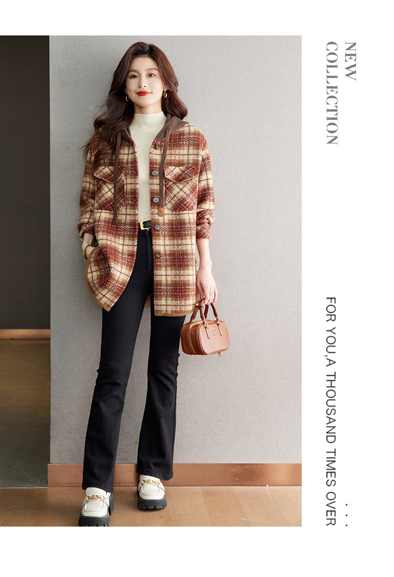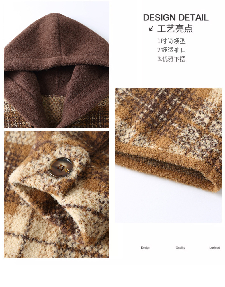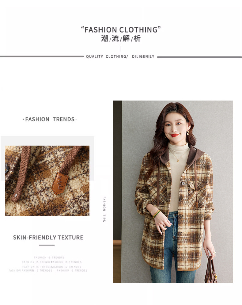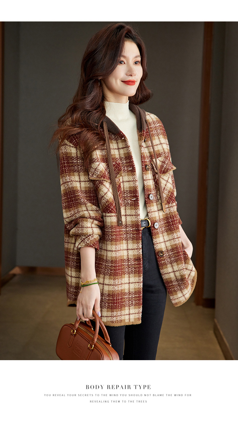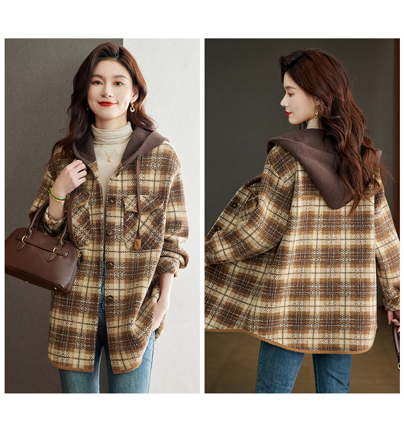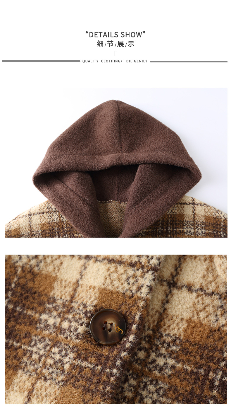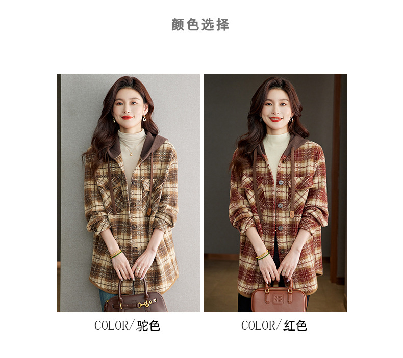 CC-22-186毛呢外套女2024秋冬新款格子连帽韩系大衣中长款呢子外搭小个子女