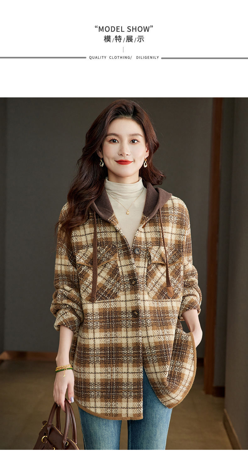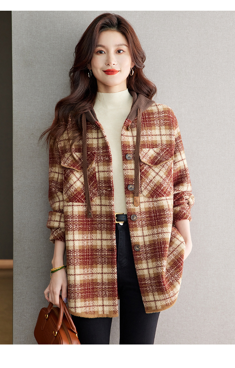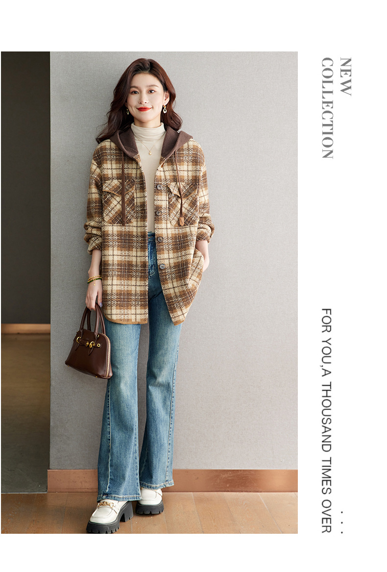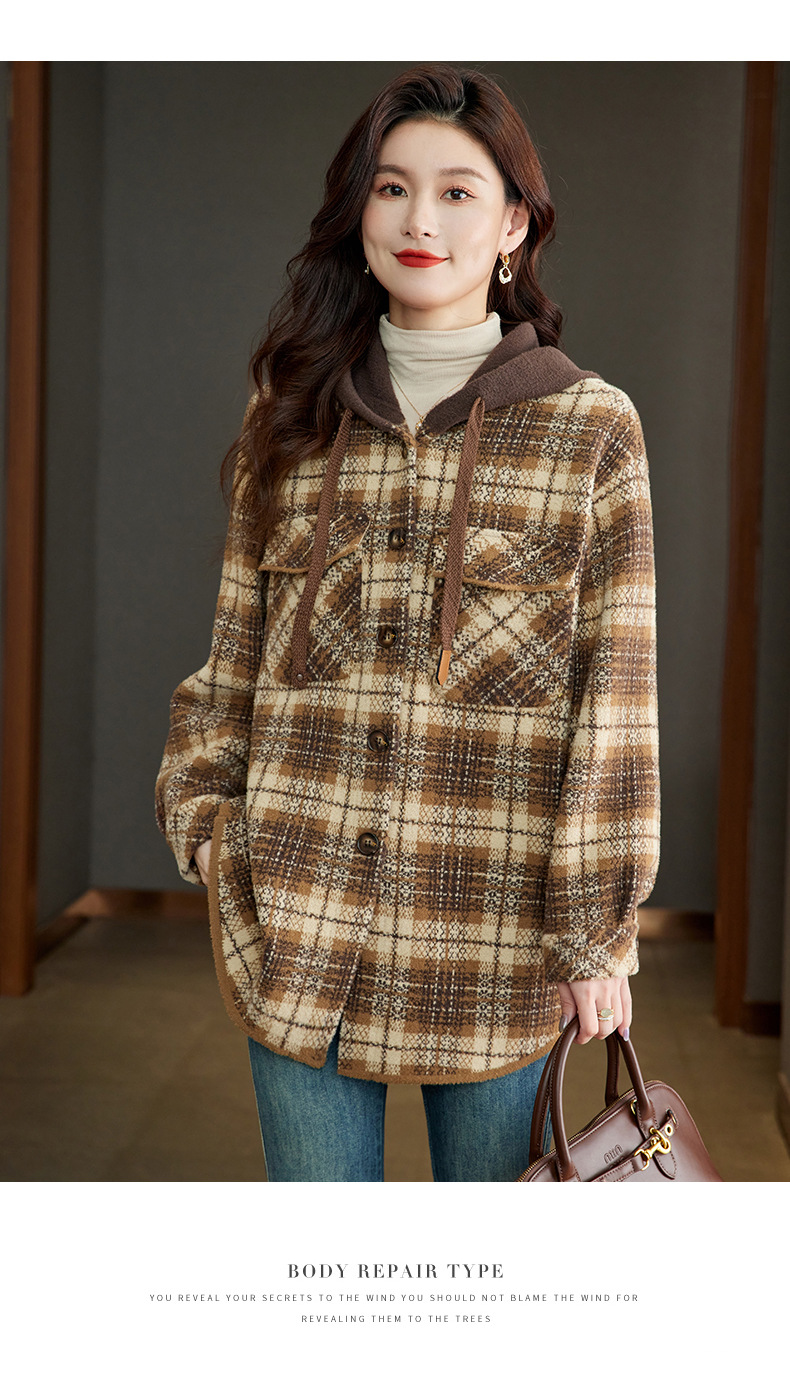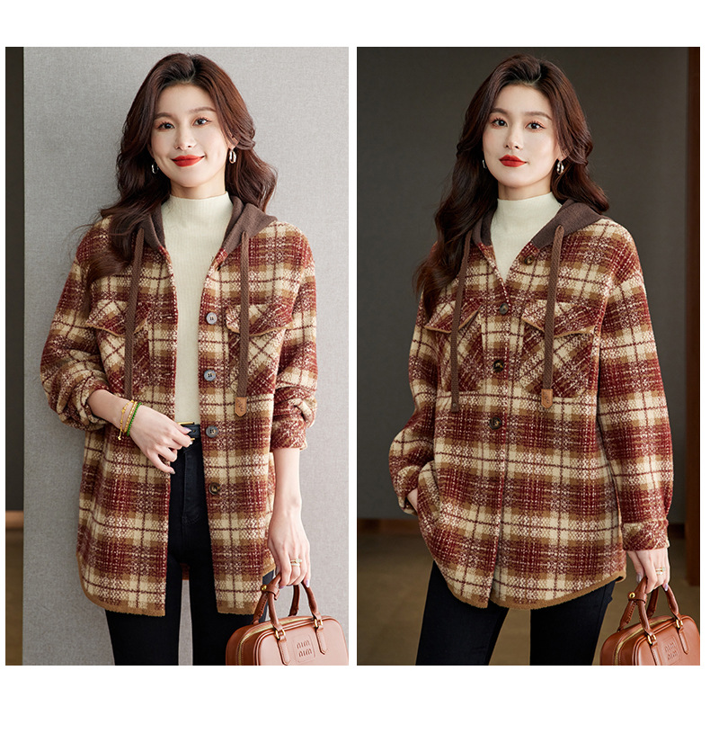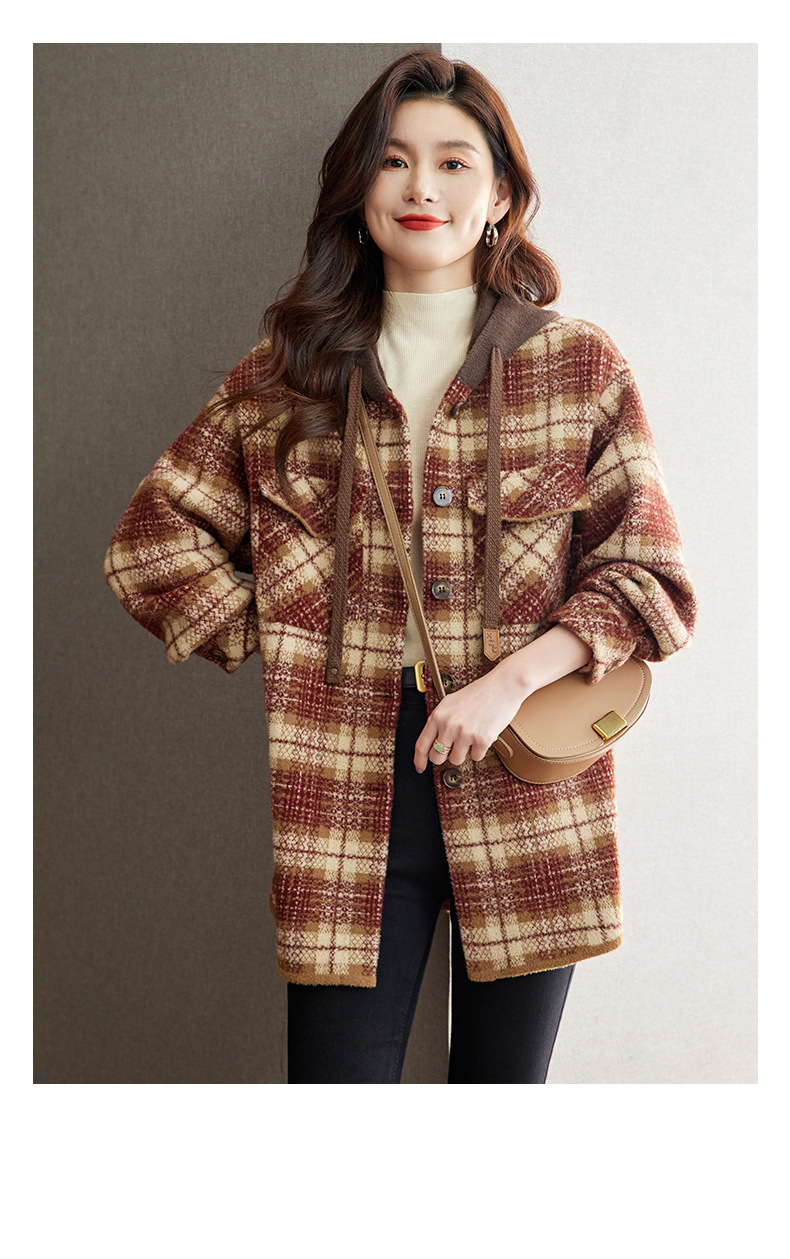 CC-22-186毛呢外套女2024秋冬新款格子连帽韩系大衣中长款呢子外搭小个子女