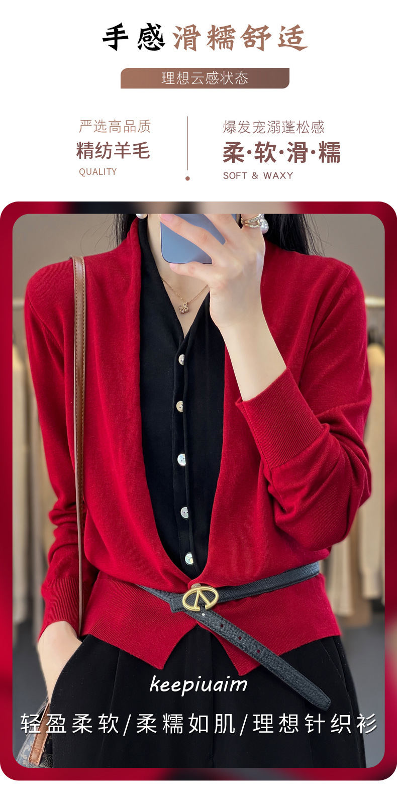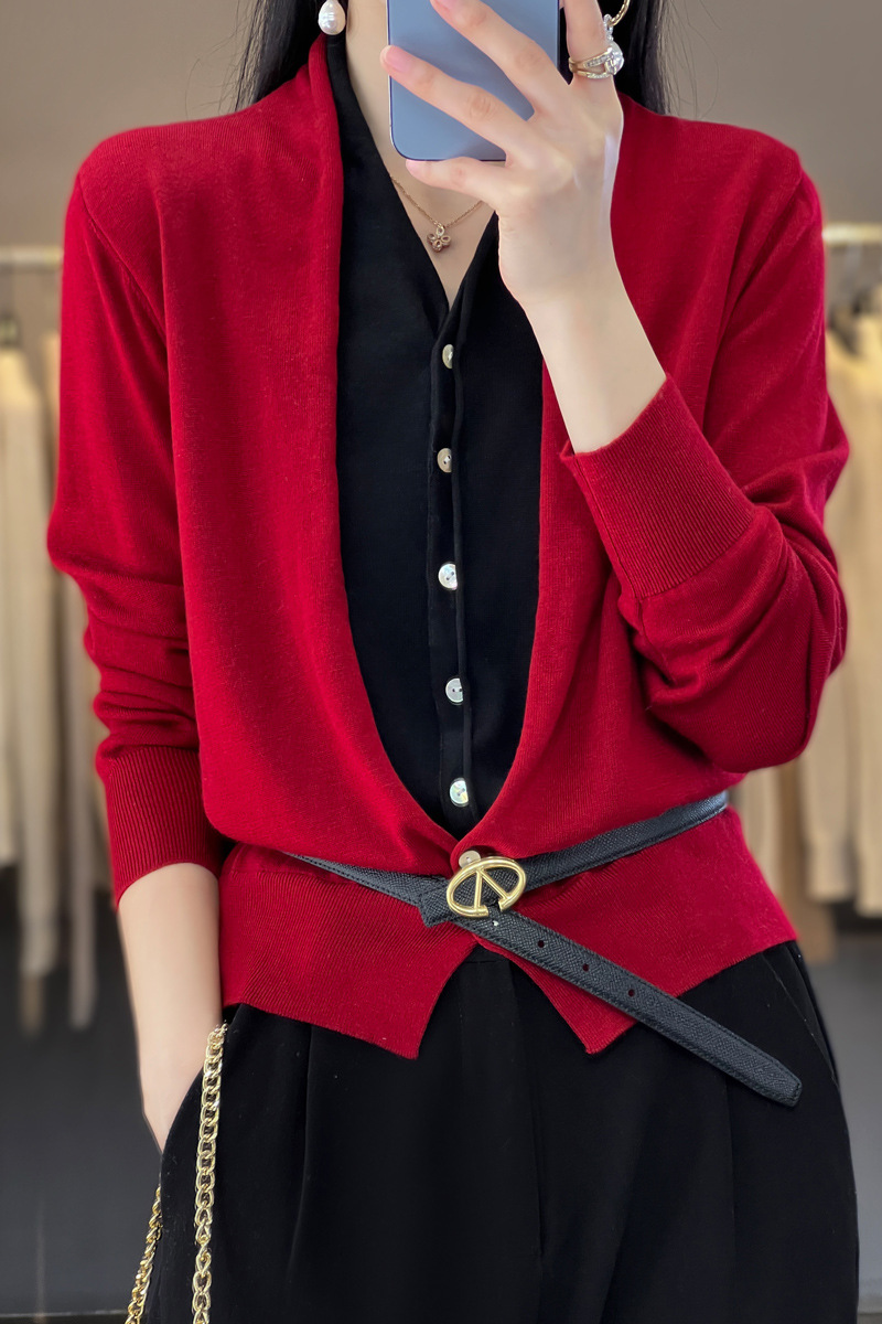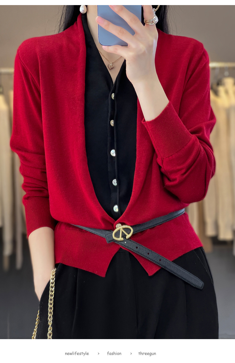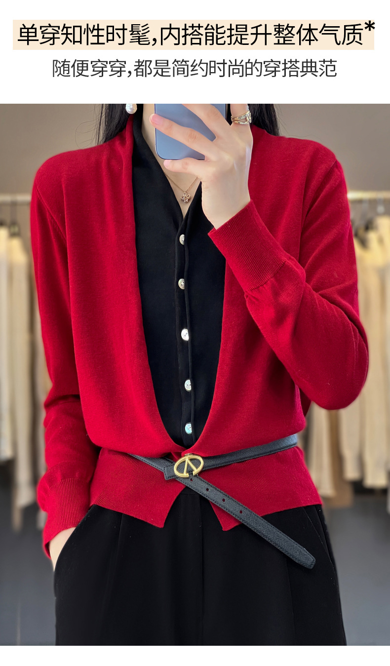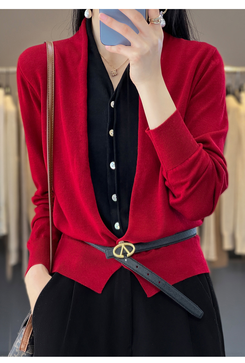 QHJY-JY230283春季新款V领假两件开衫女针织衫长袖外套时尚气质精仿毛衫上衣