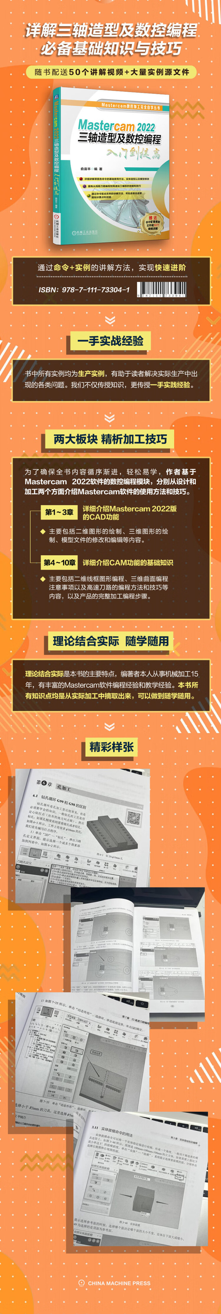 理论结合实际是本书的主要特点,编著者本人从事机械加工15年,有丰富的Mastercam软件编程经验和教学经验。本书所有知识点均是从实际加工中摘取出来,可以做到随学随用。