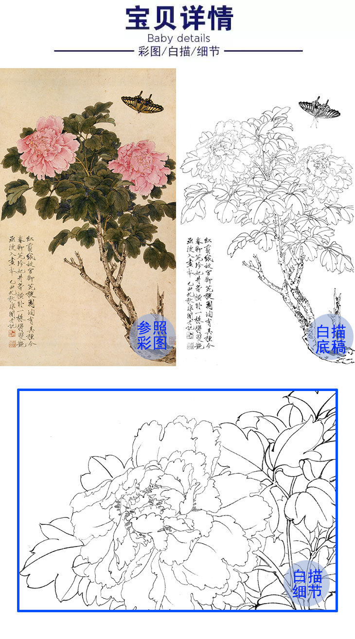 【有步骤、大彩图】李晓明工笔画白描底稿《长寿永昌》牡丹寿带鸟初学者临摹花鸟线稿KD24
