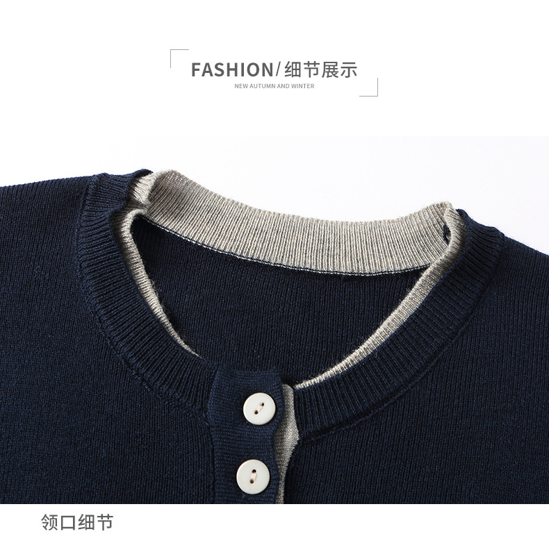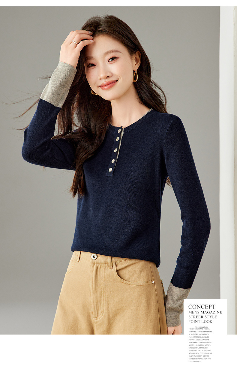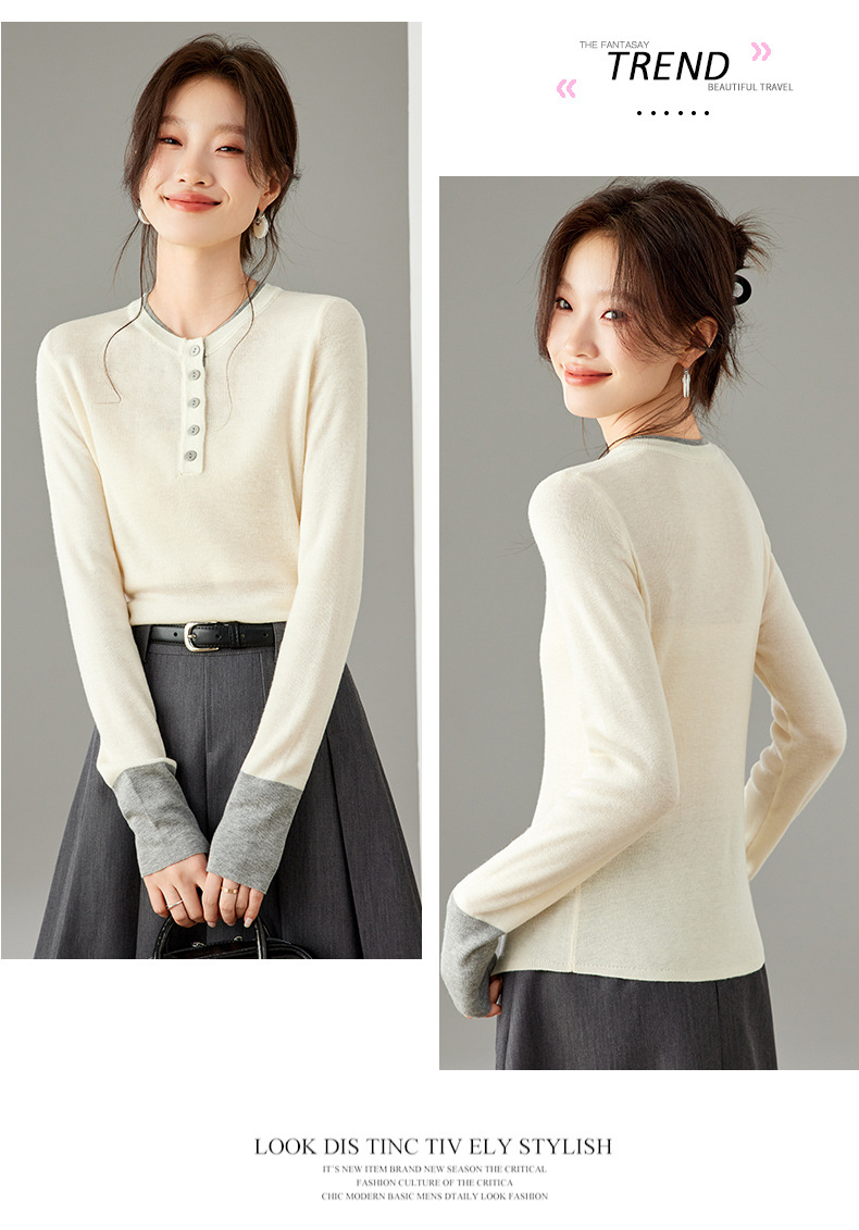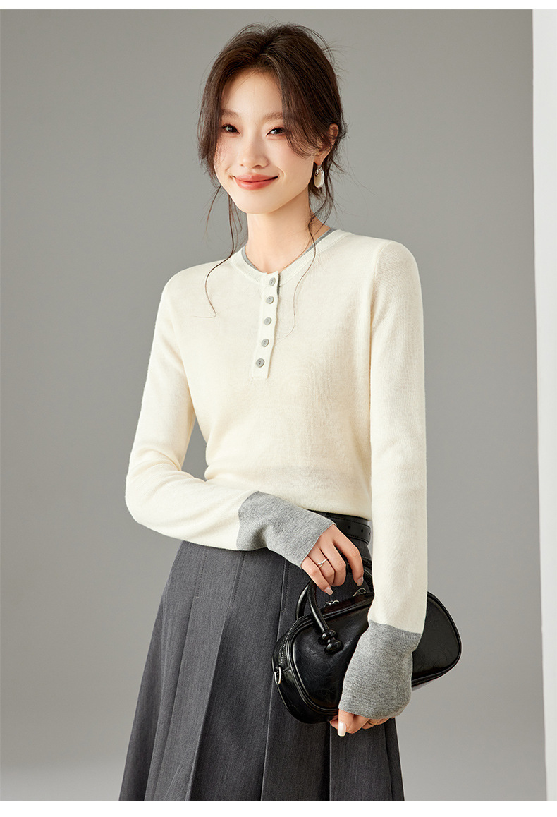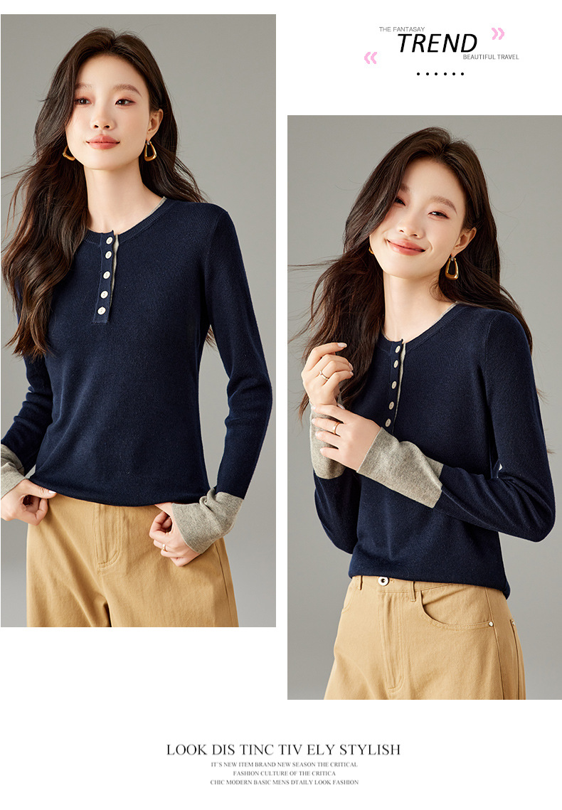 基础款撞色套头毛衣女2025秋冬季短款简约小衫纽扣装饰打底针织衫