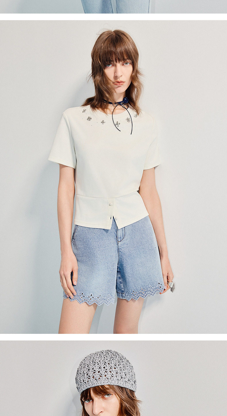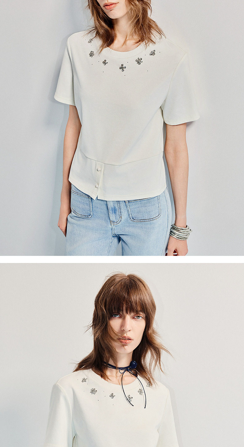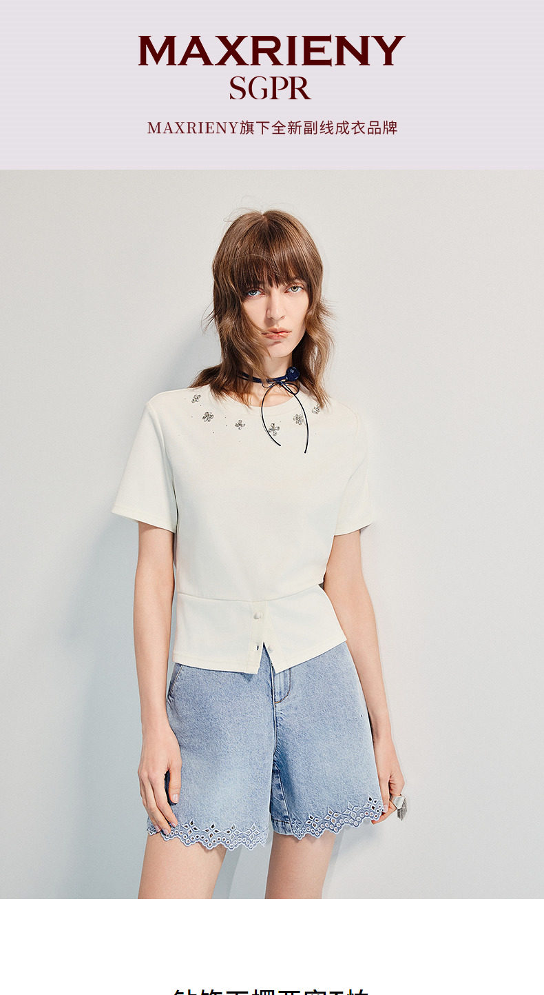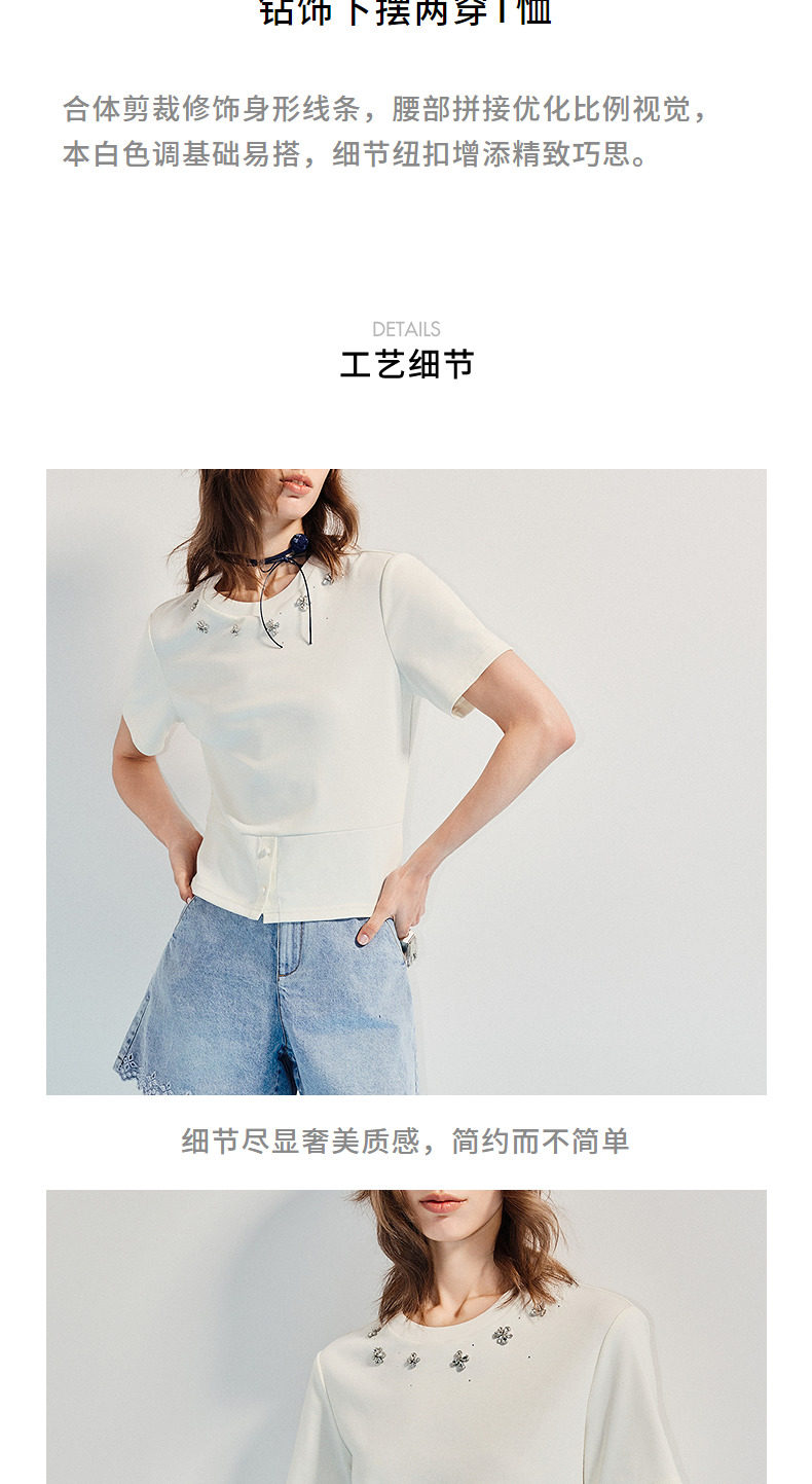 【SGPR】精致日常钻饰下摆两穿短袖T恤25夏修身上衣(货号:MU86TS251)