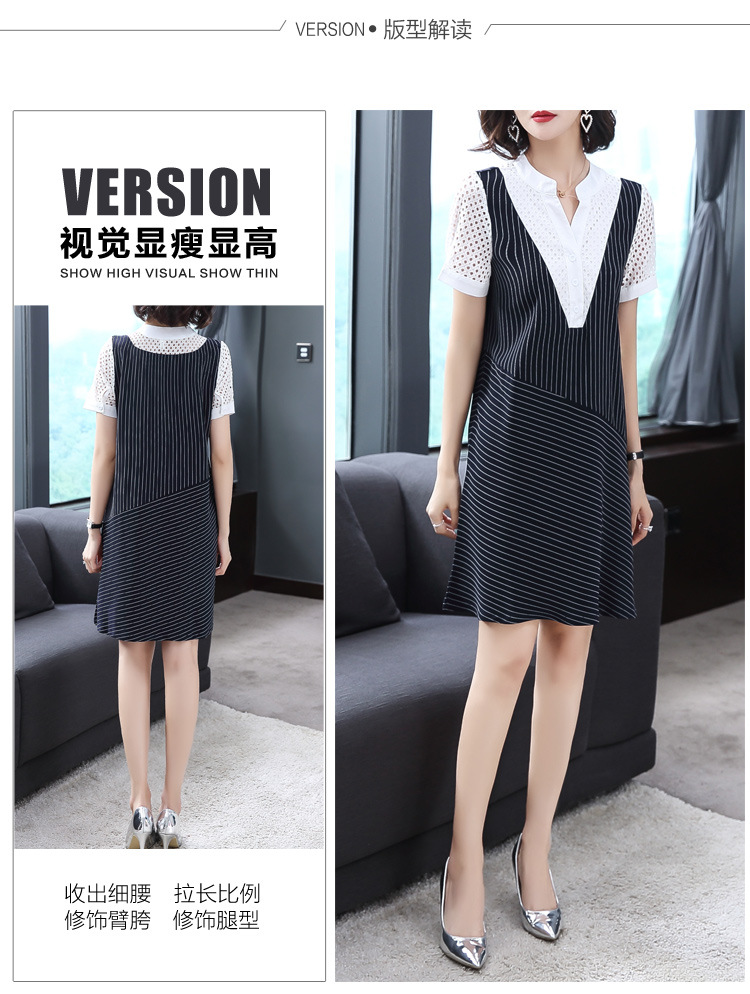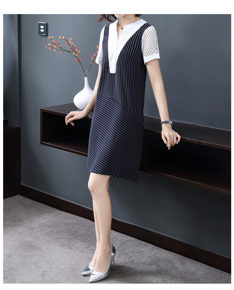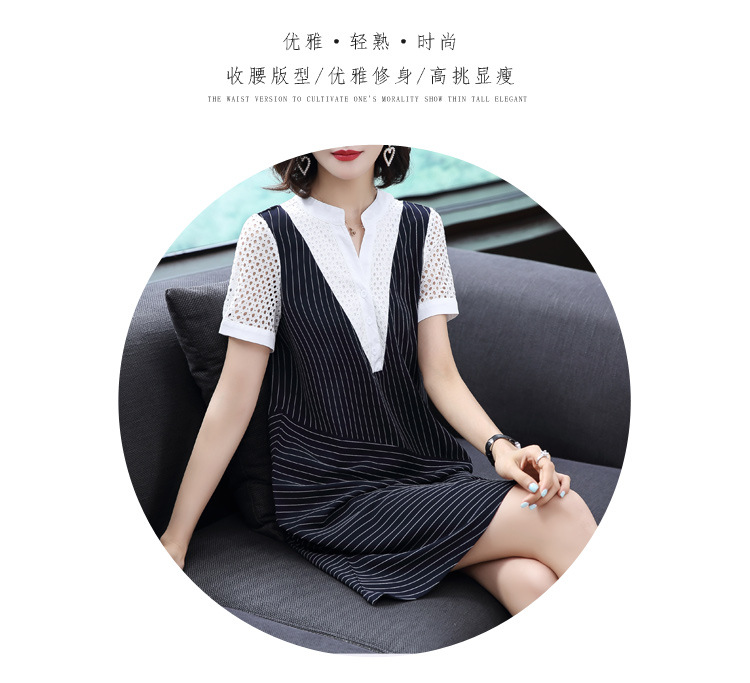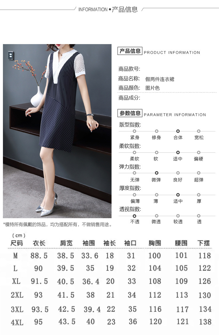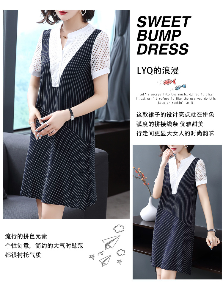 AHM-wmy9258新款假两件大码胖mm蕾丝拼接条纹连衣裙