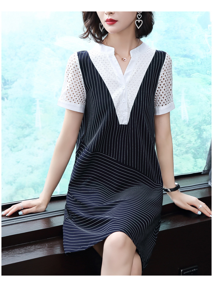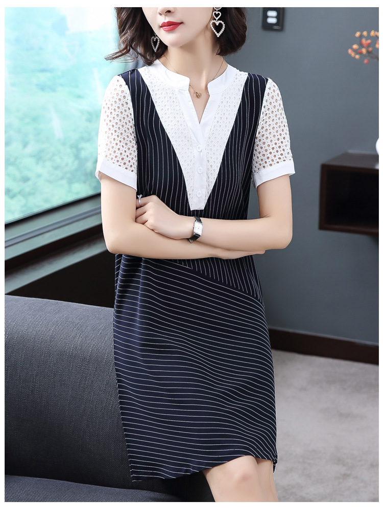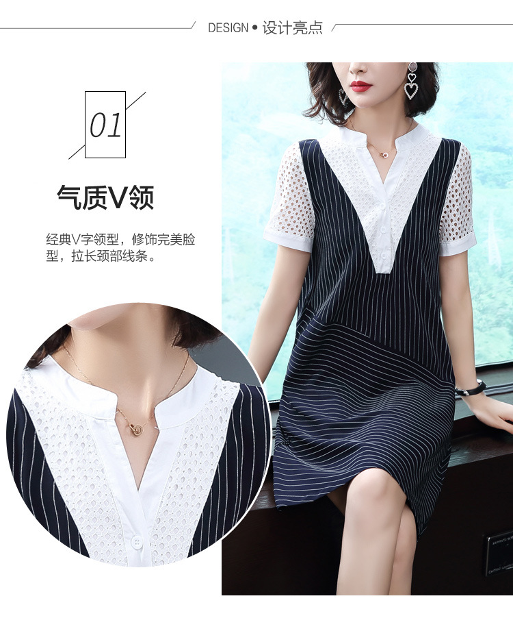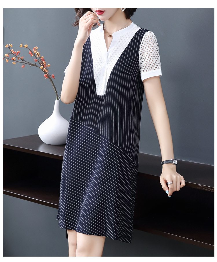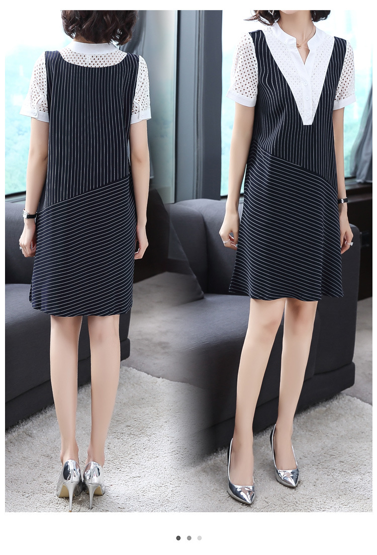 AHM-wmy9258新款假两件大码胖mm蕾丝拼接条纹连衣裙