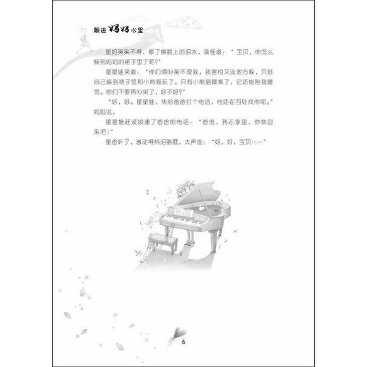 小说《躲进妈妈心里》是原创儿童文学作品,主人公星星娃是一个天真可爱、古灵精怪、自信勇敢的孩子,她被爱包围着,在浓浓的亲情、友情的浸润中长大。书中主要讲述的就是星星娃与父母、与同学、老师之间发生的一系列令人捧腹的童年趣事,她的故事新奇而幽默,在分享真实成长故事的同时传递出正能量,让小读者明白,成长只有起点,没有终点,鼓励他们永不停歇成长的脚步,努力、勇敢、自信地迈向明天。