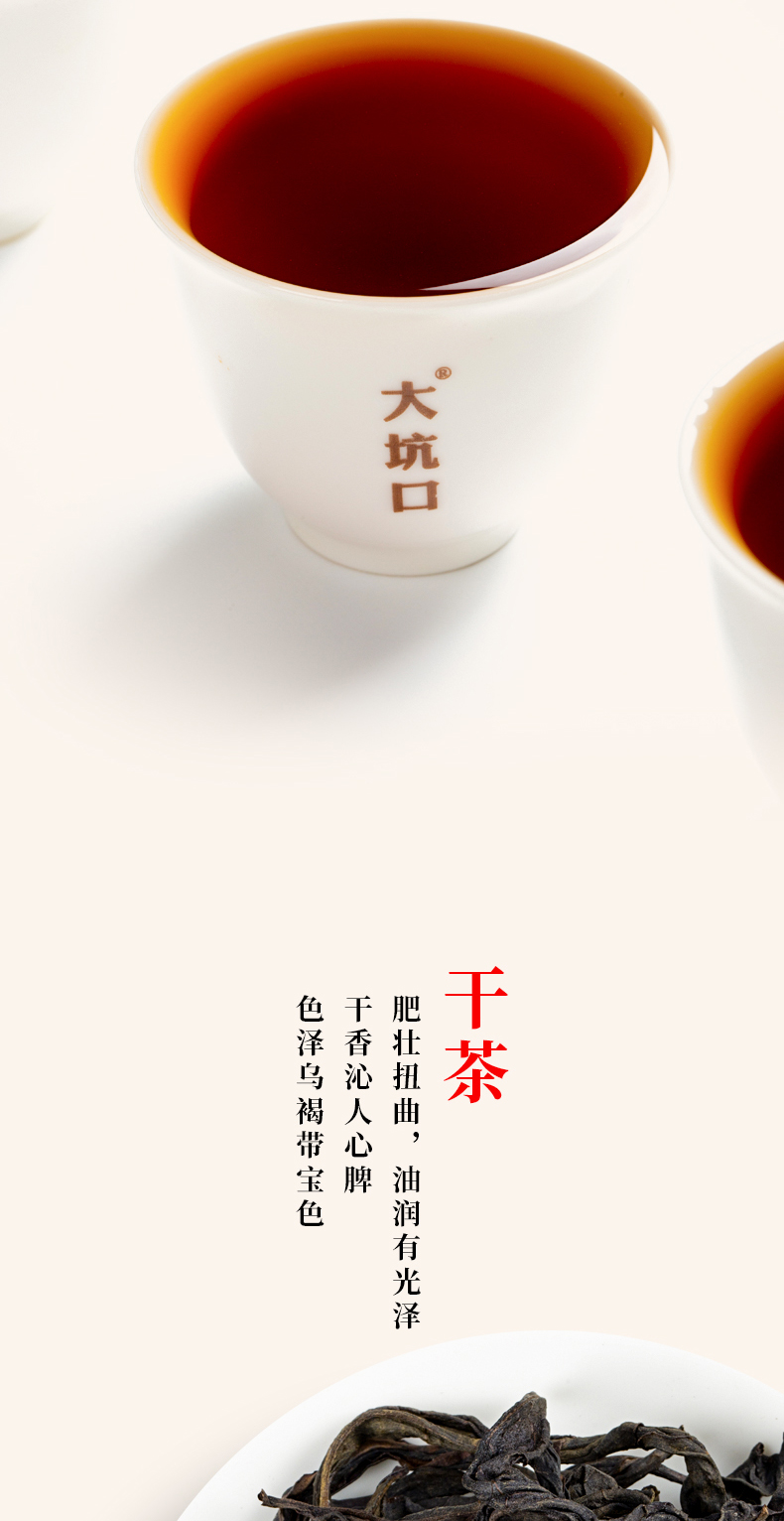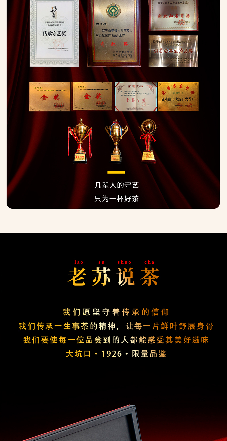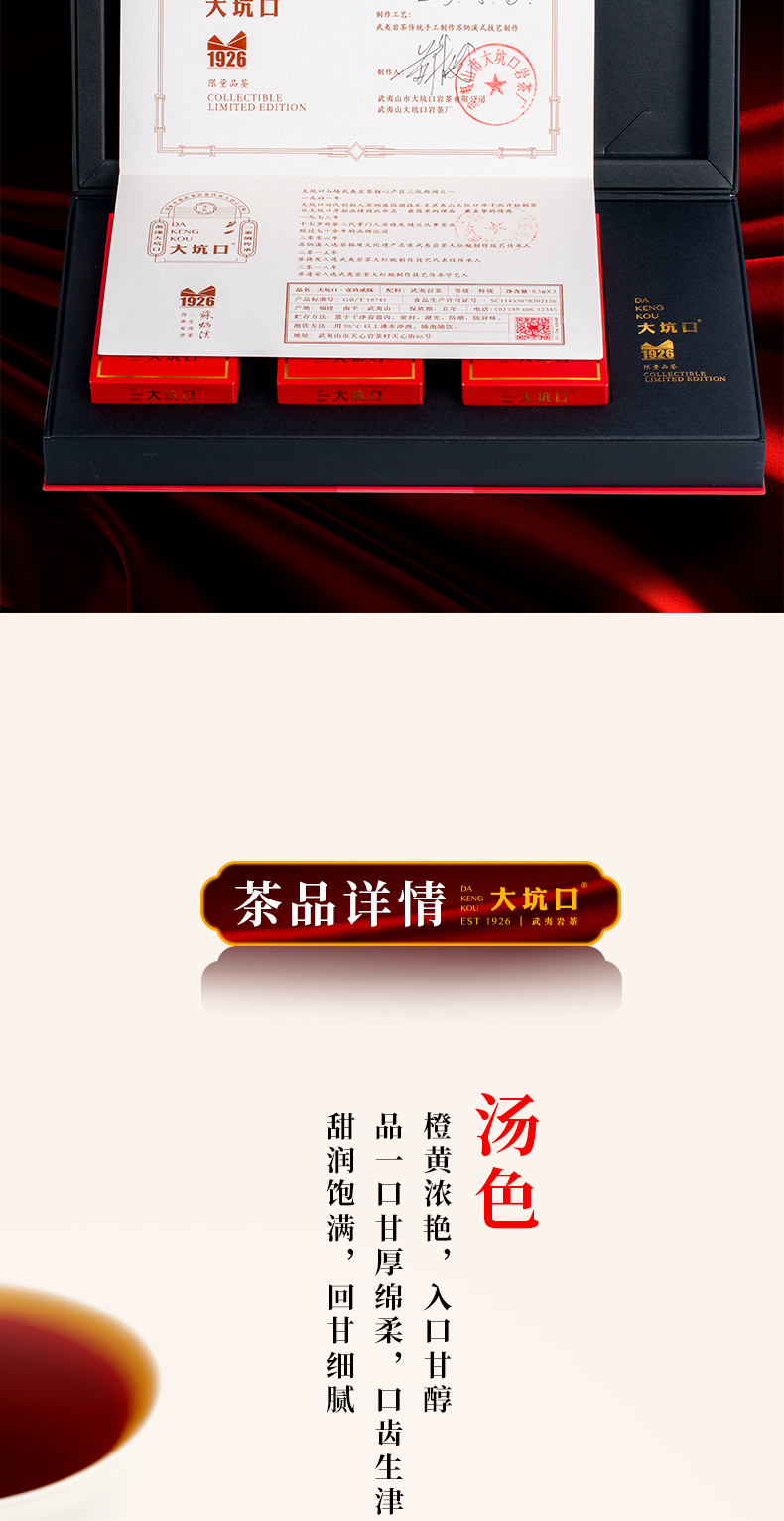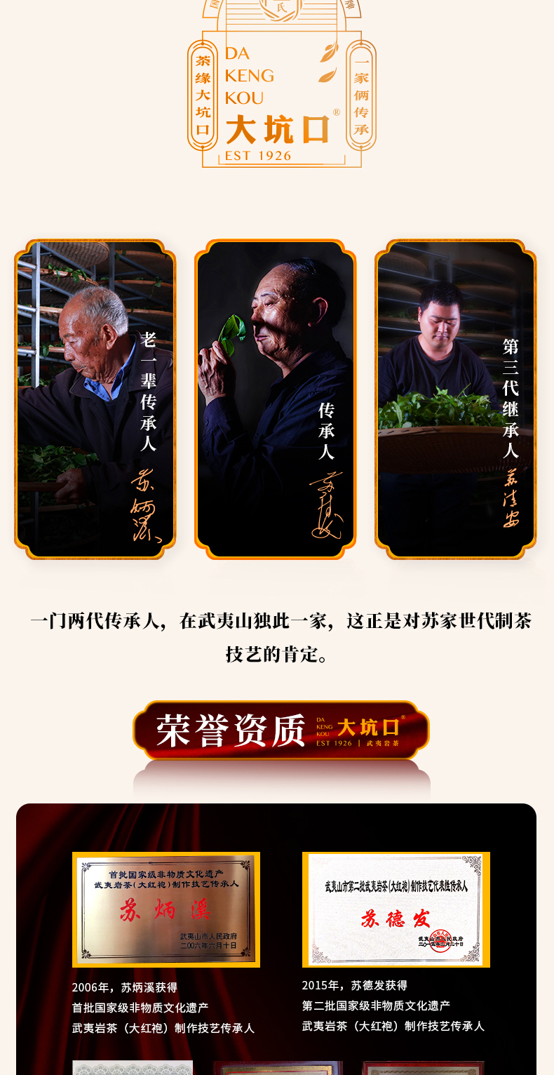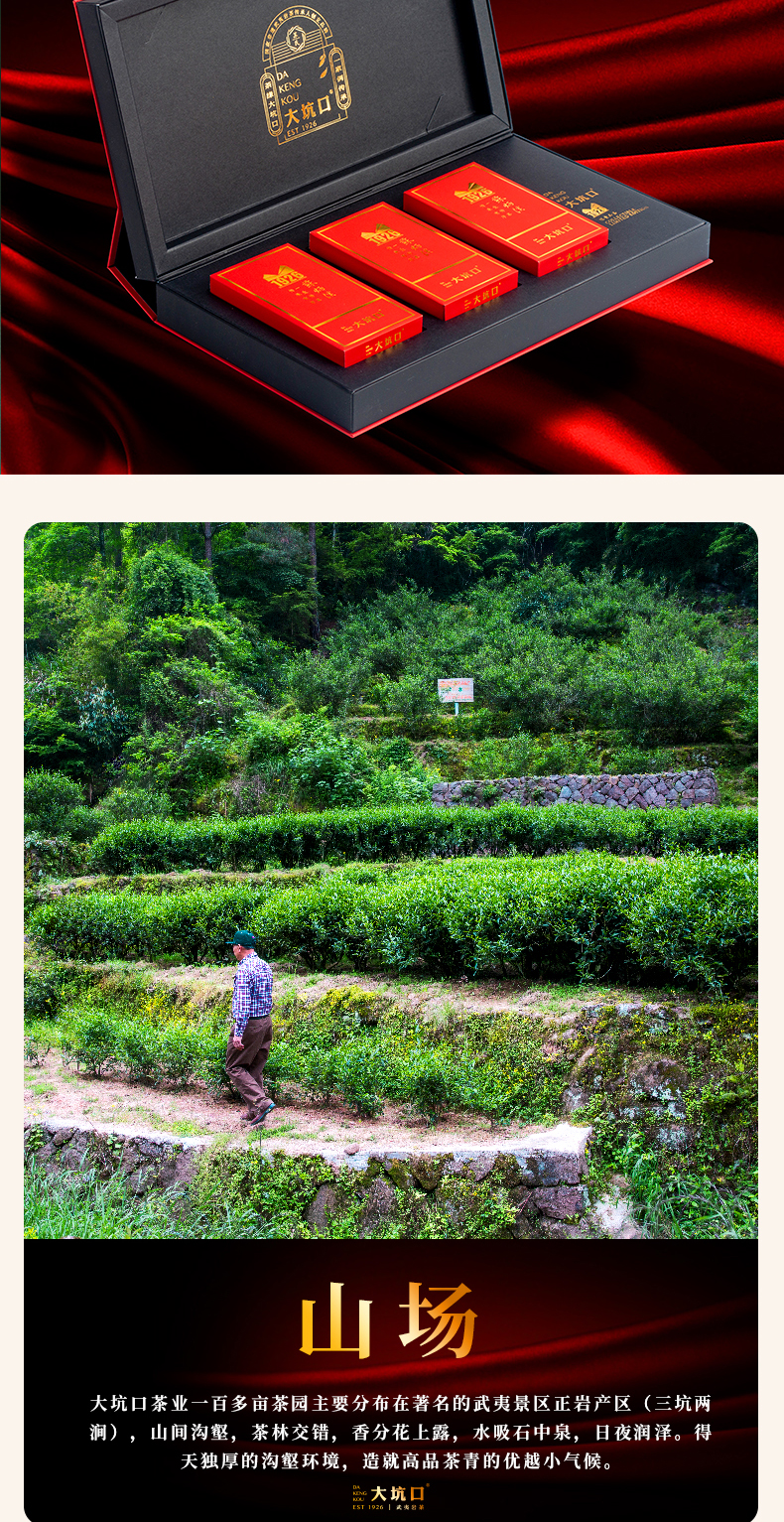 - 大坑口岩茶有限公司,位于武夷山市-天心村,茶山分布于正岩产区的“三坑、两涧”,由首批非物质文化遗产武夷岩茶制作技艺传承人:苏炳溪和第二批传承人:苏德发先生的精心手工制作,造就了大坑口岩茶的独特品质