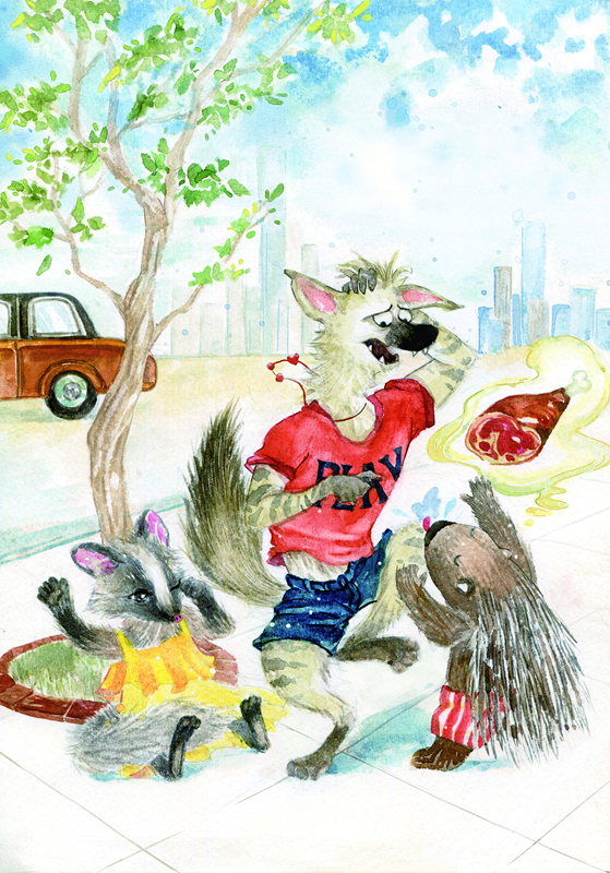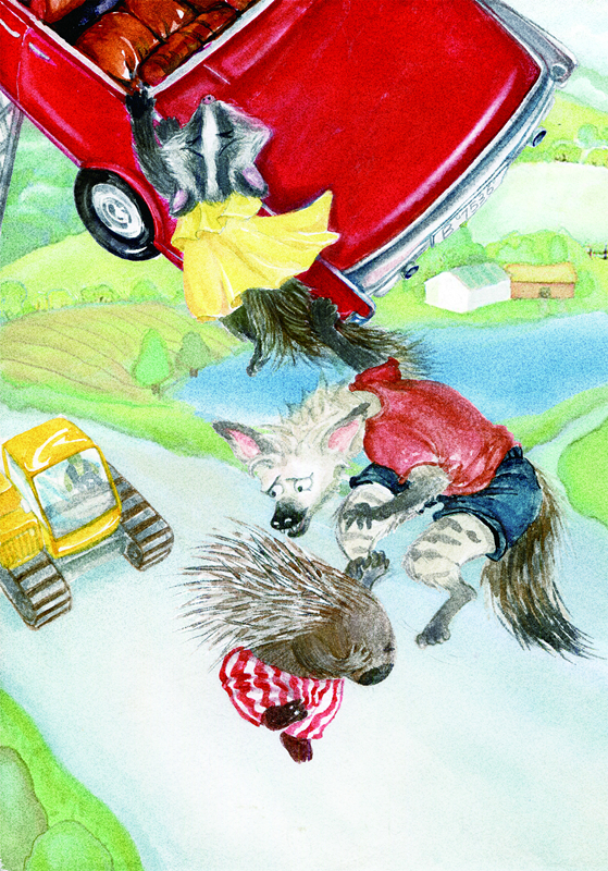他们不知从哪儿弄来一辆轰轰作响的敞篷车。豪猪呼尔当司机,左边坐着的土狼呃尔手里拿着牙签,有事没事剔剔牙;右边坐着的果子狸菲尔一手拿镜子,一手拿口红,把自己打扮得像个妖精。
