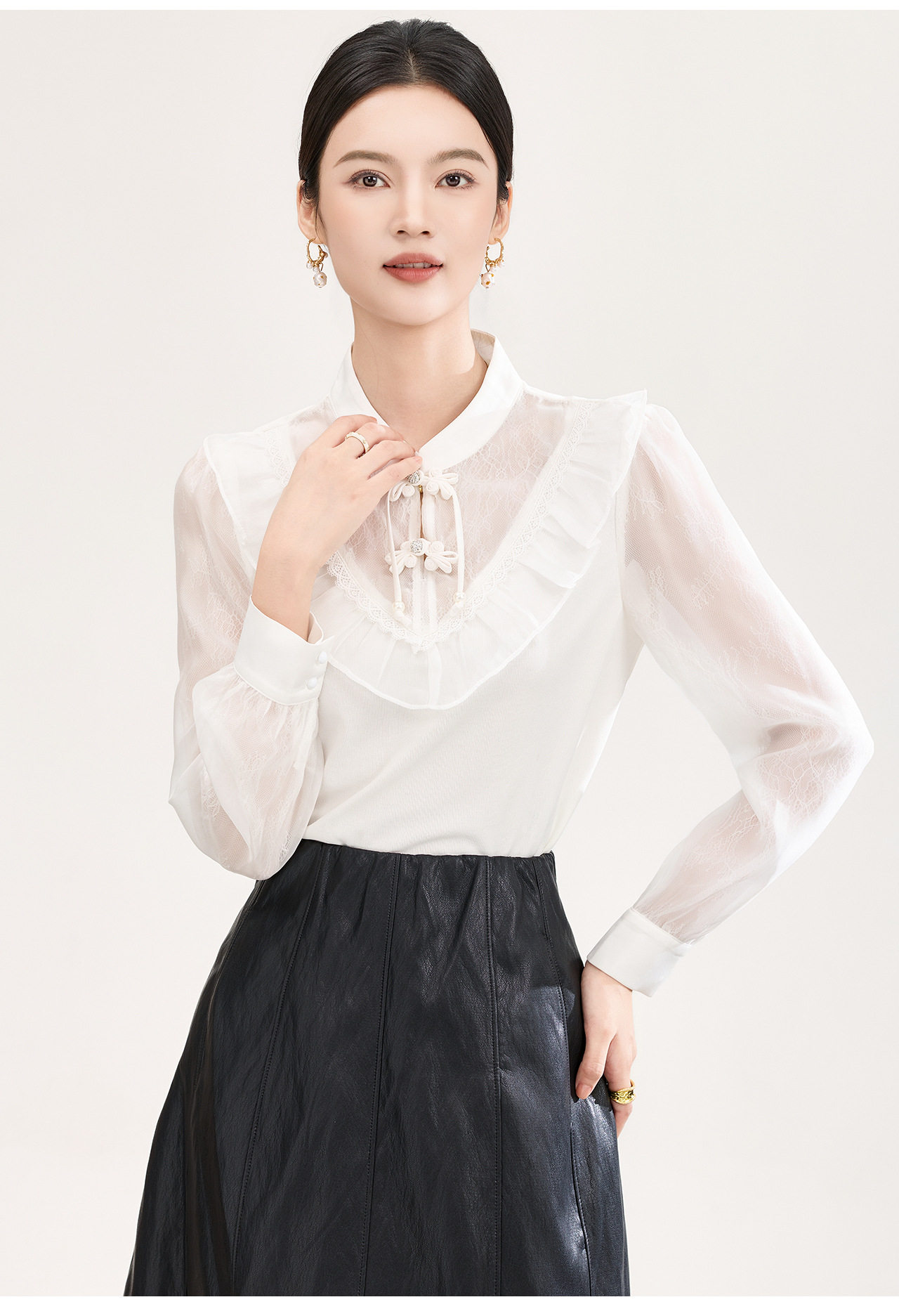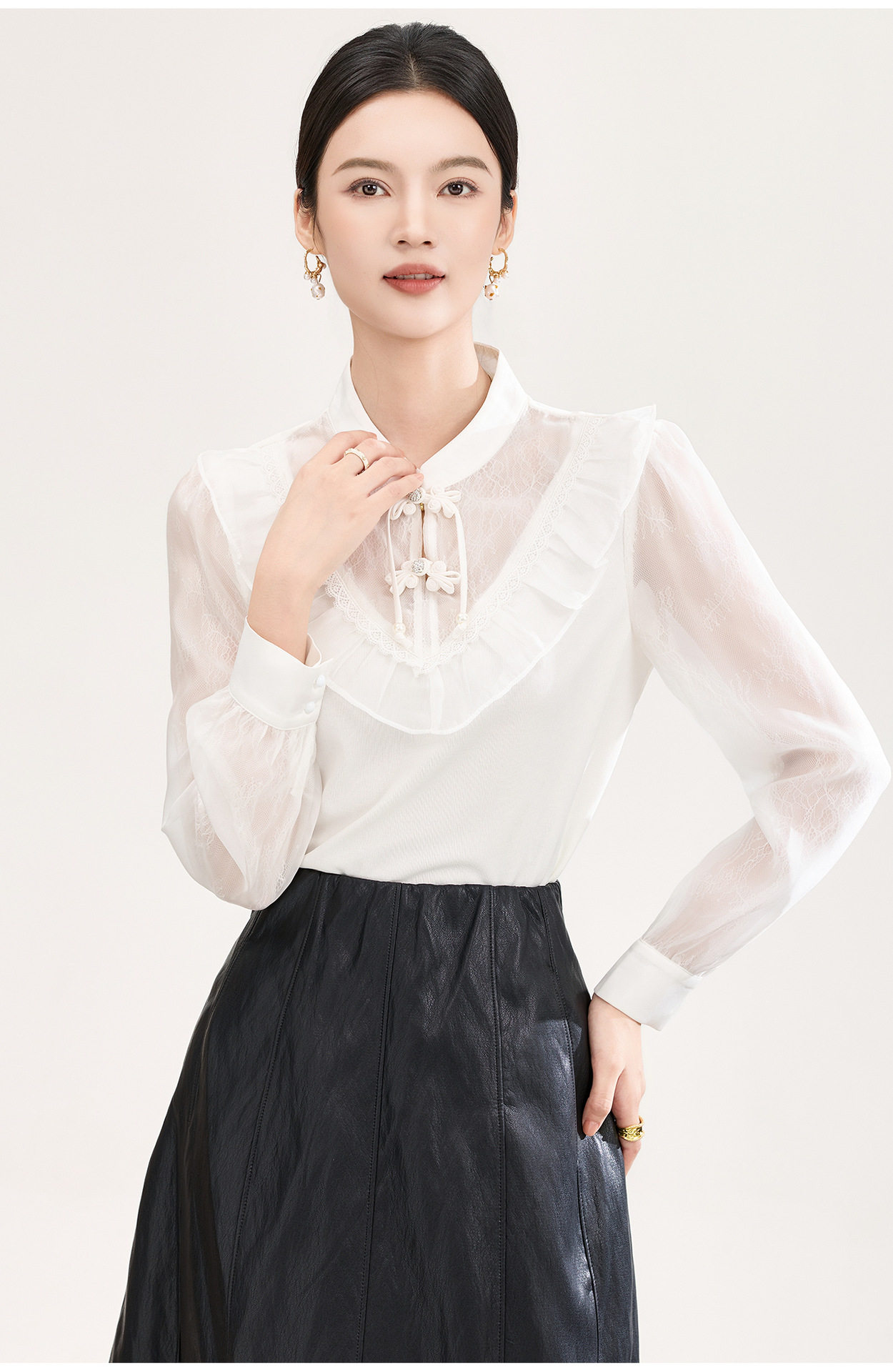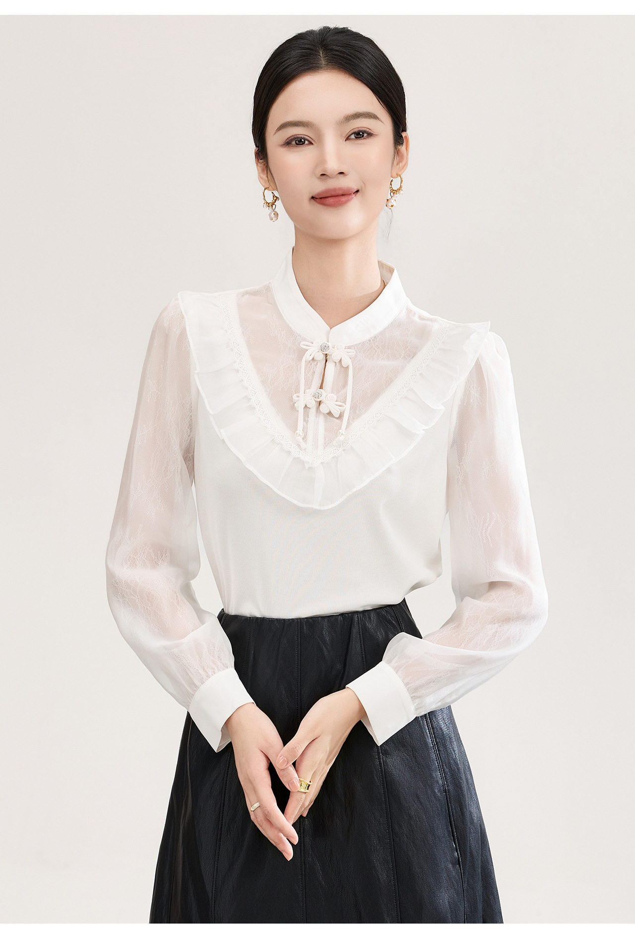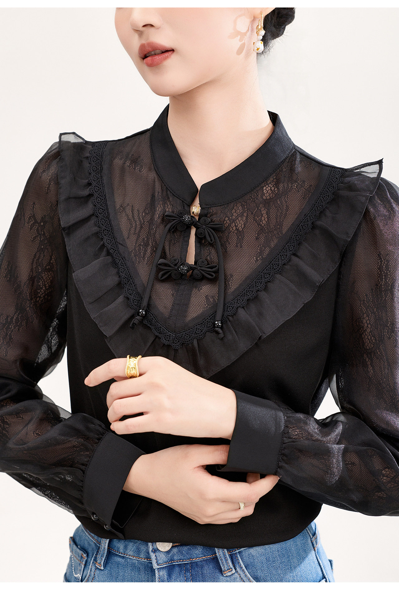 「高货wl」全新升级【铂金会员257/天猫339/差价82】(01955)洛诗琳国风蕾丝拼接上衣2026春季新款珍珠盘扣旗袍式衬衫