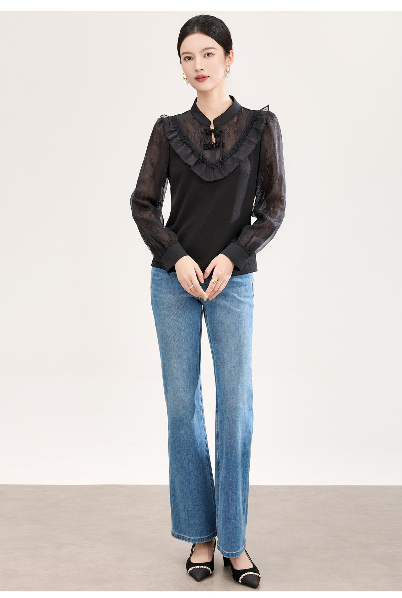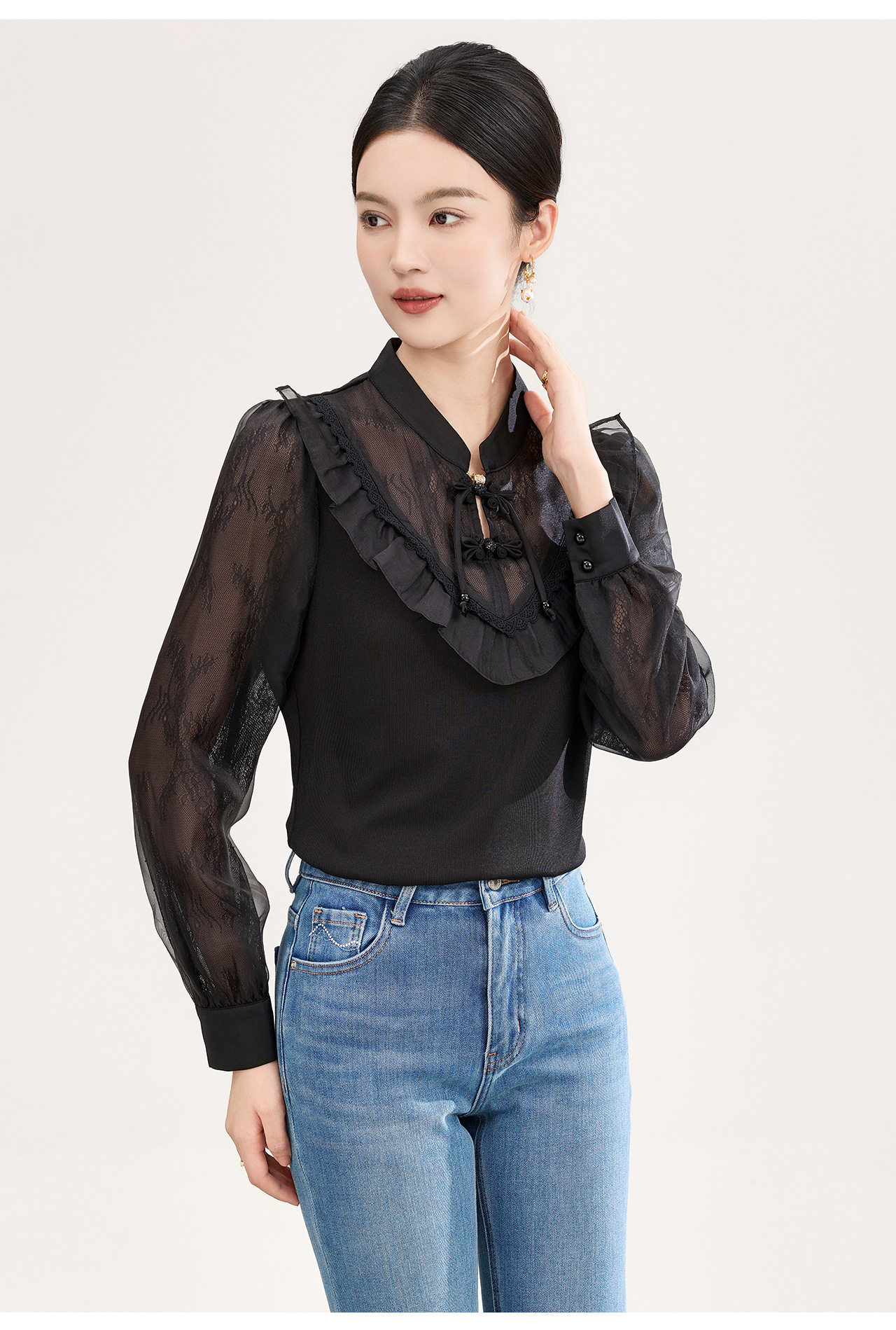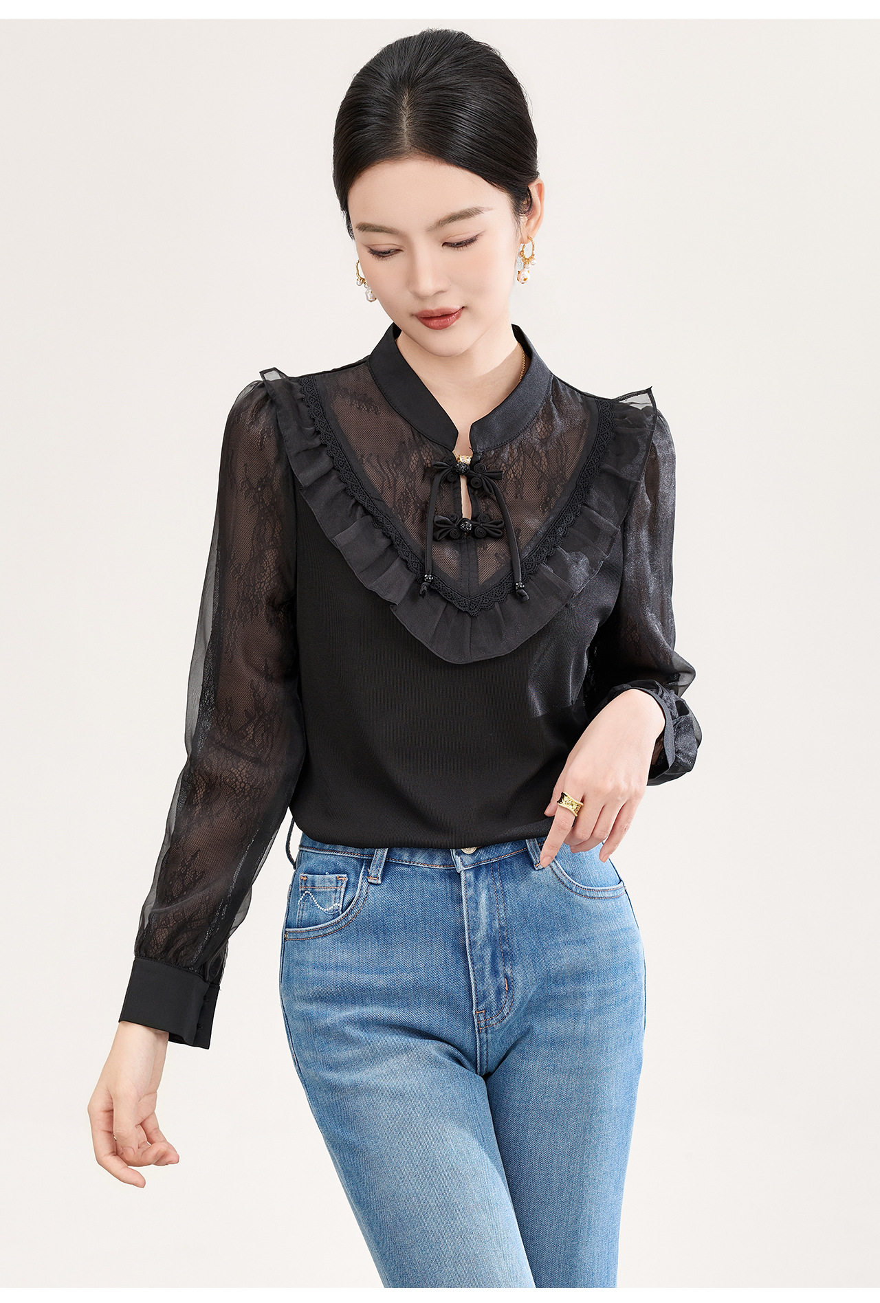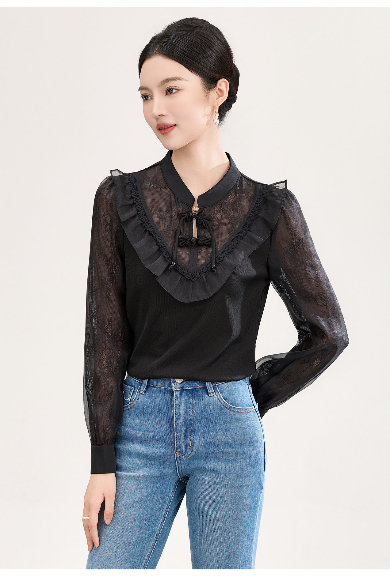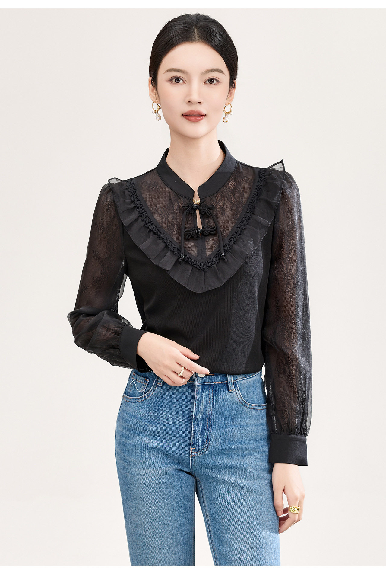 「高货wl」全新升级【铂金会员257/天猫339/差价82】(01955)洛诗琳国风蕾丝拼接上衣2026春季新款珍珠盘扣旗袍式衬衫