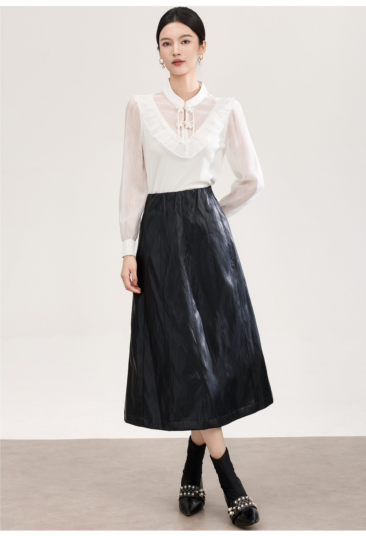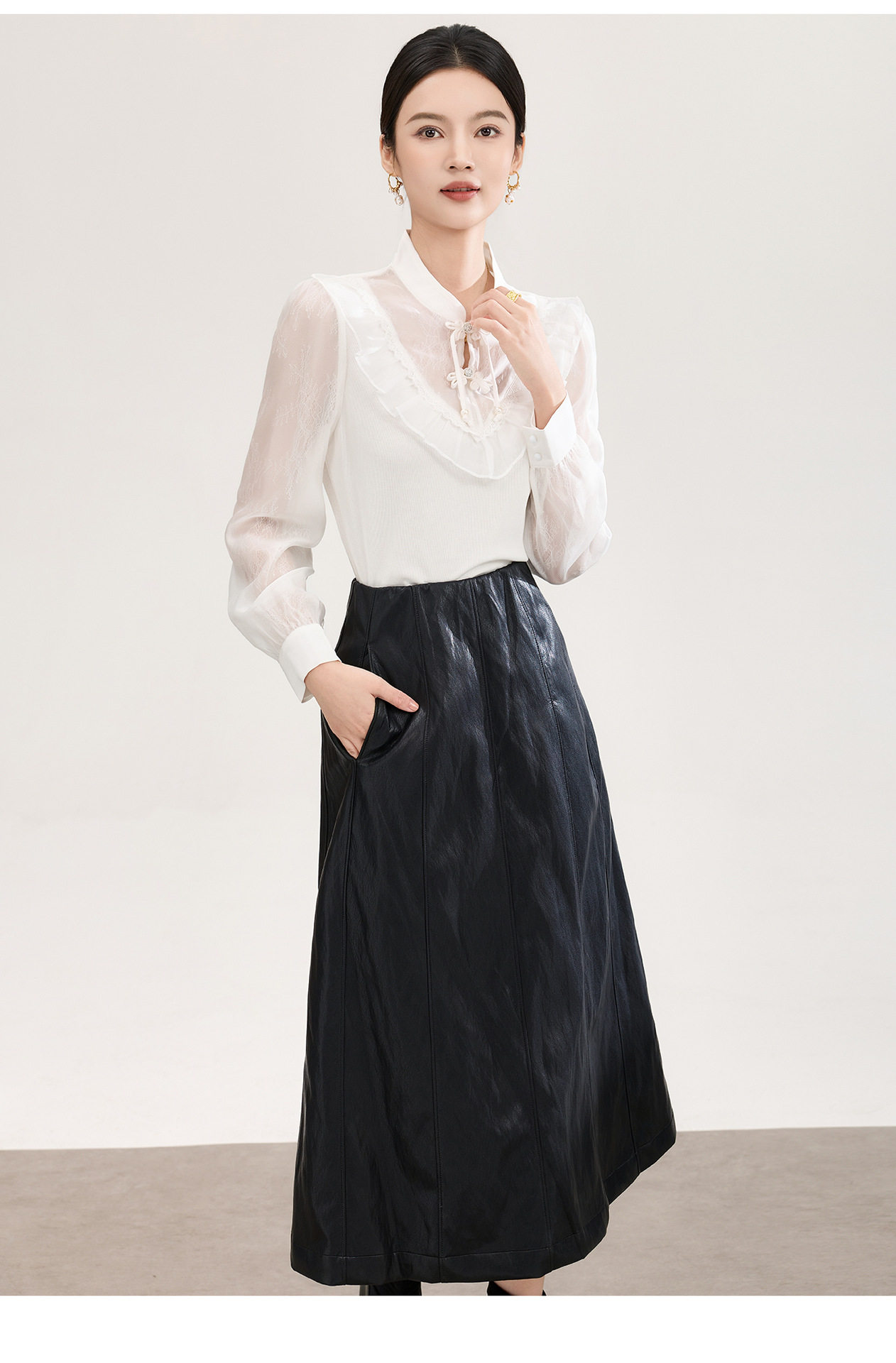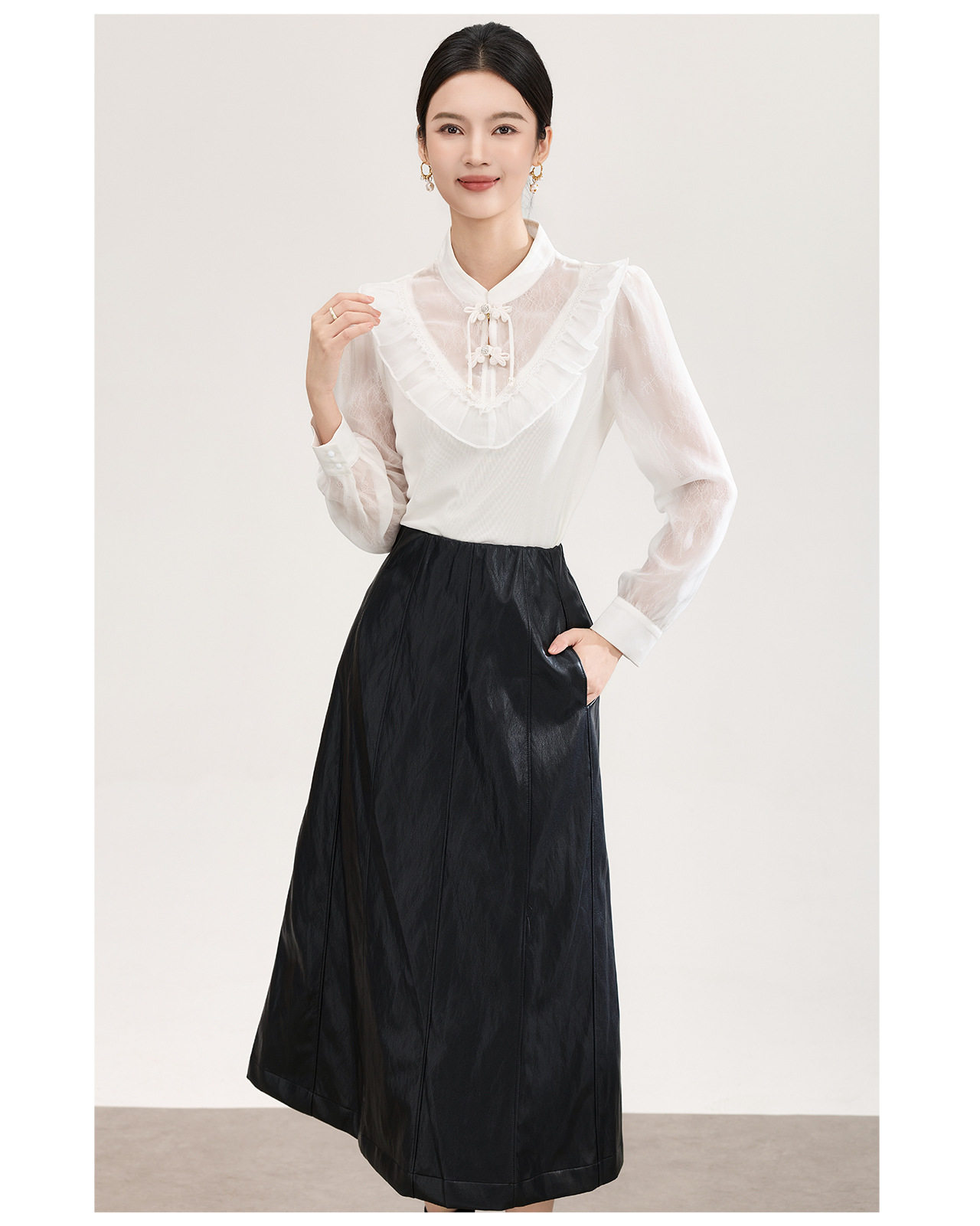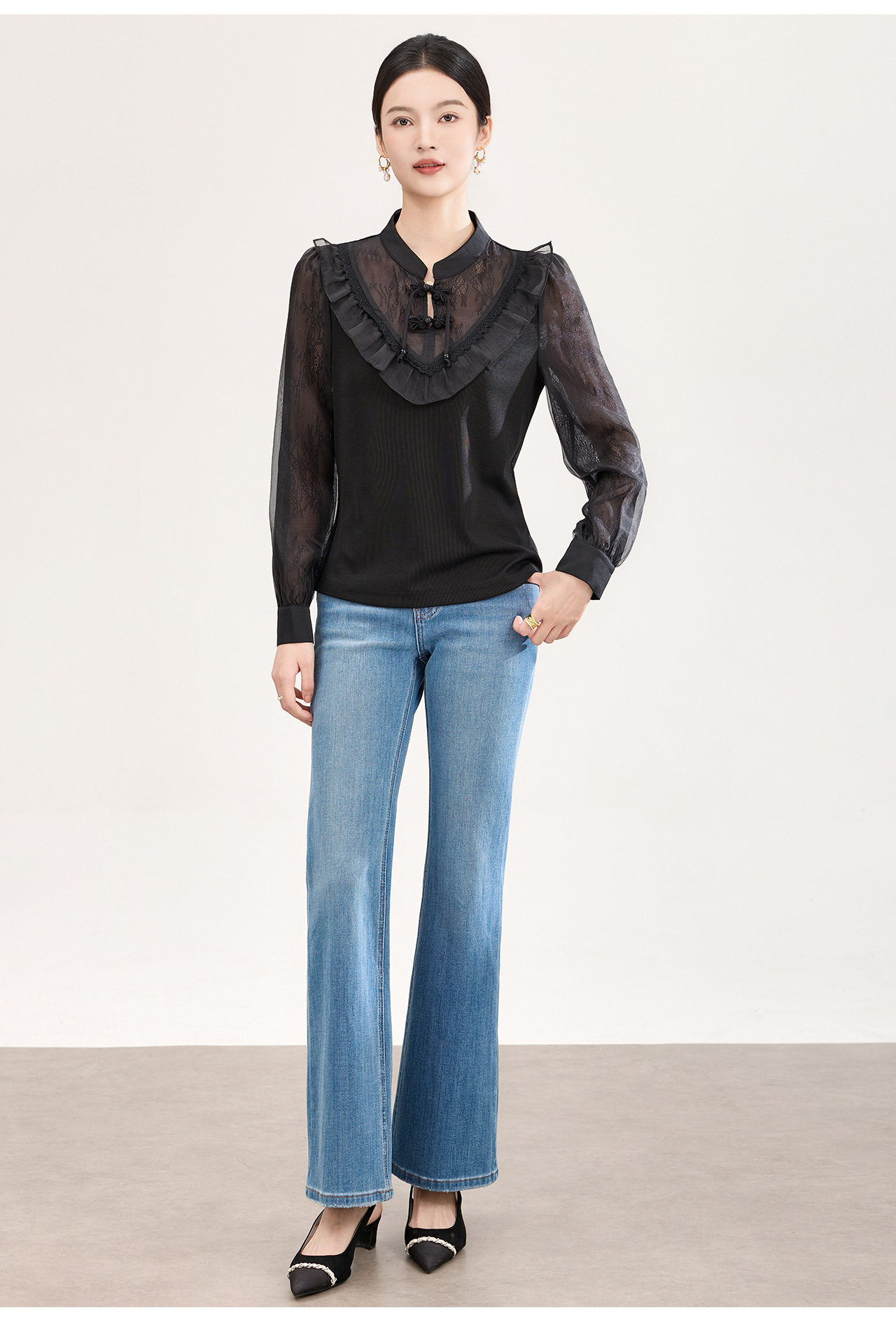 「高货wl」全新升级【铂金会员257/天猫339/差价82】(01955)洛诗琳国风蕾丝拼接上衣2026春季新款珍珠盘扣旗袍式衬衫