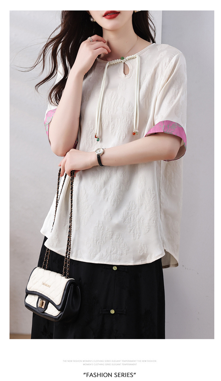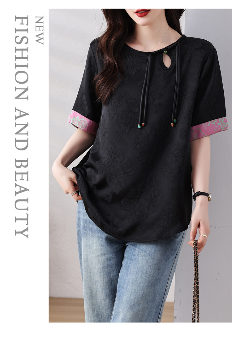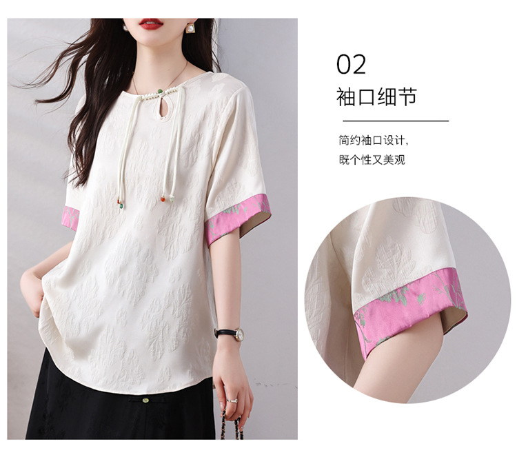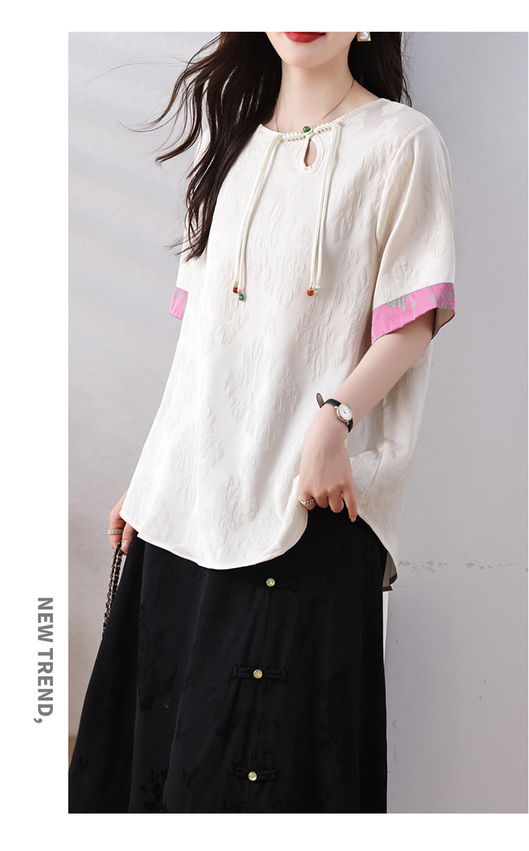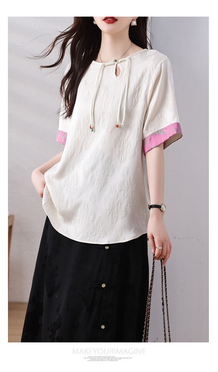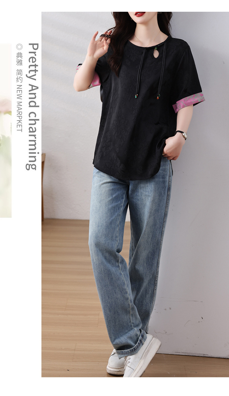 雀说新中式盘扣圆领提花拼接短袖T恤女简约百搭宽松显瘦小衫AL7129