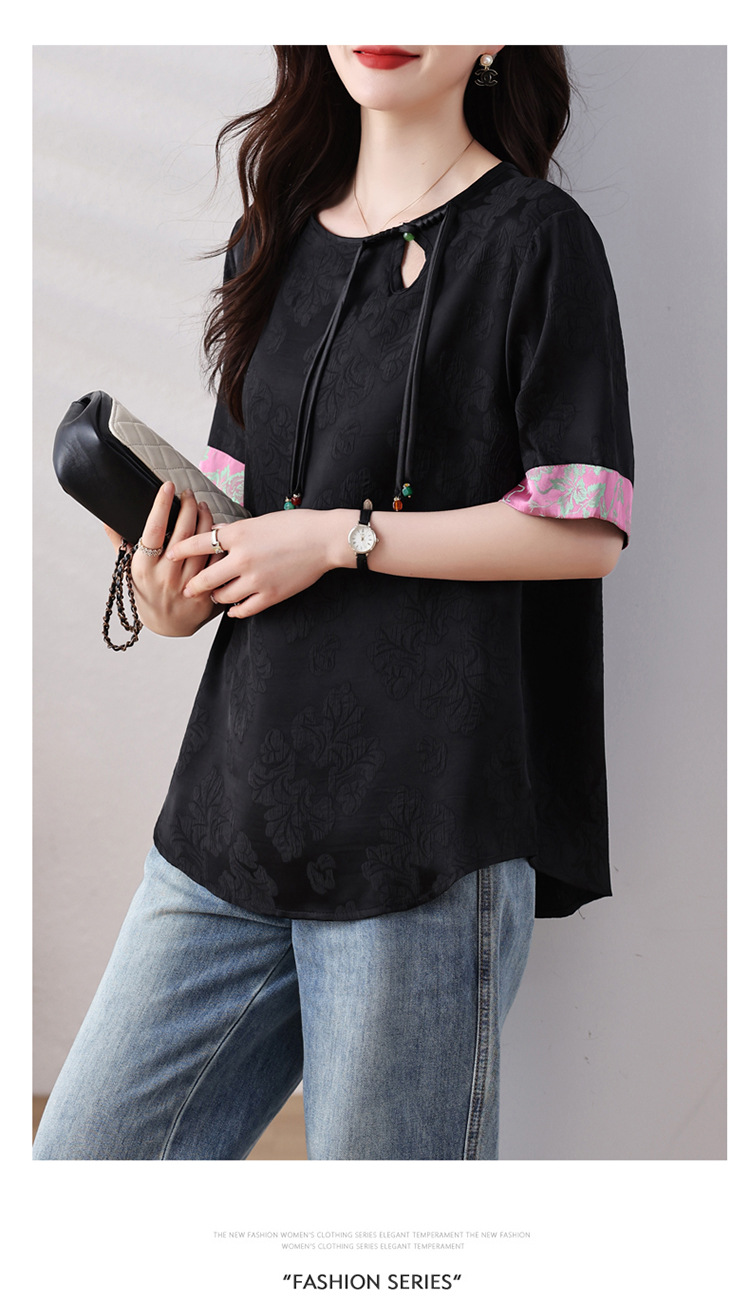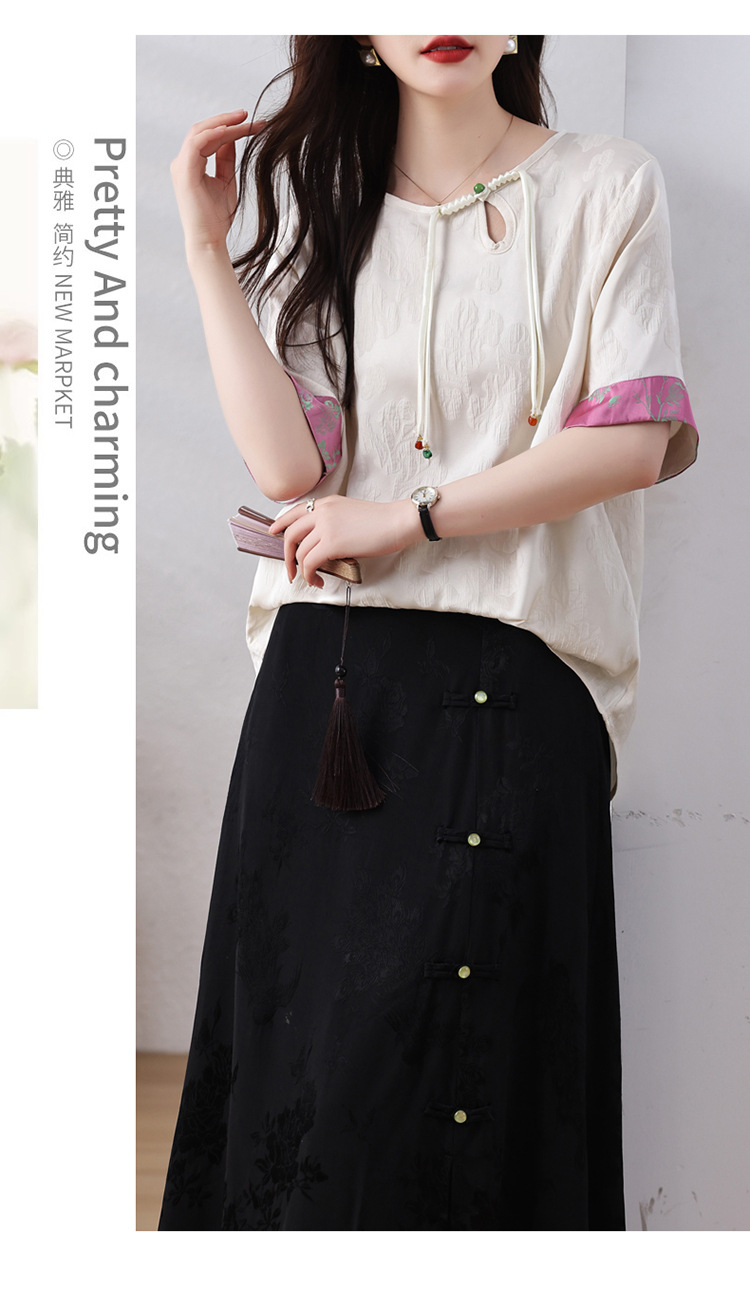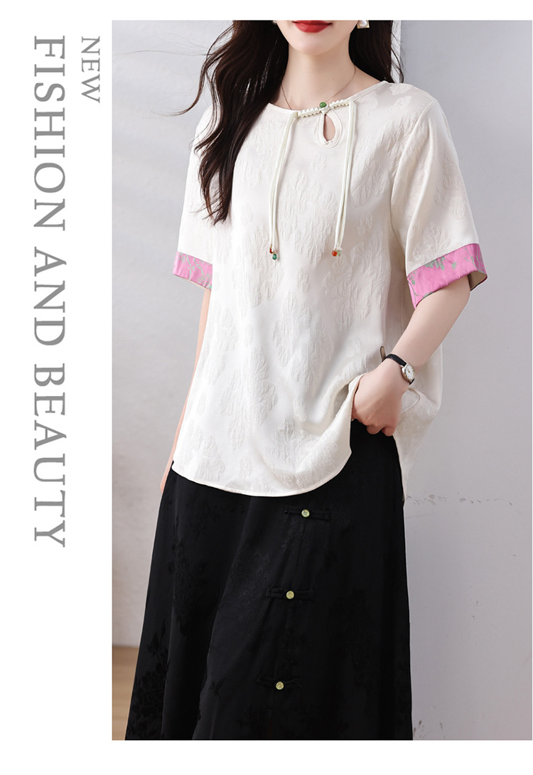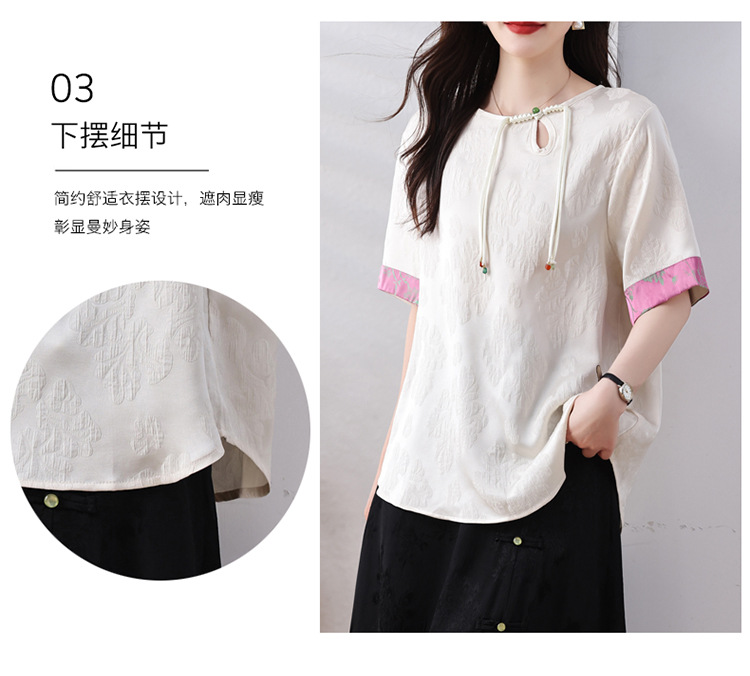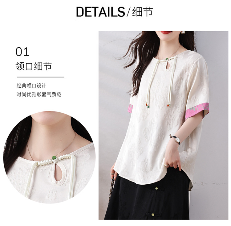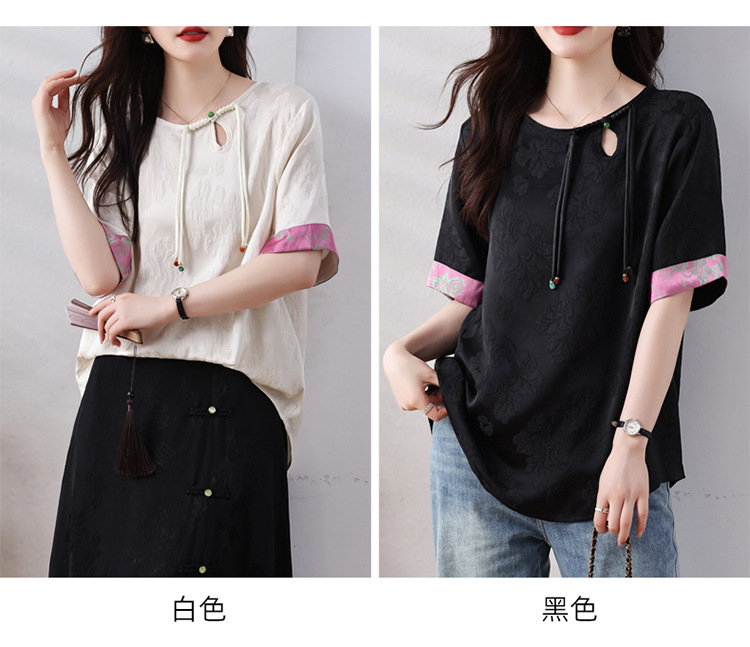 雀说新中式盘扣圆领提花拼接短袖T恤女简约百搭宽松显瘦小衫AL7129