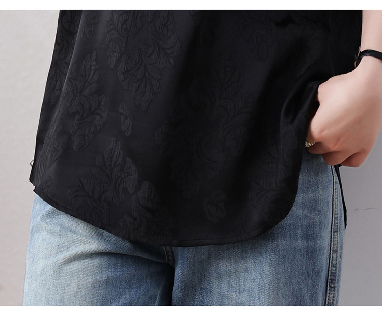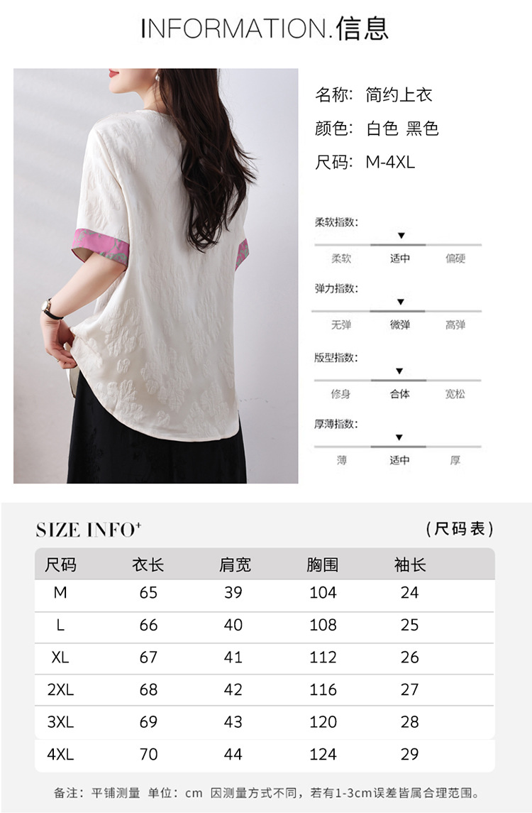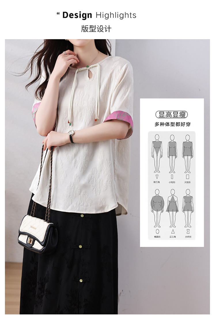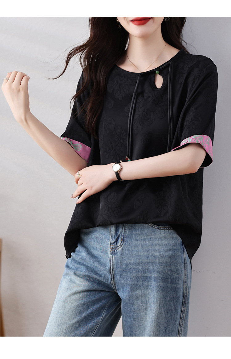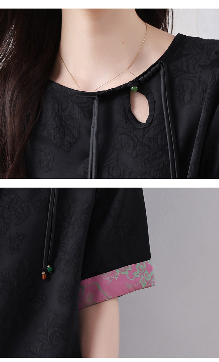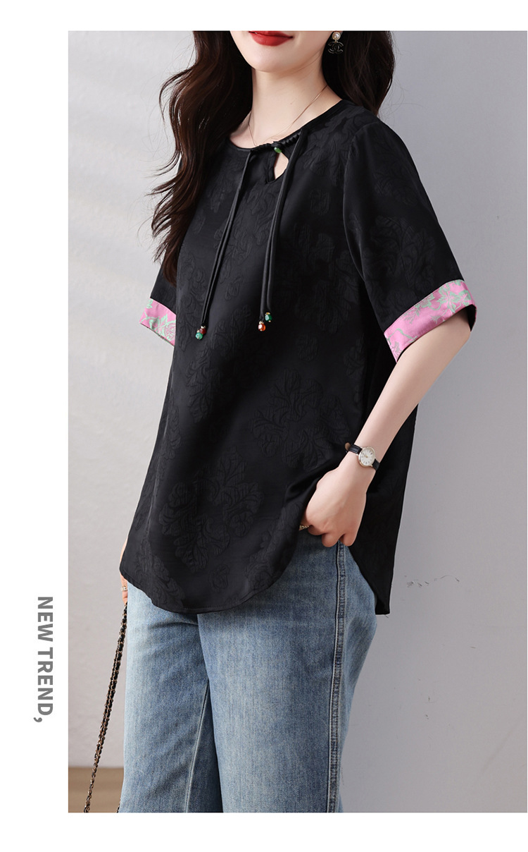 雀说新中式盘扣圆领提花拼接短袖T恤女简约百搭宽松显瘦小衫AL7129