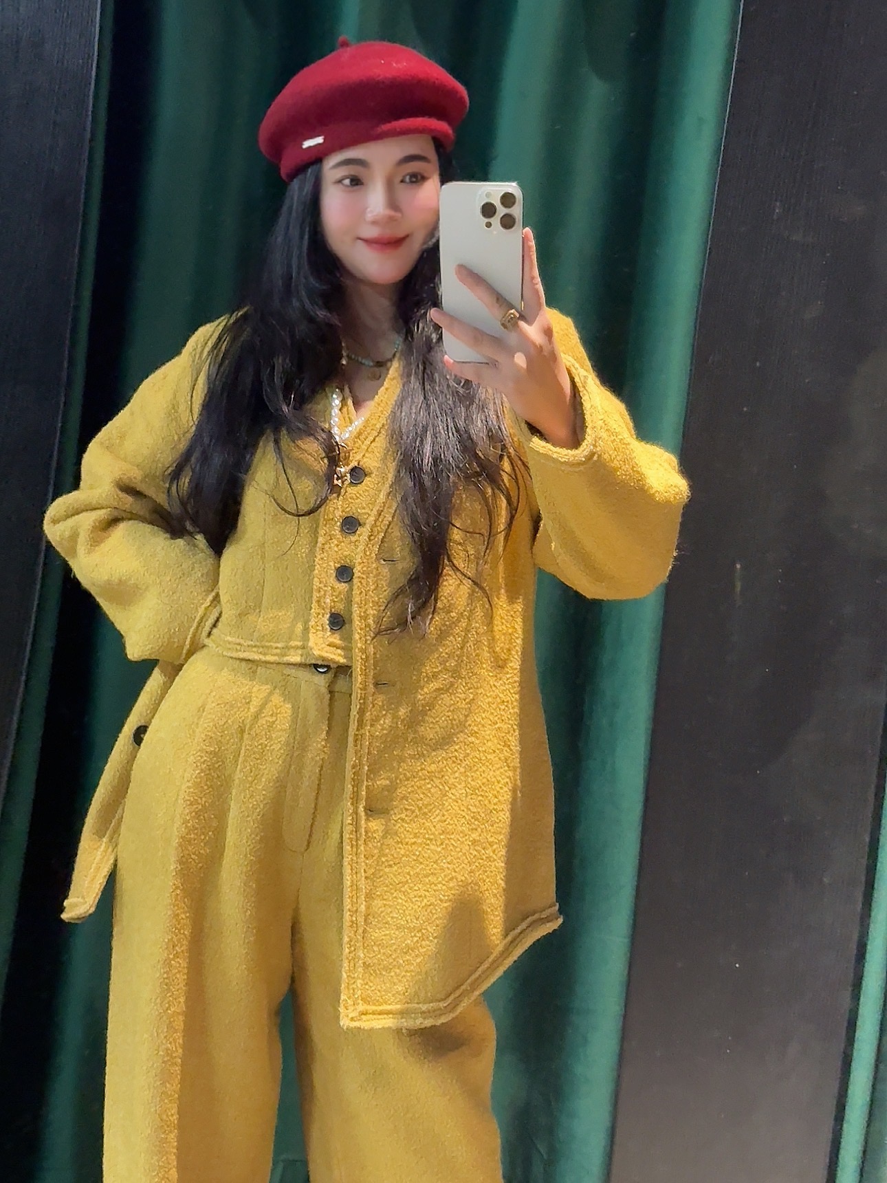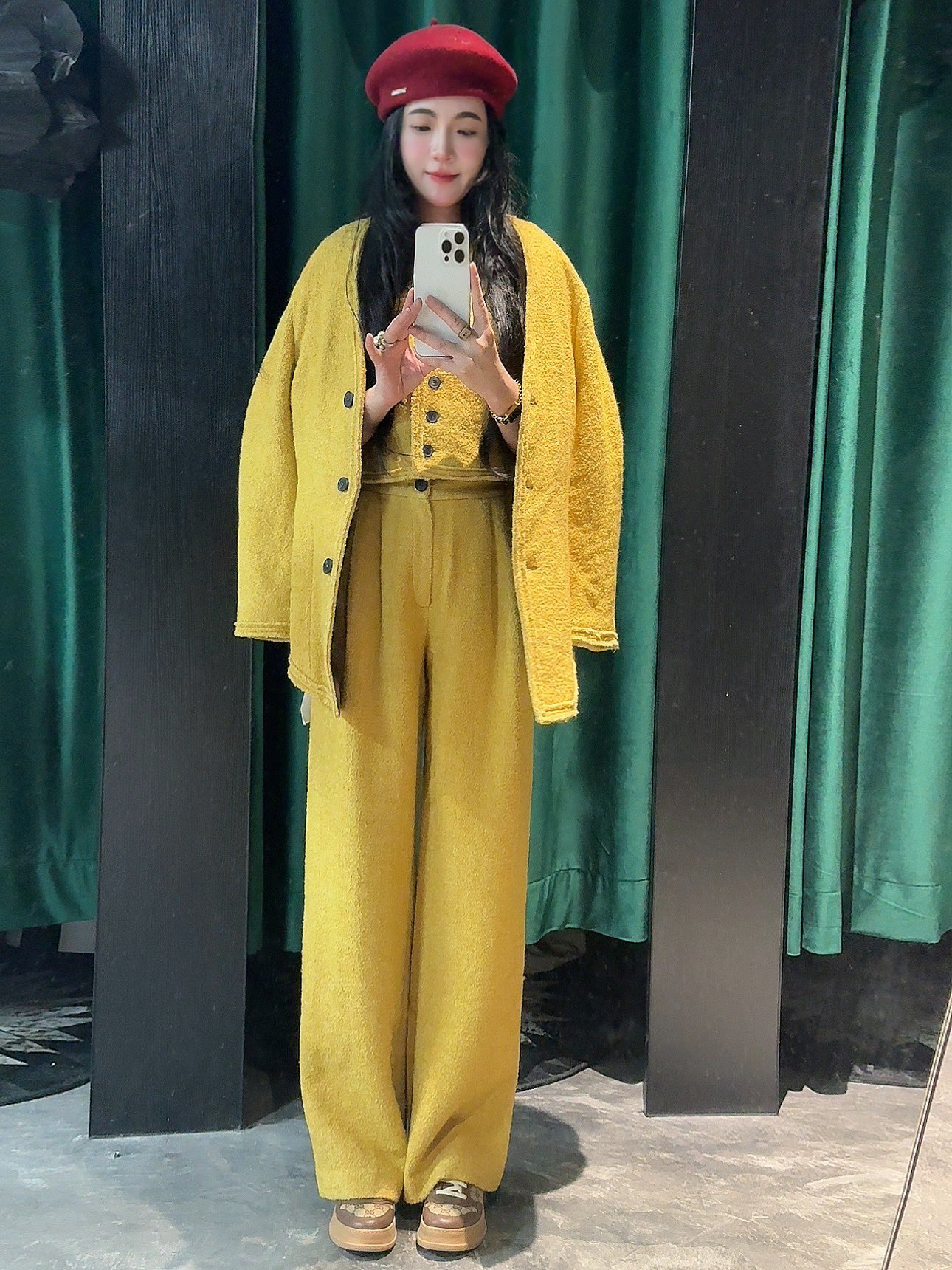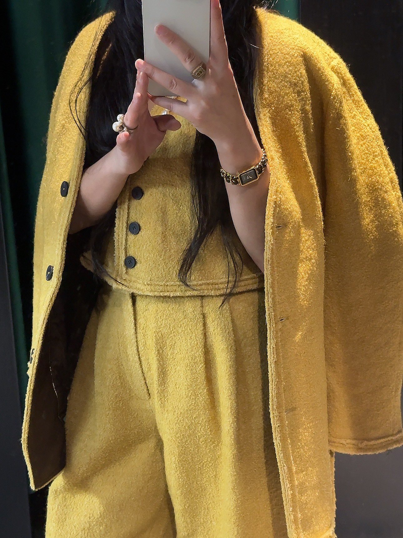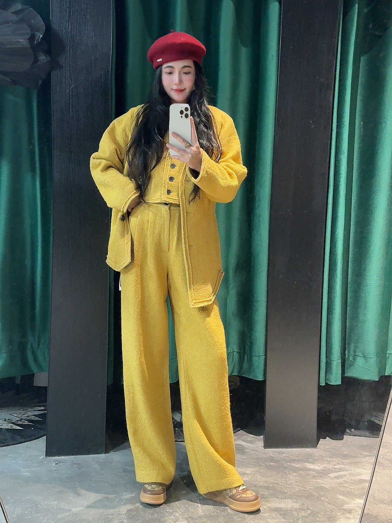 秋冬必不可少的当然是这套暖暖的黄色套装,上衣是简洁大方的西装剪裁 宽松挺阔的版型 上身气场⑩足