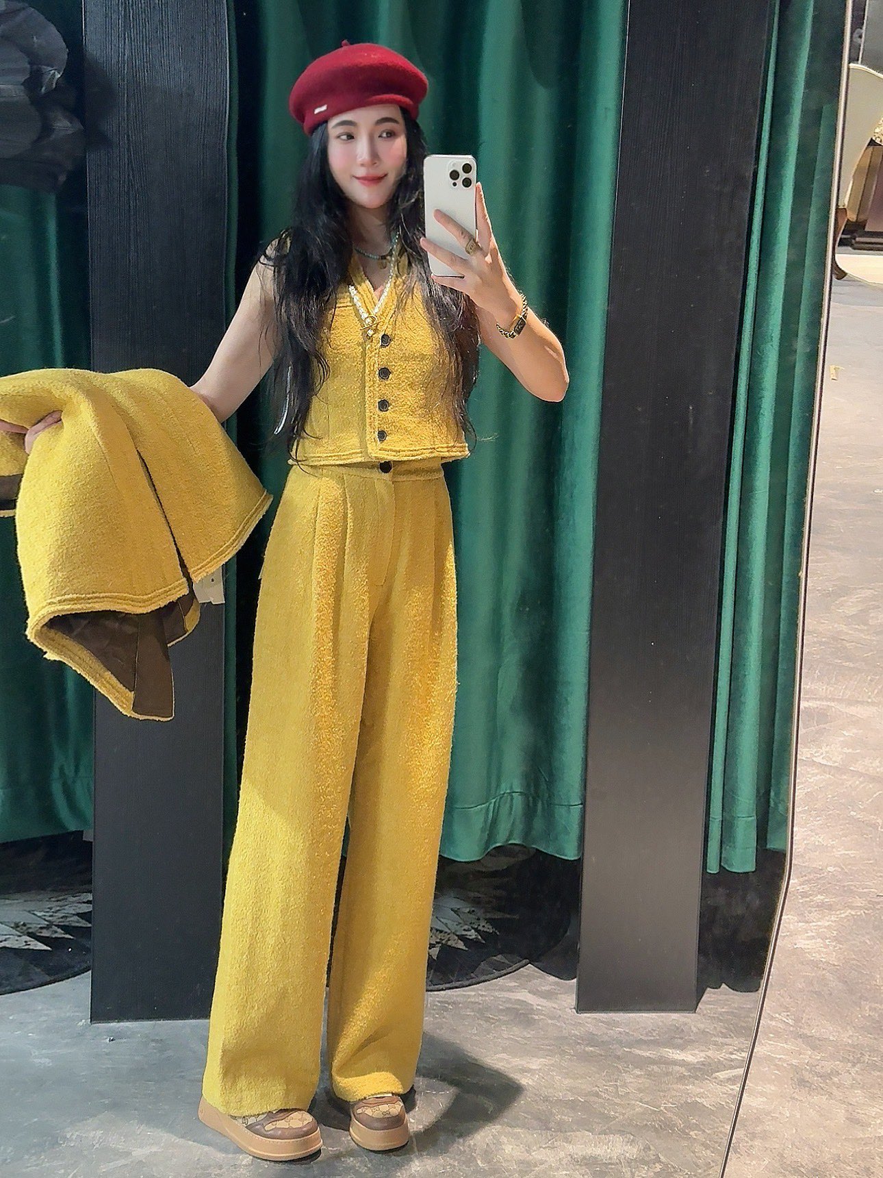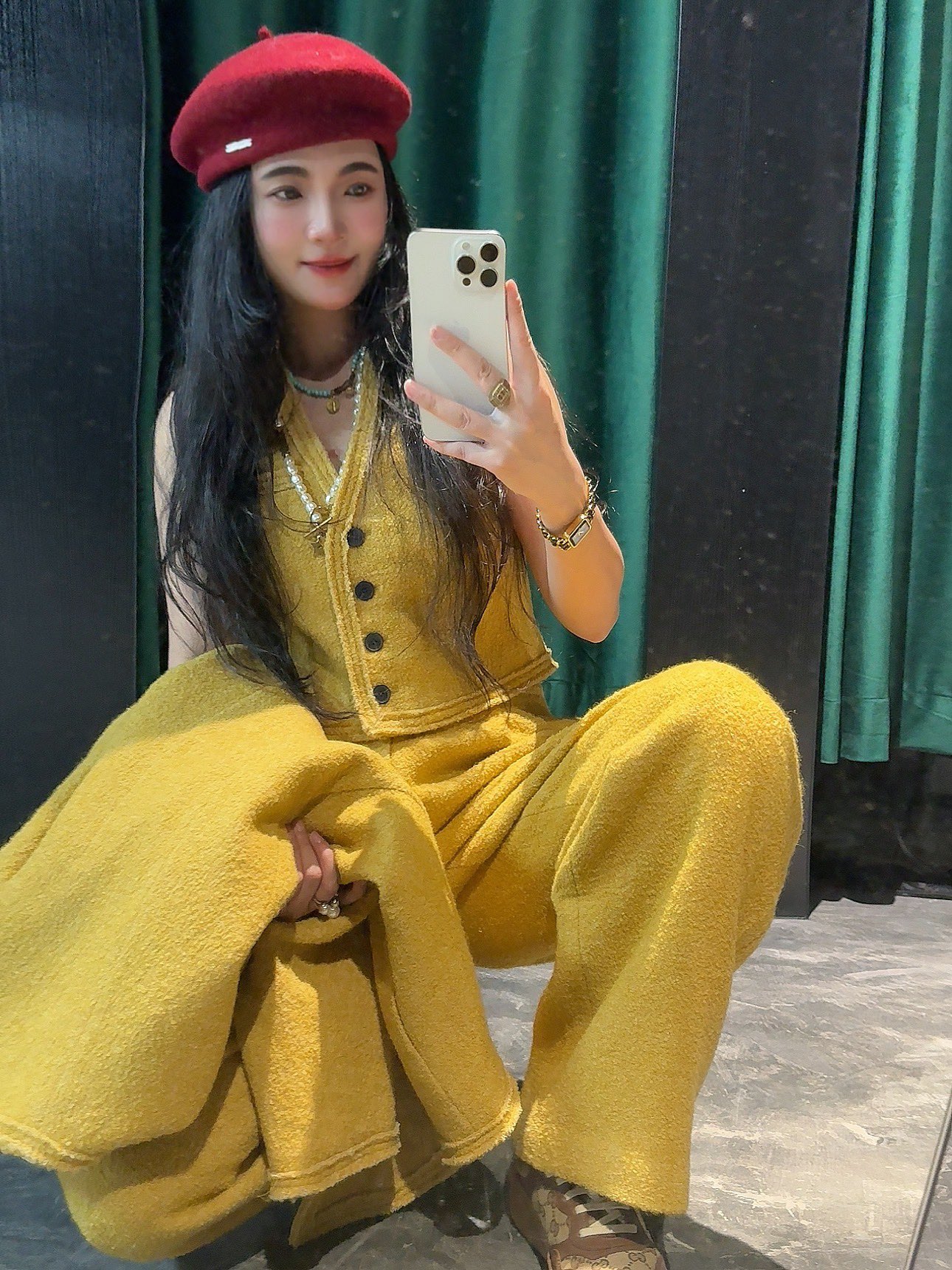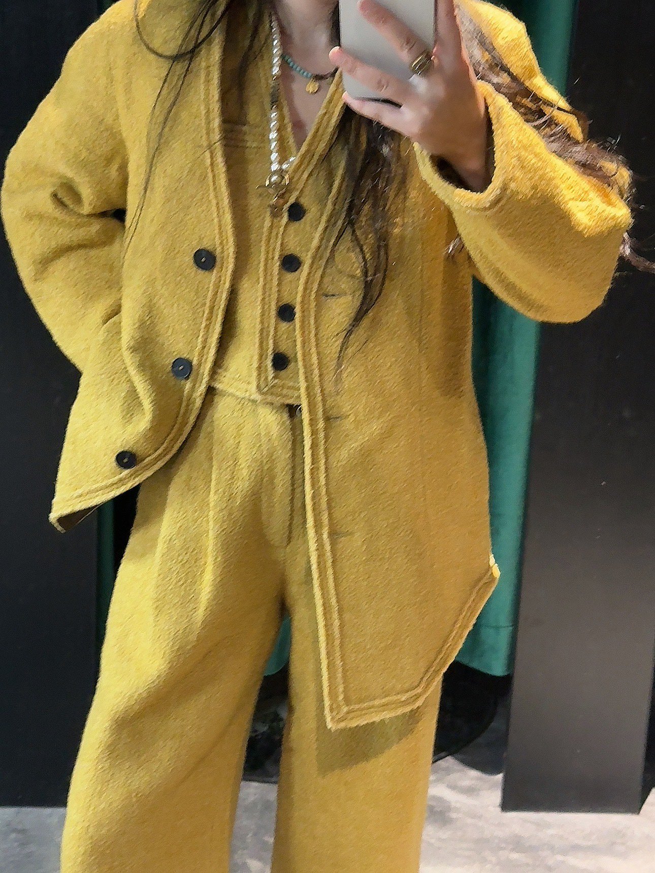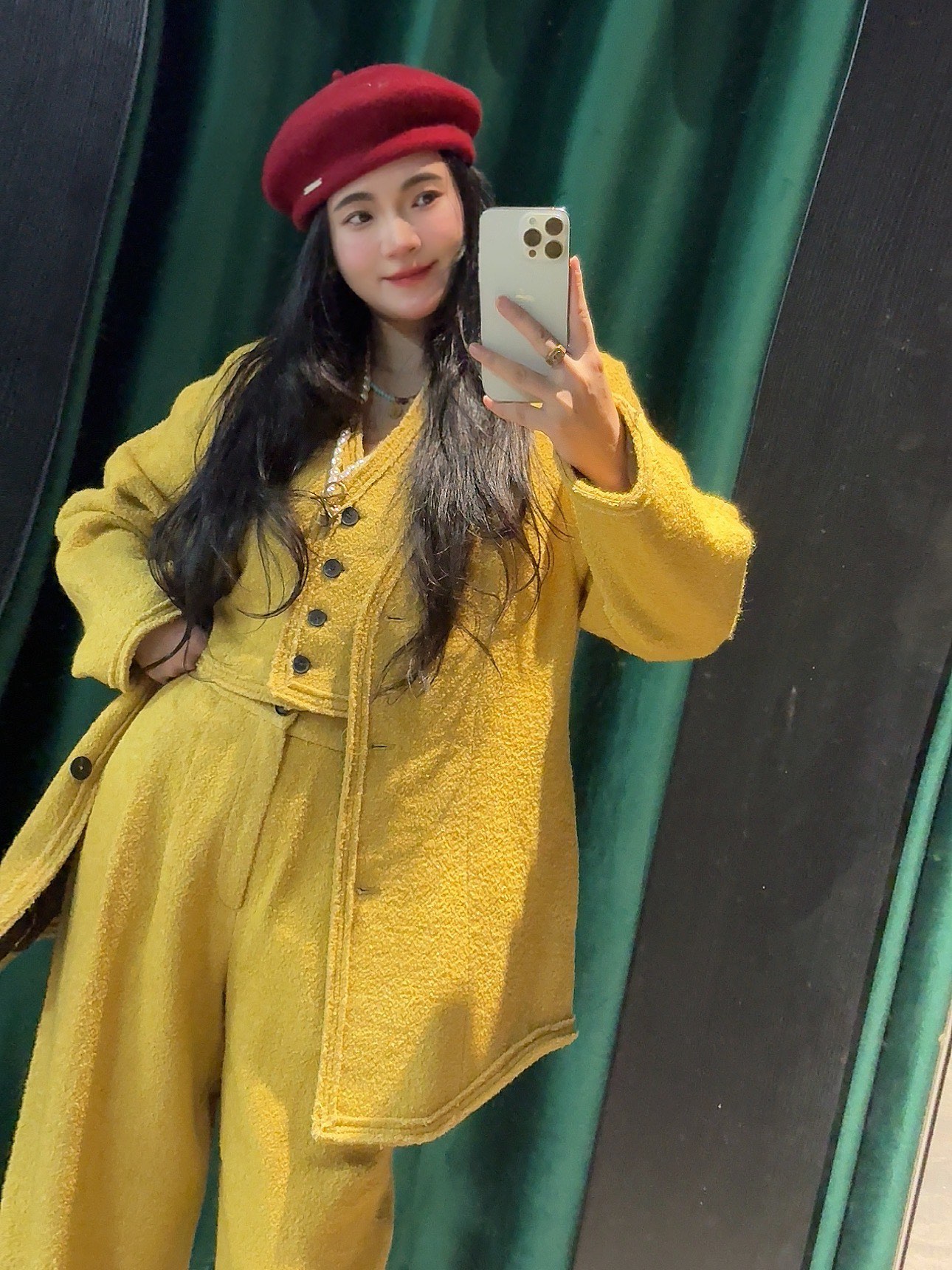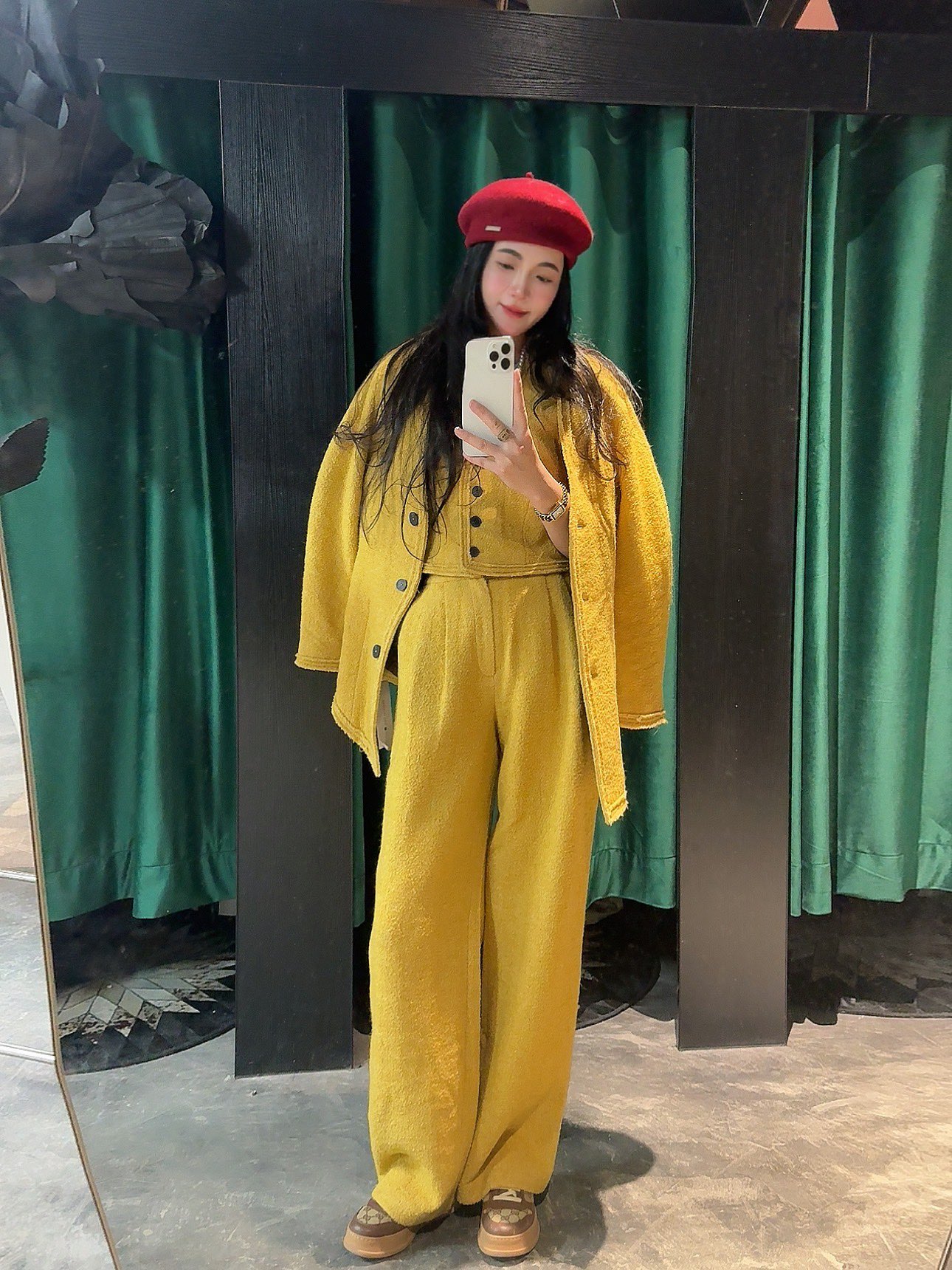 秋冬必不可少的当然是这套暖暖的黄色套装,上衣是简洁大方的西装剪裁 宽松挺阔的版型 上身气场⑩足